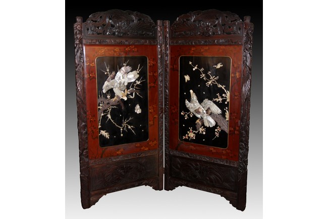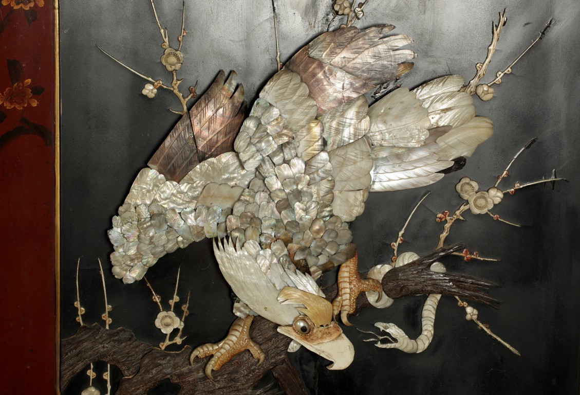 19th C. The large floor screen is composed of two separate floor screens linked in the center. The floor screen depicts two eagles, one on the branch staring down with a snake nearby, and the other on a lower branch staring up towards a bird. The scenes were created with mother of pearl, bone, wood, and other materials. The frames were low relief carved, with flowers, phoenix, and plants patterns.