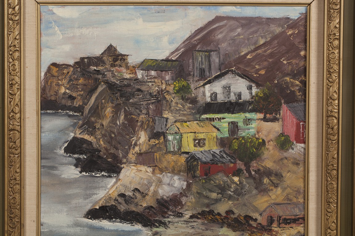 AN OIL ON CANVAS 'SEA CLIFFS' PAINTING 海邊城市風景油畫
