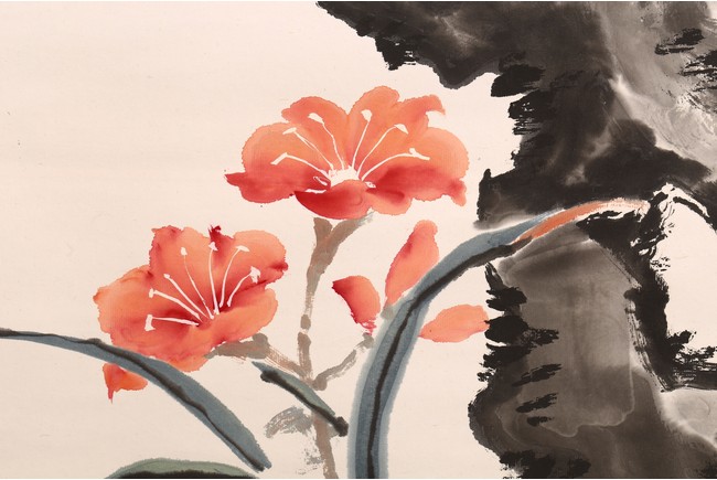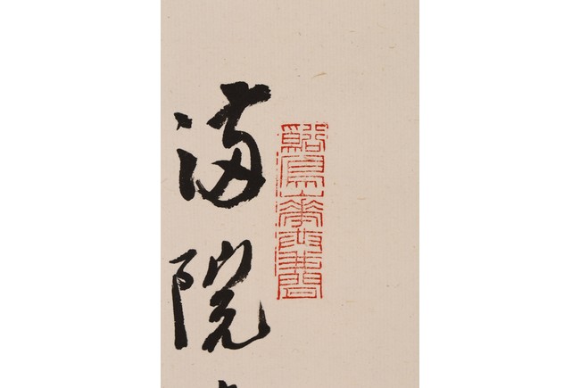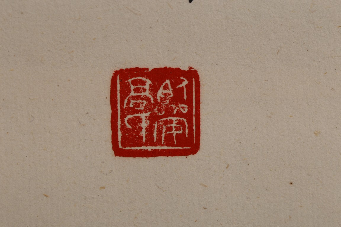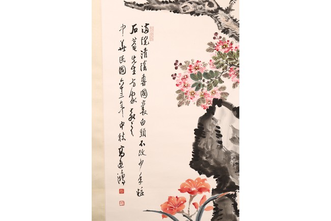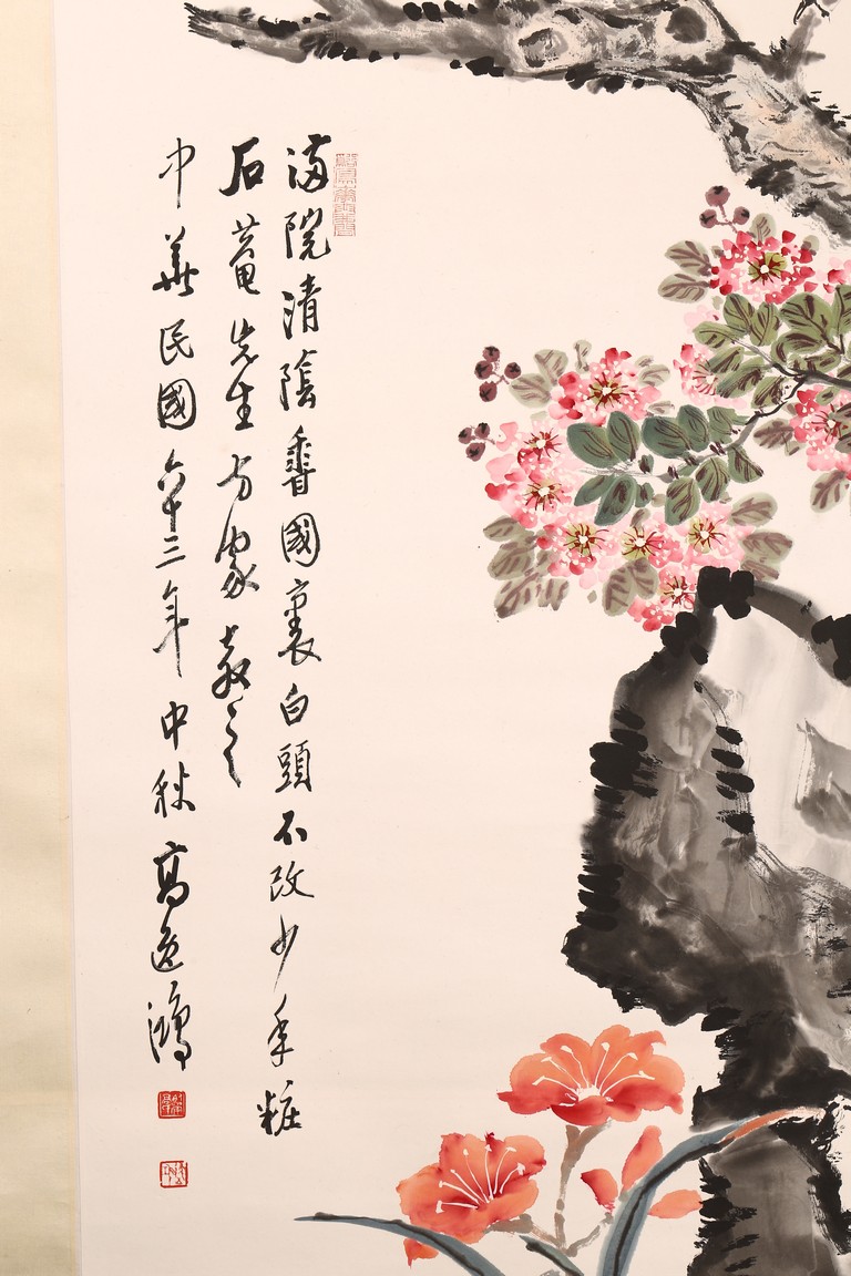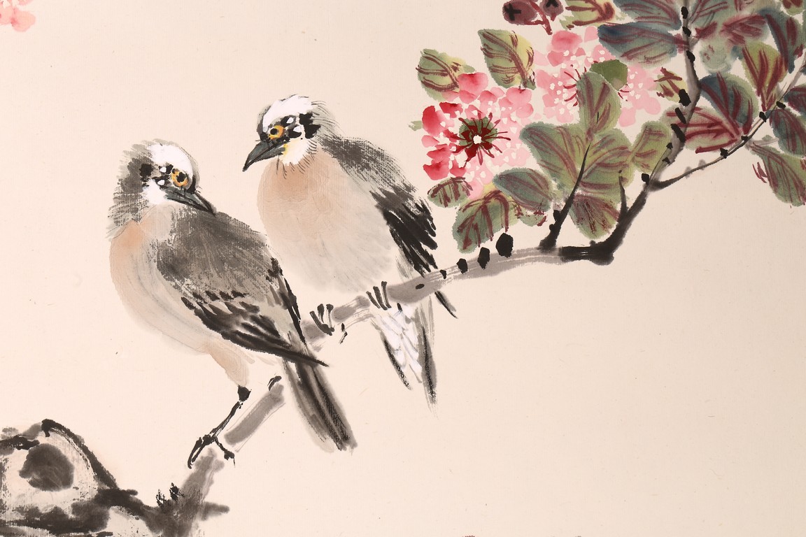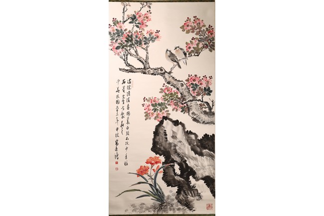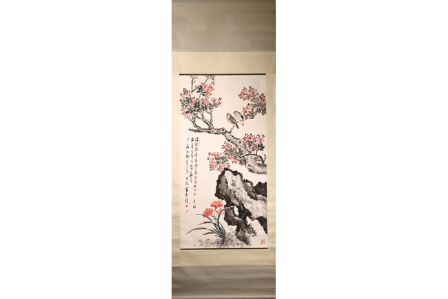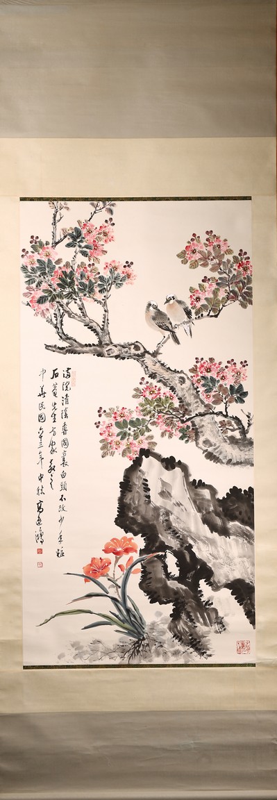 Color and ink on paper. magpies and plum blossom. Hanging scroll. Inscribed and signed with four seal marks.