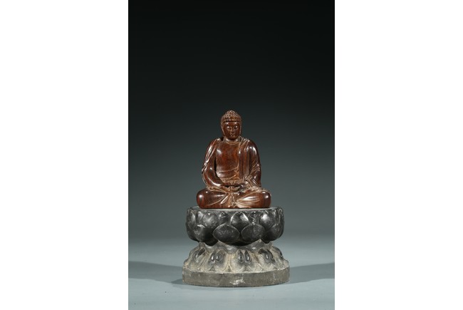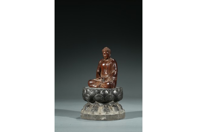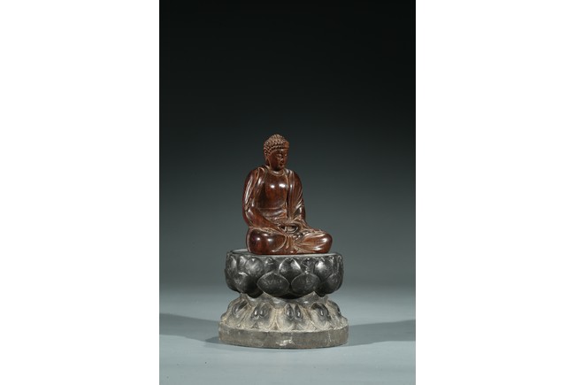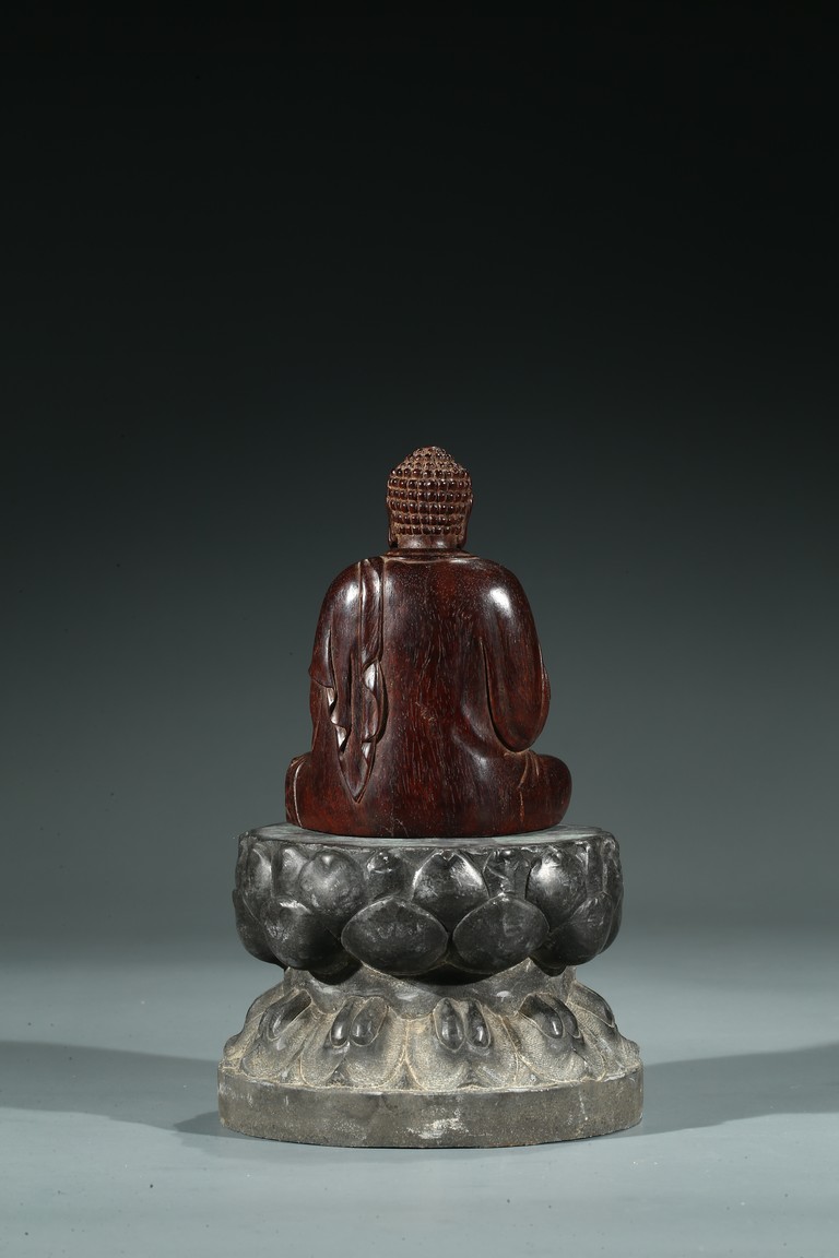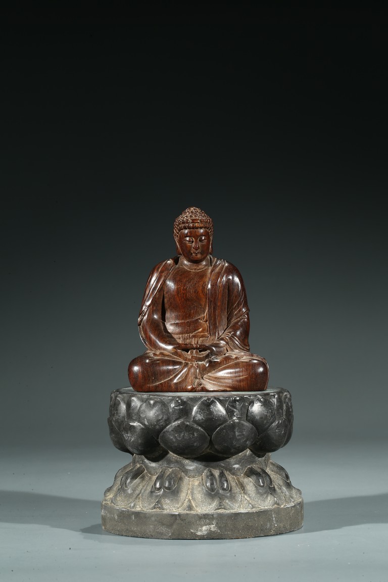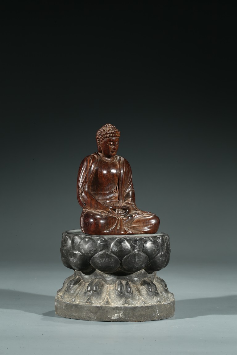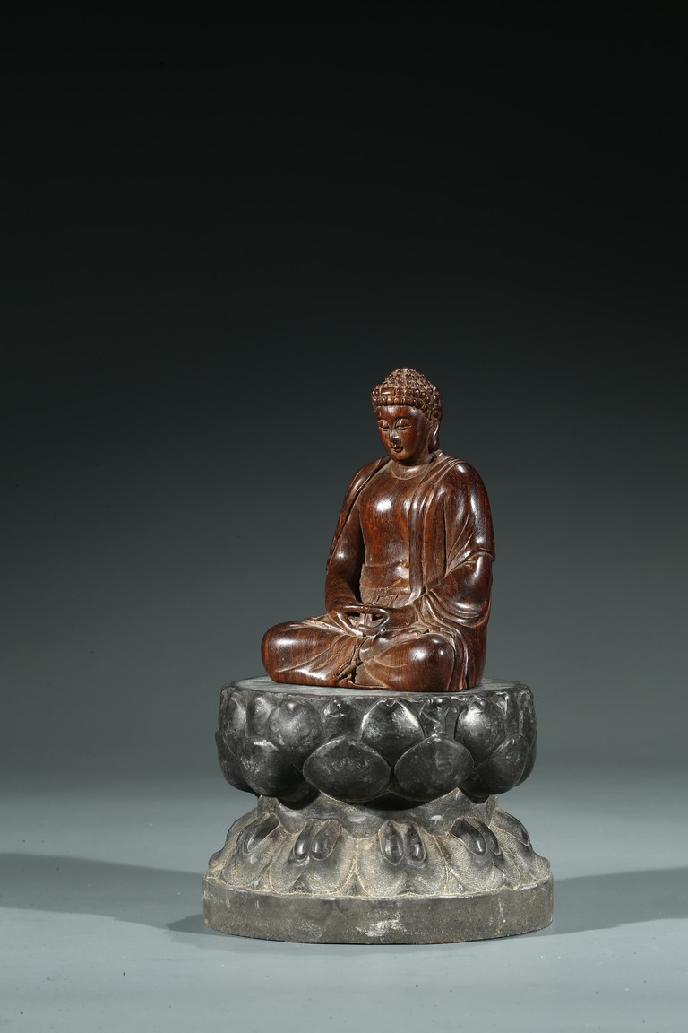 Carved in the form of the Amitabha buddha, with both hands rested in dhyana mudra, dressed in long flowing robes, the face with serene expression, below tight curls of hair surrounding the ushnisha, all supported on a stone carved double lotus stand.