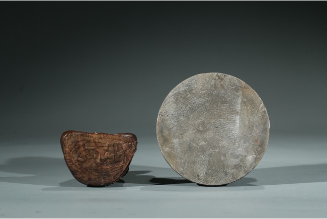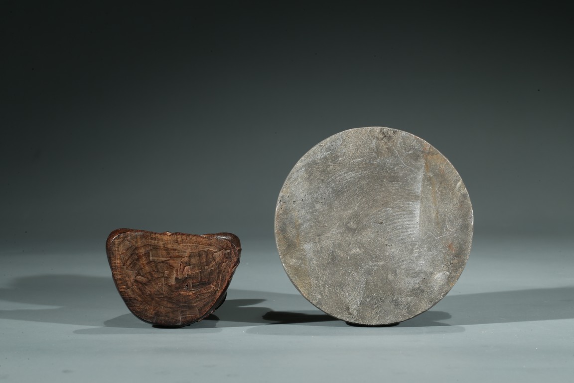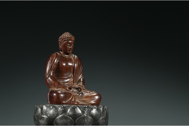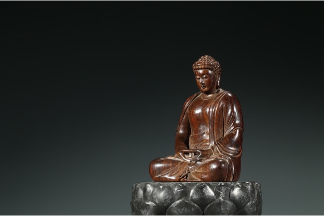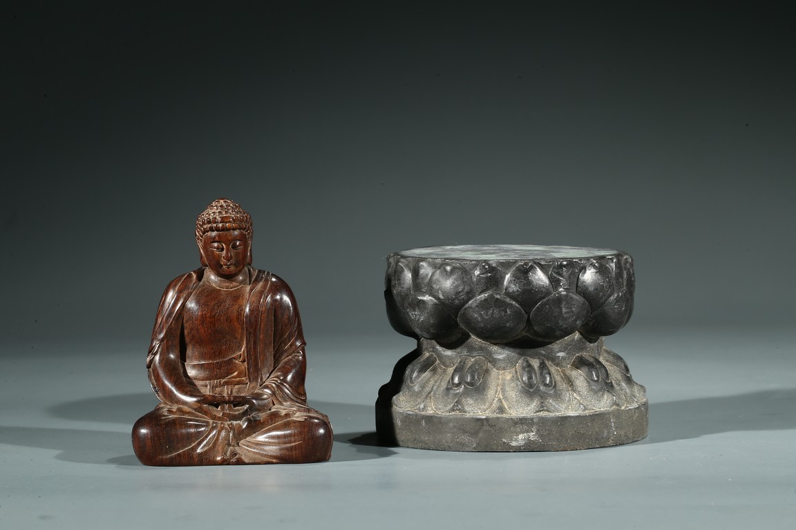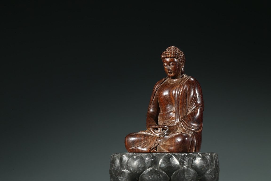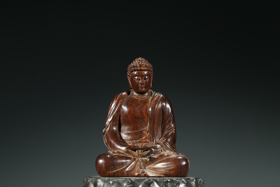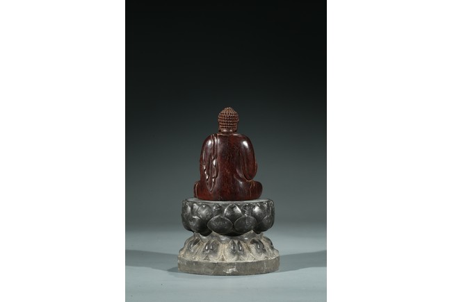 Carved in the form of the Amitabha buddha, with both hands rested in dhyana mudra, dressed in long flowing robes, the face with serene expression, below tight curls of hair surrounding the ushnisha, all supported on a stone carved double lotus stand.