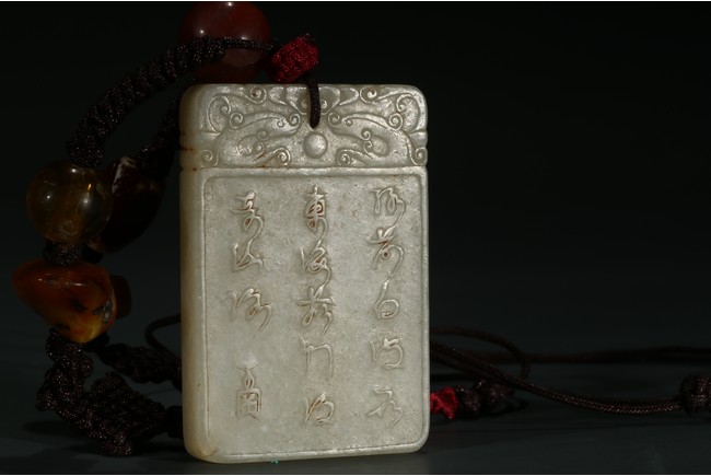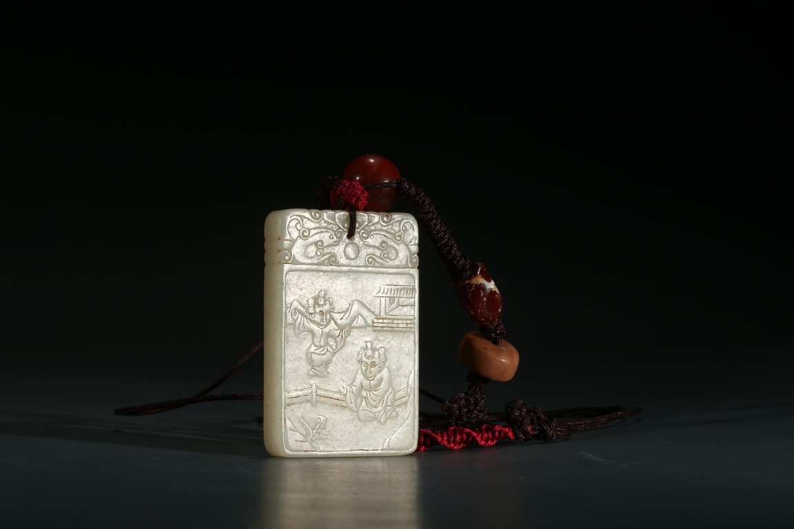 Of rectangular form, carved to one side with two boys playing in a garden setting, the reverse with inscription.