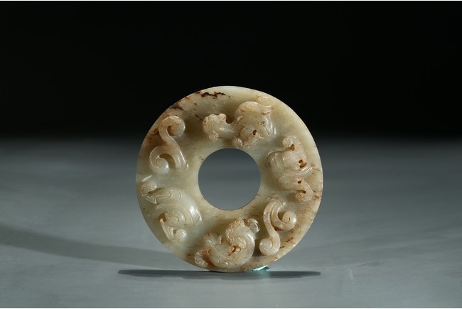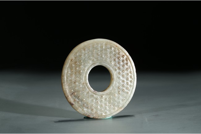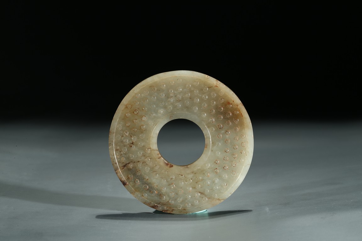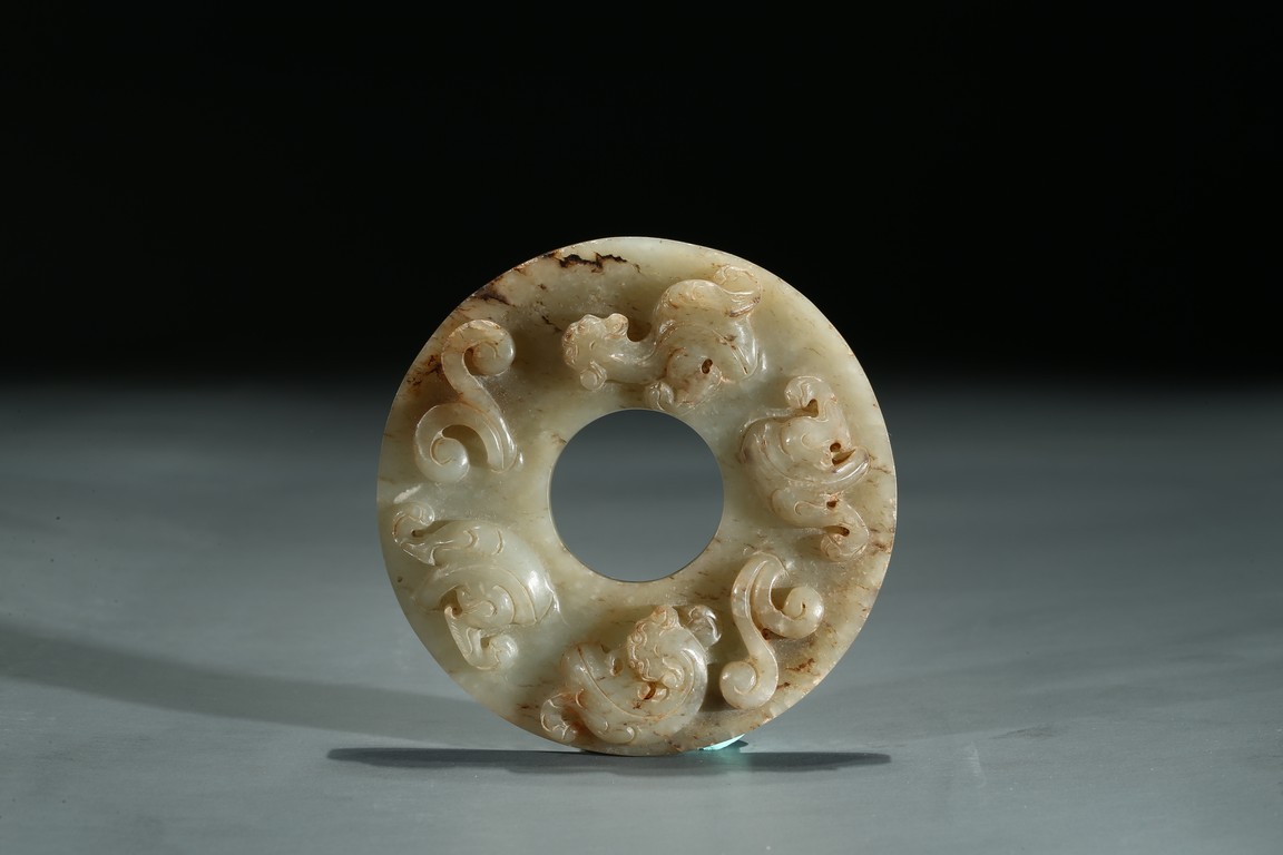 Of circular form, the disc carved to one side with two chilong in high relief, the reverse with dense 'grain' pattern