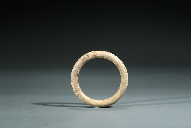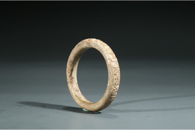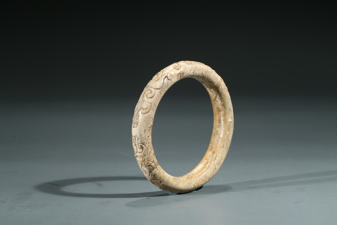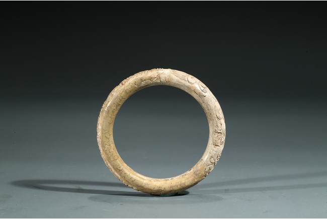 A CALCIFIED JADE 'CHILONG AND INSCRIPTION' BANGLE 漢 玉環