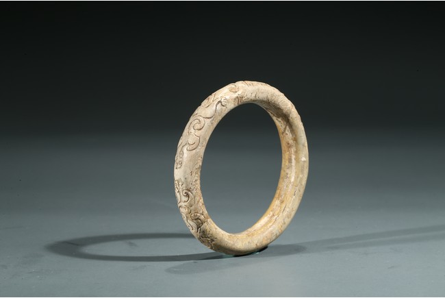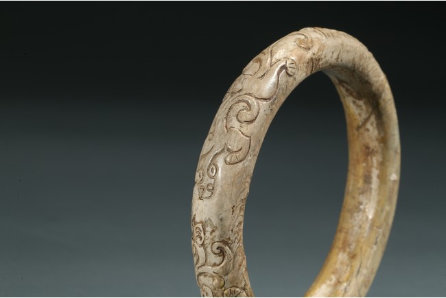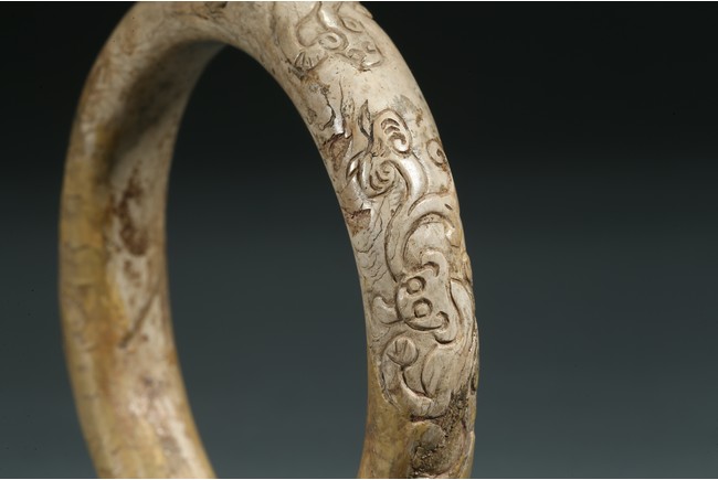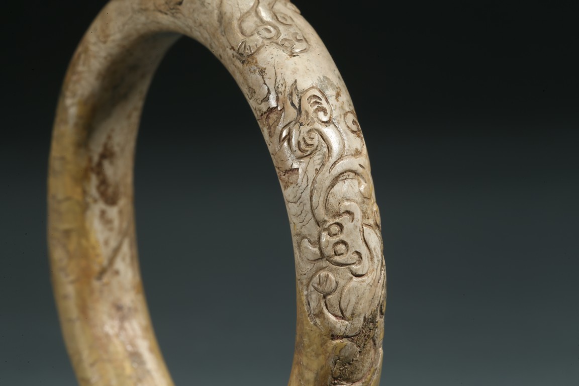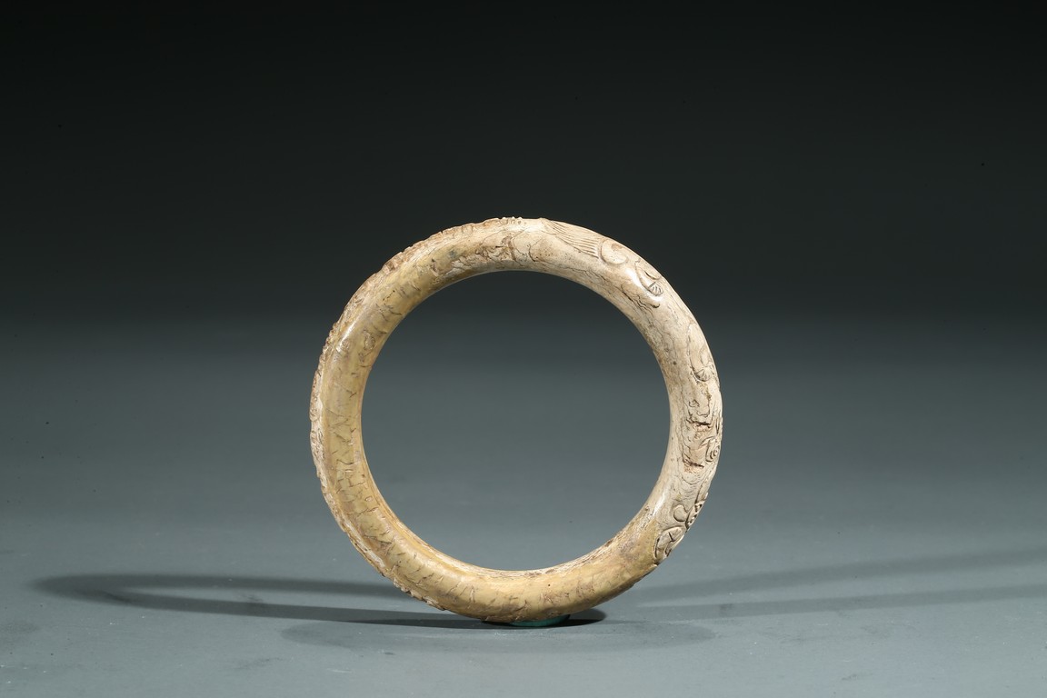 The circular bangle exterior carved in relief to depict sinuous chilong and inscriptions.
