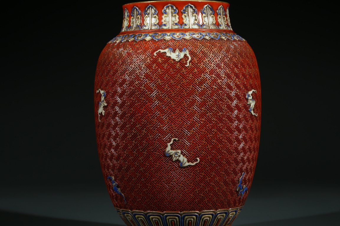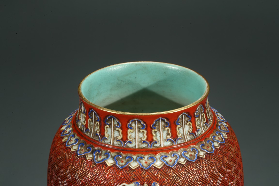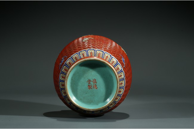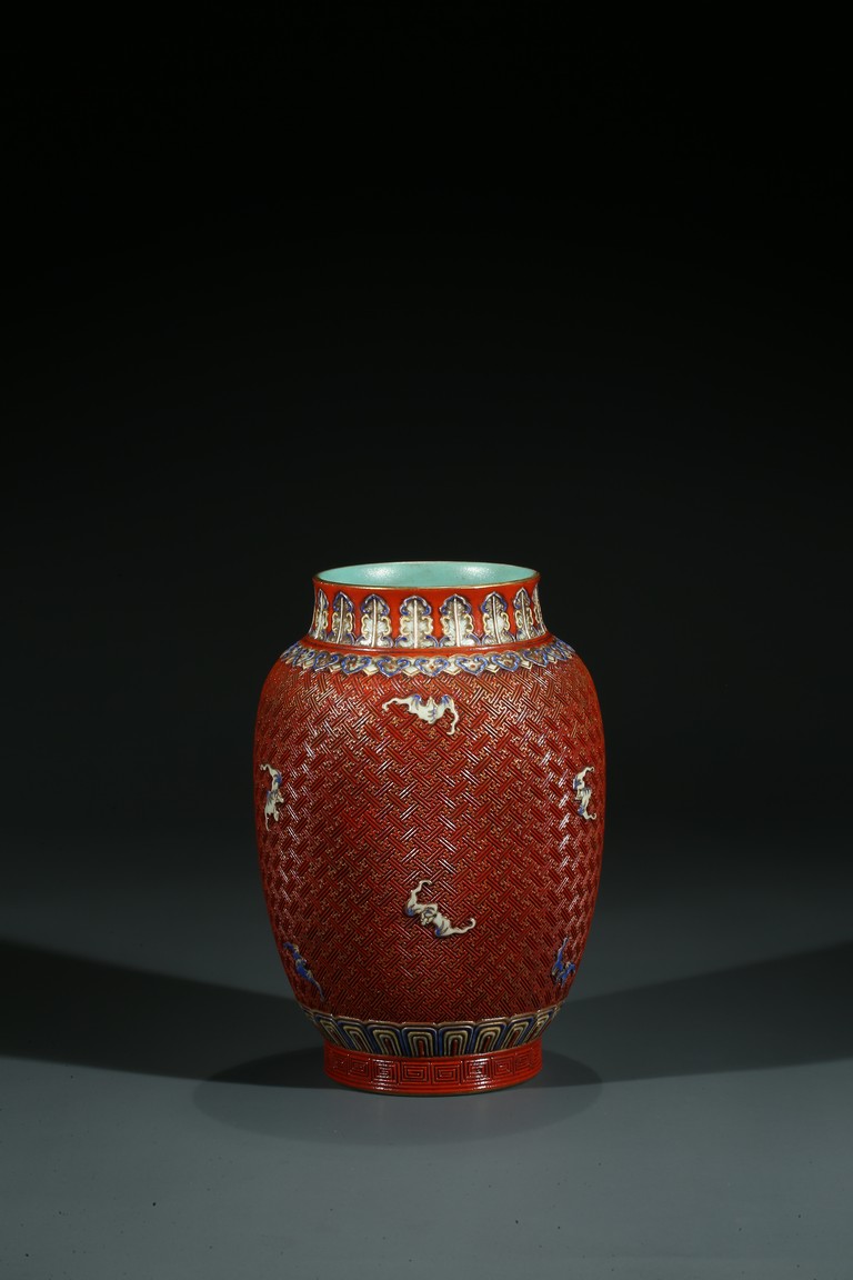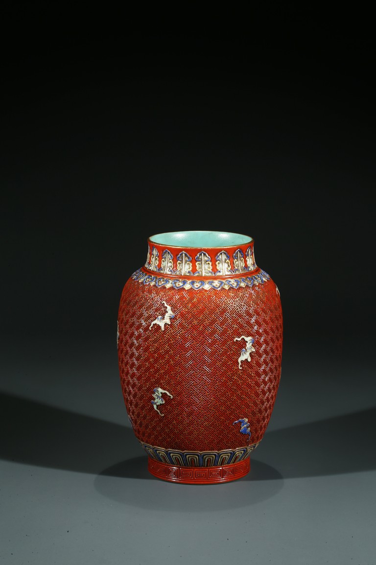 Qing Dynasty period. The ovoid body adorned with flying bats in blue and green enamel, reserved on a densely carved coral-red wan-diaper ground imitating cinnabar lacquer, all between bands of pendant ruyi-heads draping the shoulder, upright leaf lappets collaring the neck and stylised lappets skirting the gilded keyfret foot, the interior and the base glazed turquoise, the recessed base inscribed in iron-red with a four-character hall mark Shende Tang zhi ('Made for the Hall of Prudent Virtue').