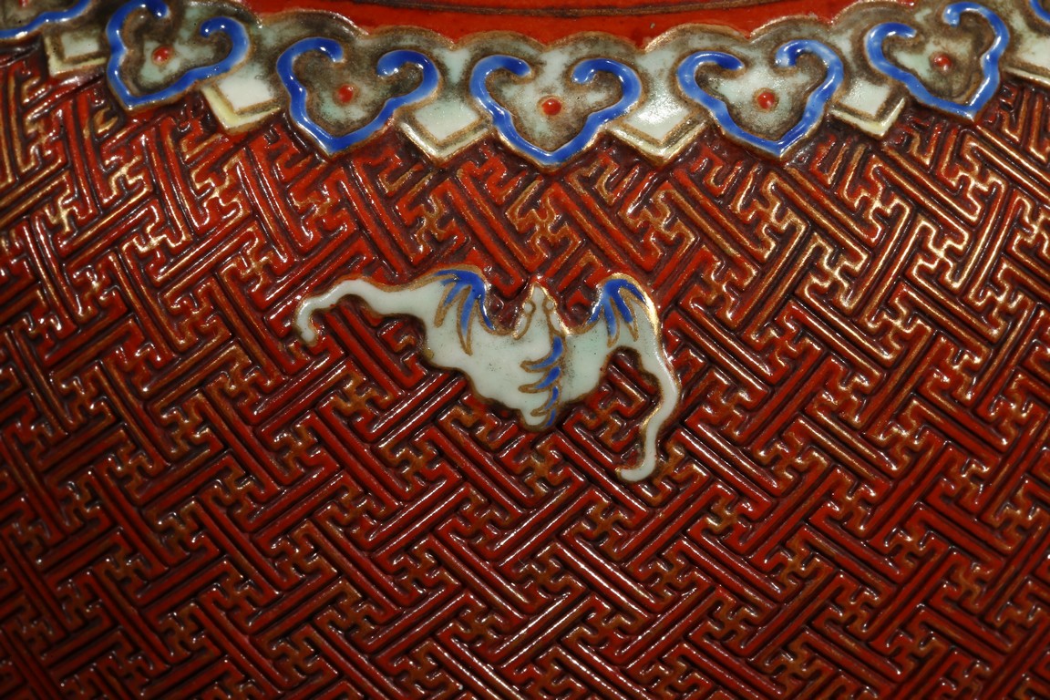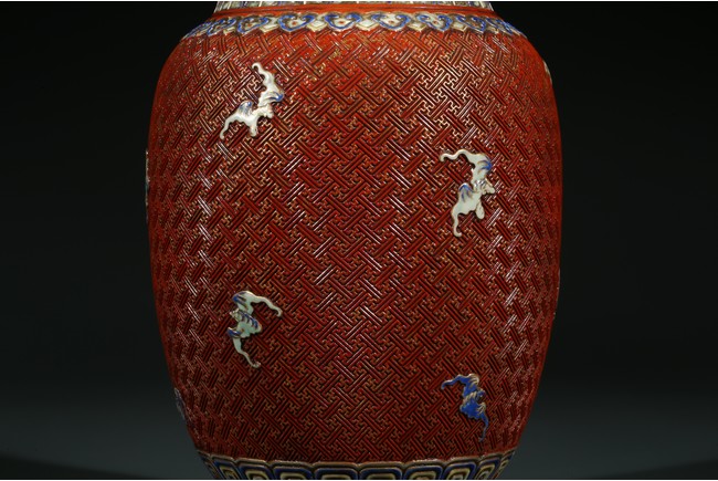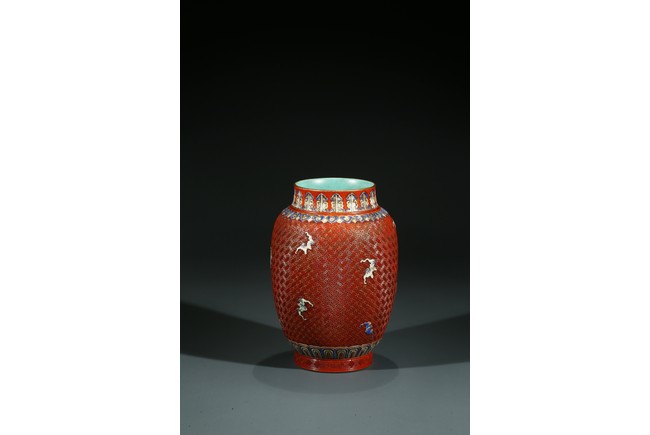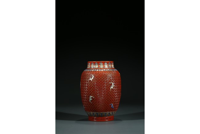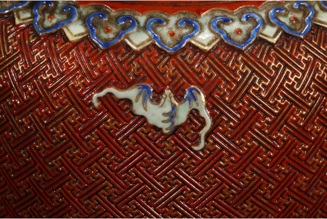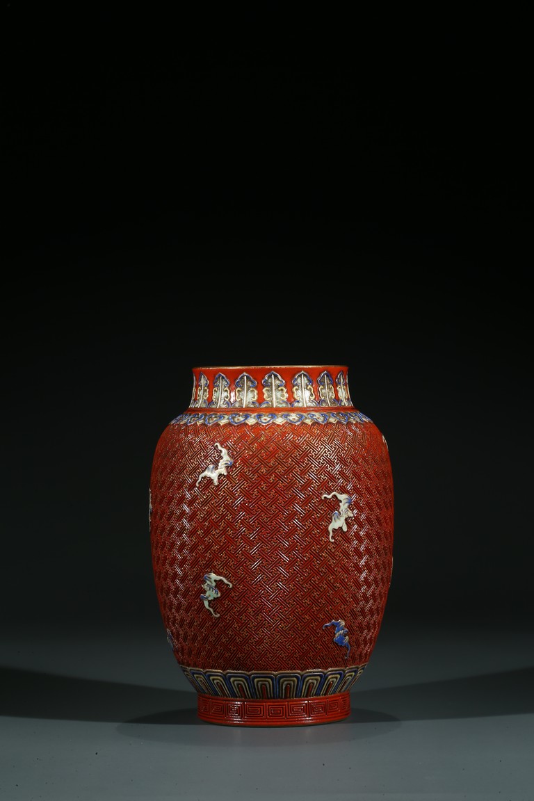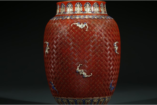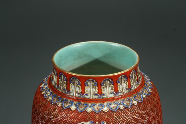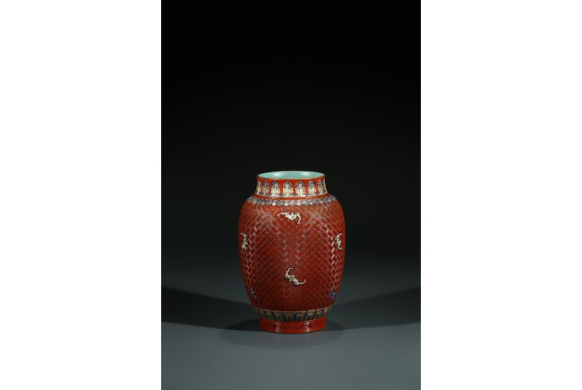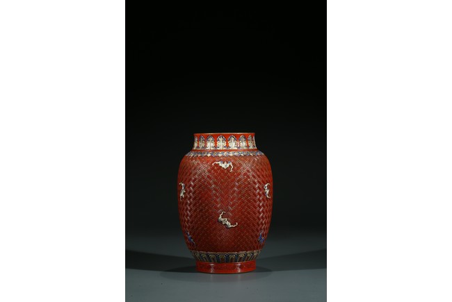 Qing Dynasty period. The ovoid body adorned with flying bats in blue and green enamel, reserved on a densely carved coral-red wan-diaper ground imitating cinnabar lacquer, all between bands of pendant ruyi-heads draping the shoulder, upright leaf lappets collaring the neck and stylised lappets skirting the gilded keyfret foot, the interior and the base glazed turquoise, the recessed base inscribed in iron-red with a four-character hall mark Shende Tang zhi ('Made for the Hall of Prudent Virtue').