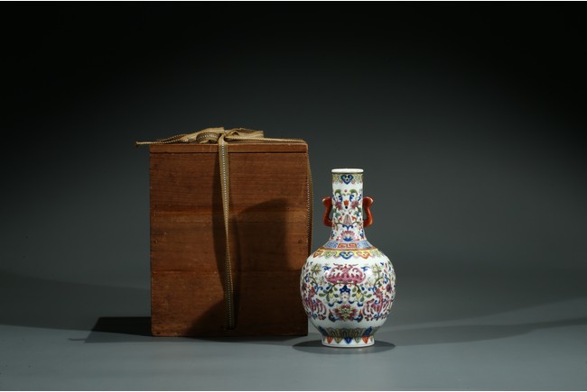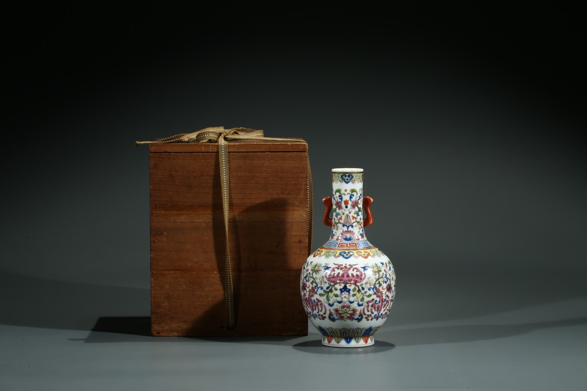 The body enamelled with large peonies flanked by pair of stylized phoenix and below auspicious bat amidst meandering floral scrolls, all between a band of ruyi heads around the neck and upright leaf lappet around base, the neck further decorated with floral scrolls flanked by a pair of red-glazed handles. The base inscribed with six character Jiaqing mark. Accompanied with Japanese wood box.
