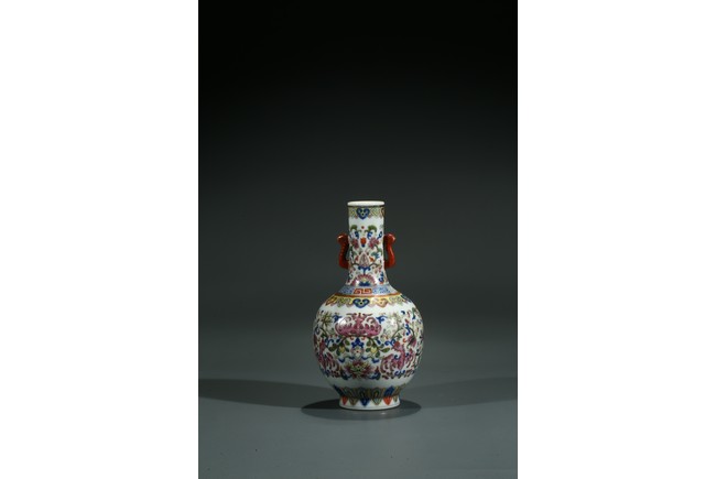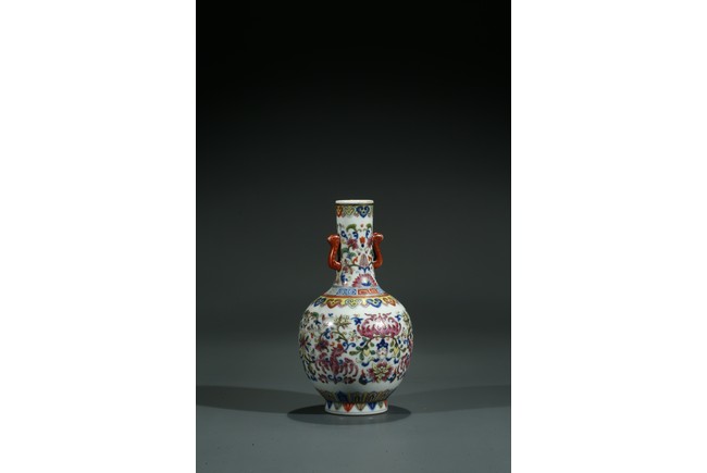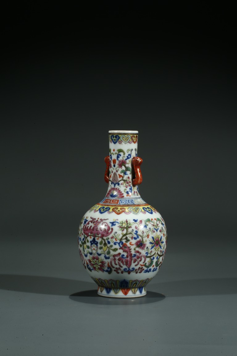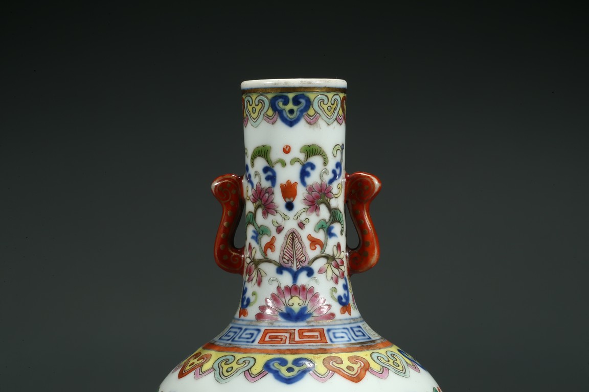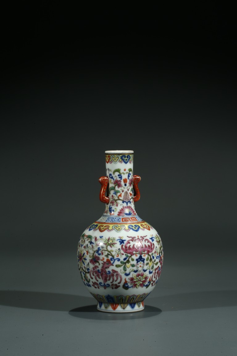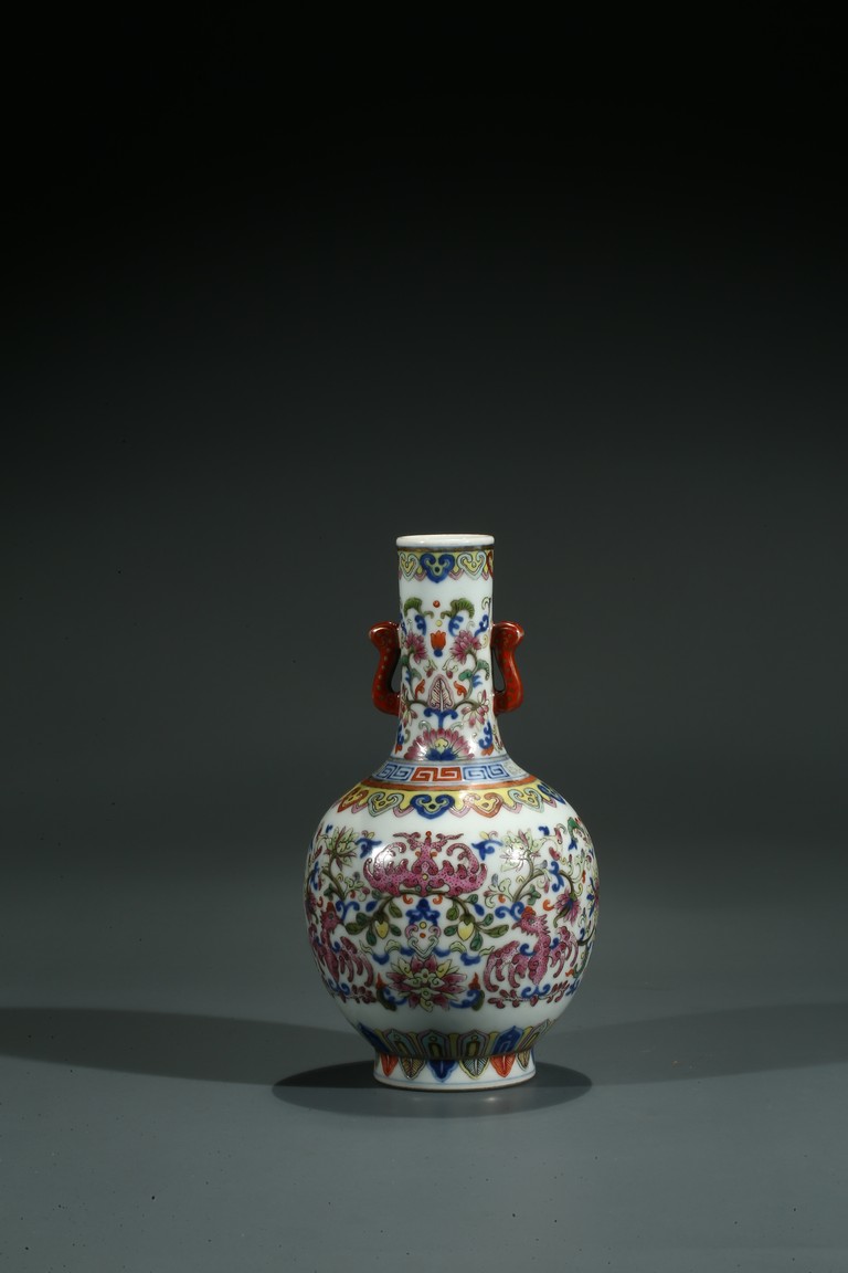 直口,長頸,圓鼓型腹,圈足外撇,長頸處飾如意型耳,貼塑礬紅描金。拍 品器形小巧,宜於上手把玩,當為禦窯廠奉旨燒造的宮廷賞玩器,極為名貴。口 沿描金繪如意靈芝紋,長頸部分繪畫纏枝花卉紋,腹部繪“回紋”“纏枝花卉紋” “雲蝠紋”“雙鳳鳥紋”,足底繪“蓮瓣紋”“蕉葉紋”。整體布局清新疏朗, 填色精準,紋飾繁復,鮮妍奪目,其釉極瑩潤,其色極妍麗,絕非後來所能及, 觀之尚存濃厚的乾隆華麗雍容之氣息,盡展嘉慶瓷器承襲前朝尊貴堂皇的藝術遺 風,烘托出喜慶祥和的氣氛,是為嘉慶官窯之雋品。“大清嘉慶年制”款識。
