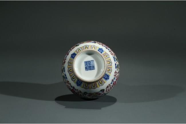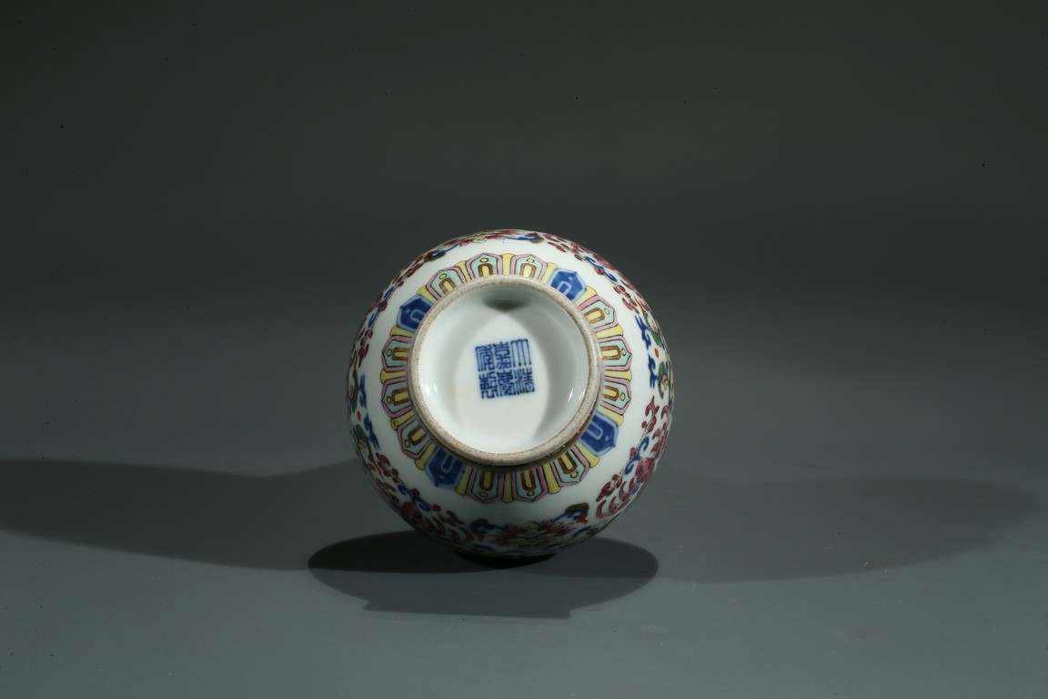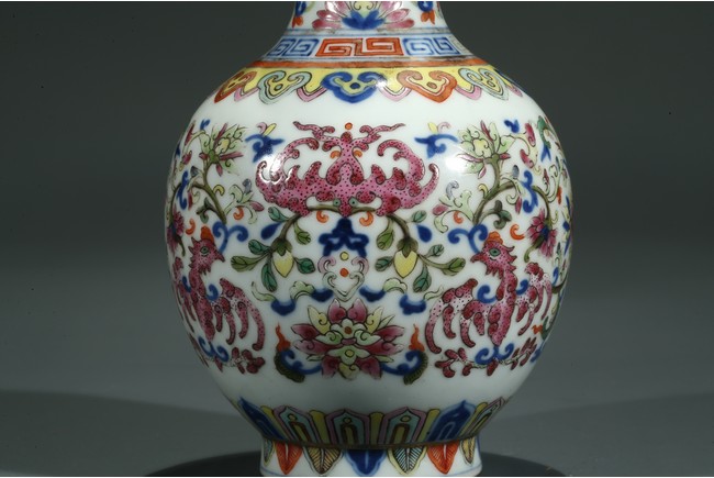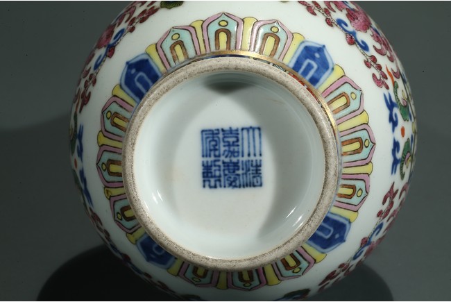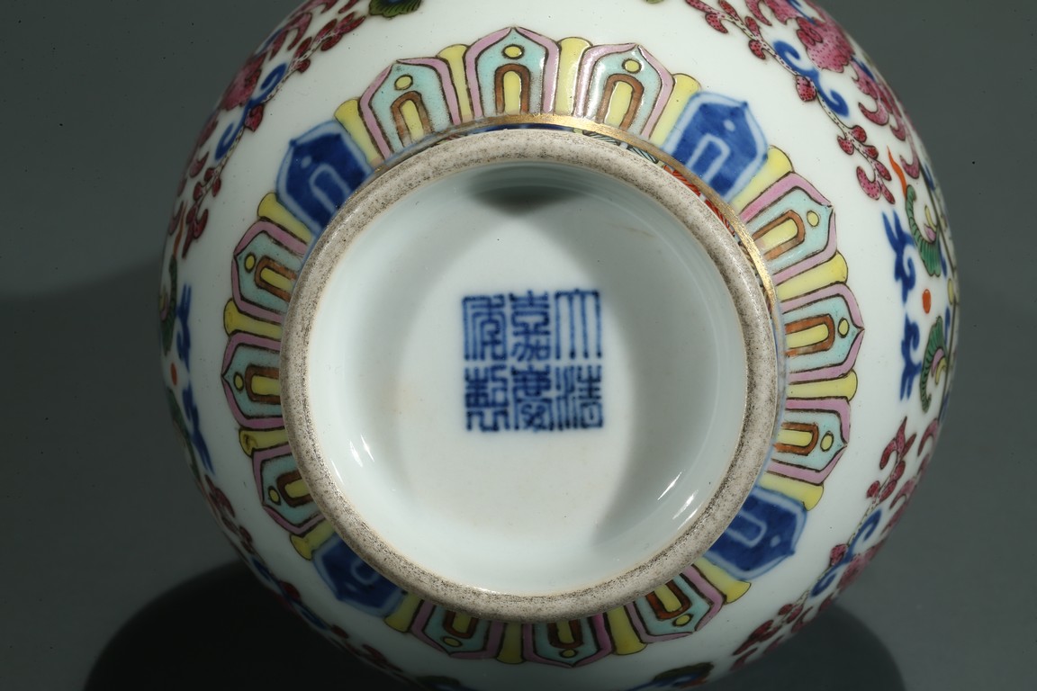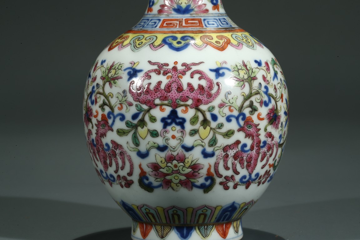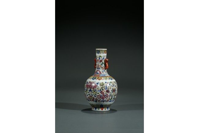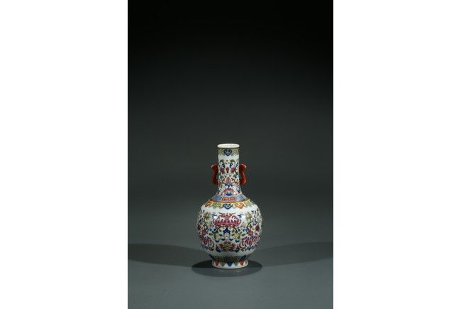 直口,長頸,圓鼓型腹,圈足外撇,長頸處飾如意型耳,貼塑礬紅描金。拍 品器形小巧,宜於上手把玩,當為禦窯廠奉旨燒造的宮廷賞玩器,極為名貴。口 沿描金繪如意靈芝紋,長頸部分繪畫纏枝花卉紋,腹部繪“回紋”“纏枝花卉紋” “雲蝠紋”“雙鳳鳥紋”,足底繪“蓮瓣紋”“蕉葉紋”。整體布局清新疏朗, 填色精準,紋飾繁復,鮮妍奪目,其釉極瑩潤,其色極妍麗,絕非後來所能及, 觀之尚存濃厚的乾隆華麗雍容之氣息,盡展嘉慶瓷器承襲前朝尊貴堂皇的藝術遺 風,烘托出喜慶祥和的氣氛,是為嘉慶官窯之雋品。“大清嘉慶年制”款識。