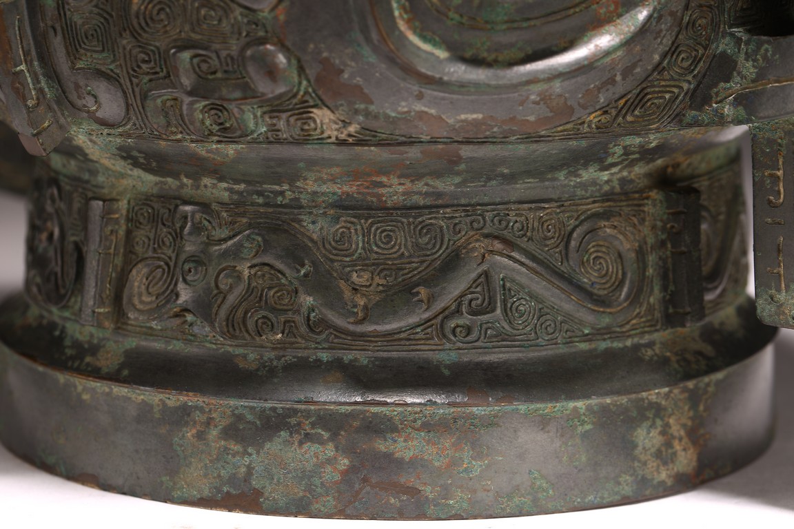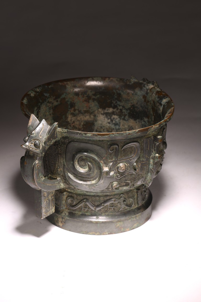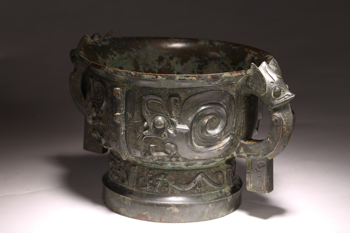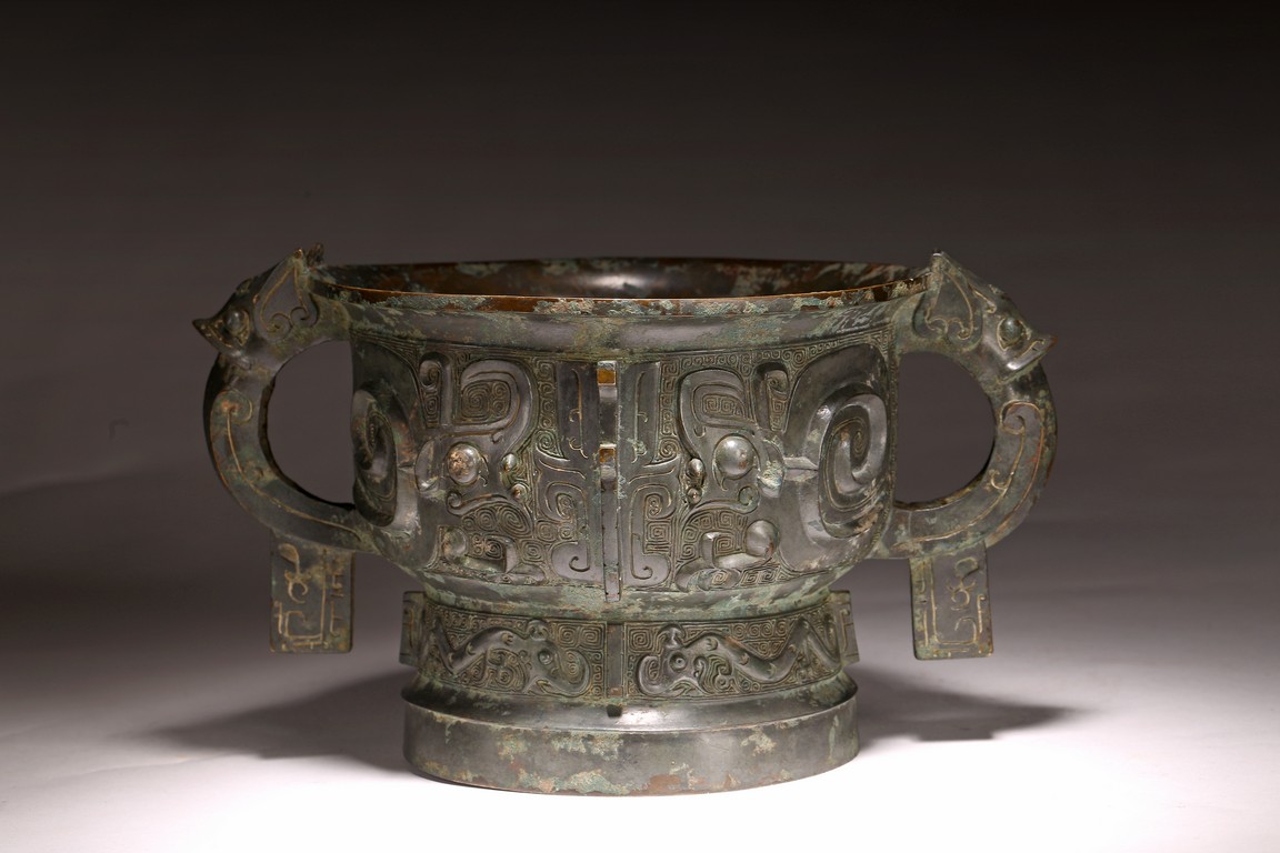 The deep U-shaped sides flaring slightly at the mouth, flanked by a pair of loop handles issuing from bovine masks and terminating in a pendent tab, cast around the body with a large band featuring a pair of prominent confronted kui dragons and centered on a raised mask forming a flange, the tall slightly flared foot decorated with a frieze of stylised birds, all against a leiwen ground. The interior with a pictogram depicting a man figure flanked by horses and boar above a symbol. Late Shang/Western Zhou Dynasty period.
