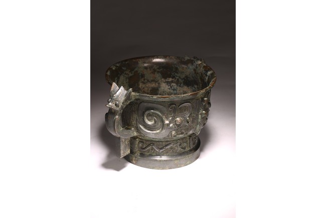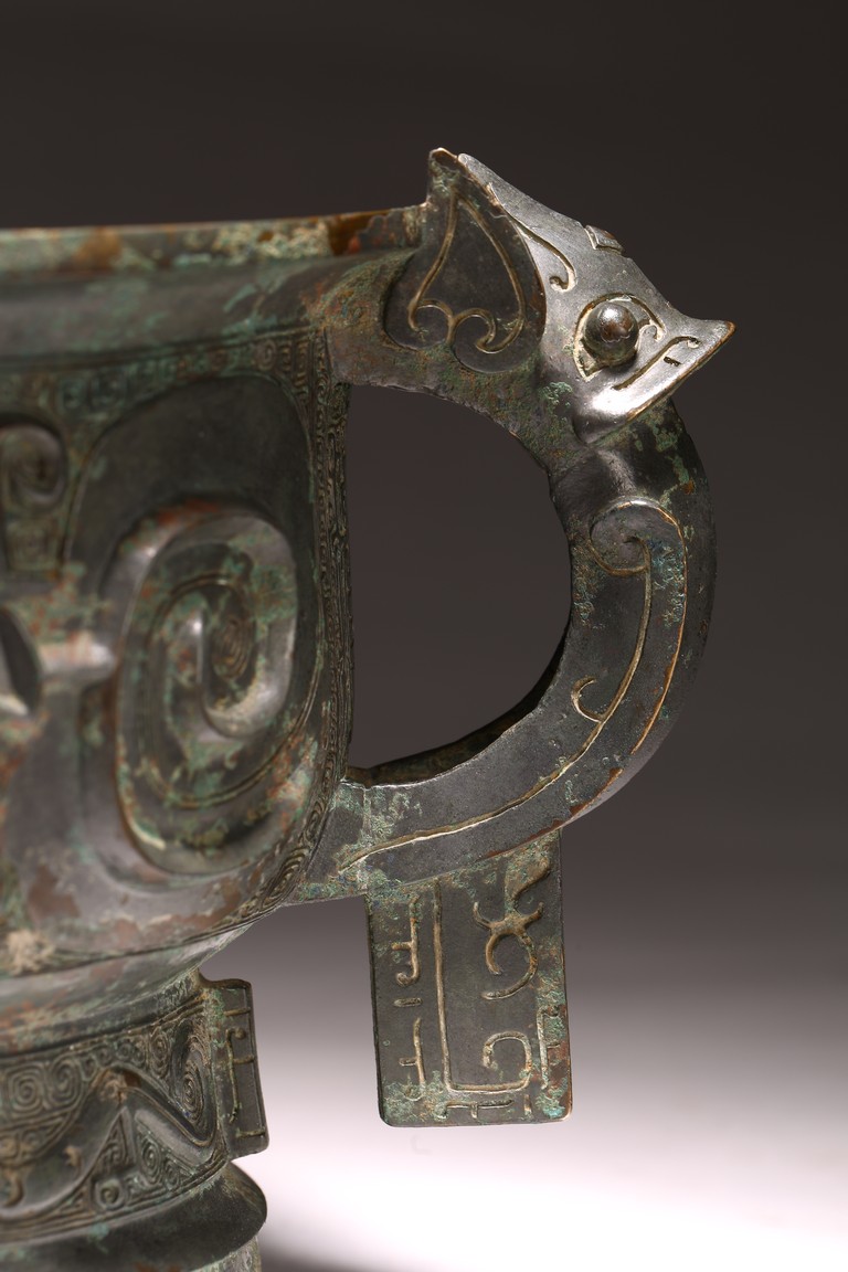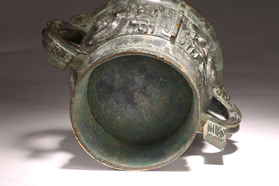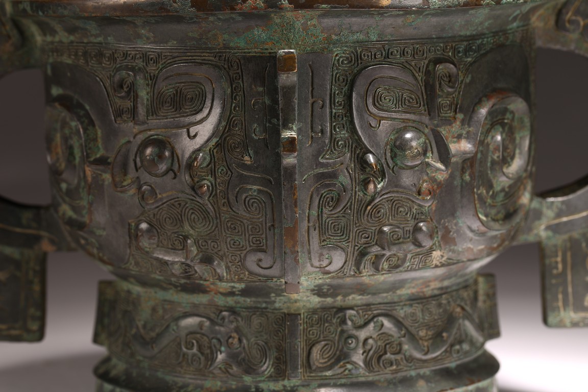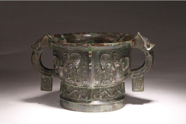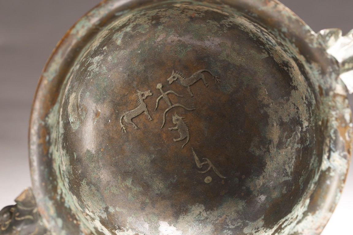 The deep U-shaped sides flaring slightly at the mouth, flanked by a pair of loop handles issuing from bovine masks and terminating in a pendent tab, cast around the body with a large band featuring a pair of prominent confronted kui dragons and centered on a raised mask forming a flange, the tall slightly flared foot decorated with a frieze of stylised birds, all against a leiwen ground. The interior with a pictogram depicting a man figure flanked by horses and boar above a symbol. Late Shang/Western Zhou Dynasty period.