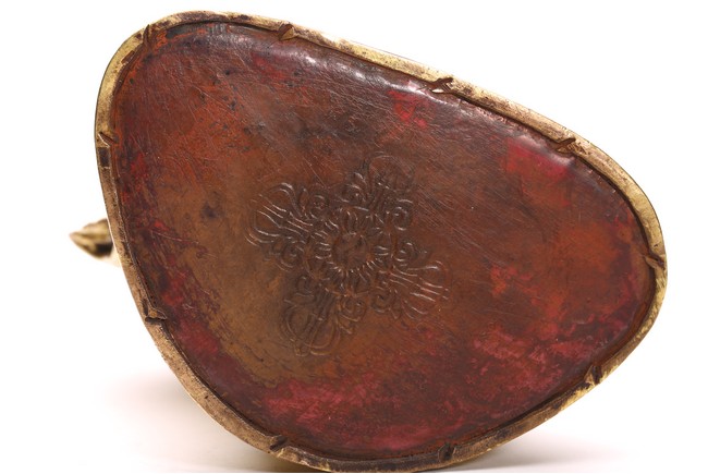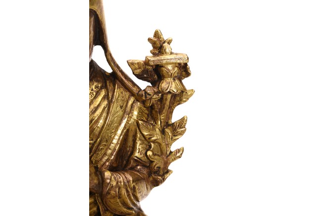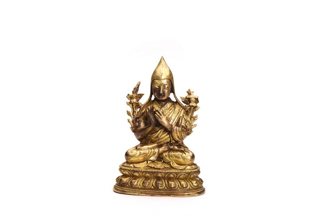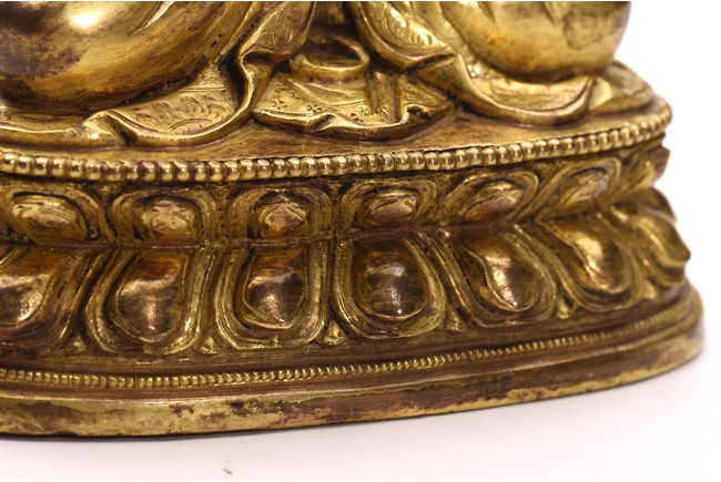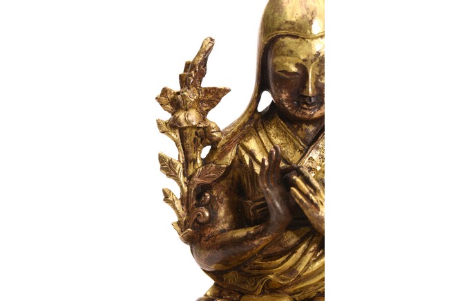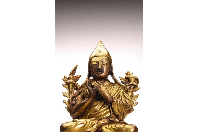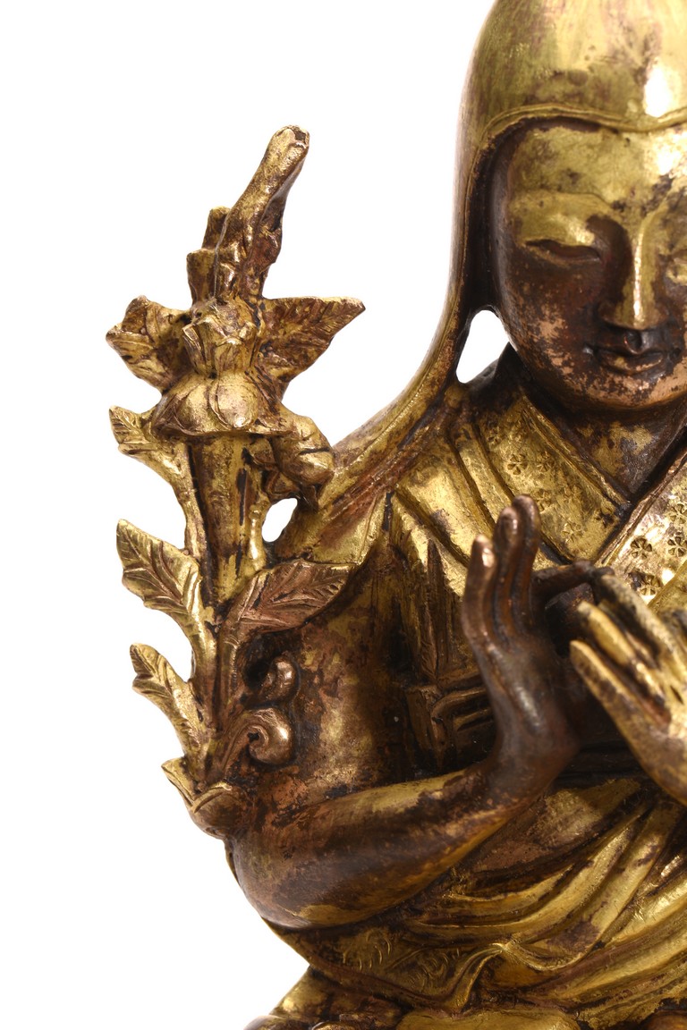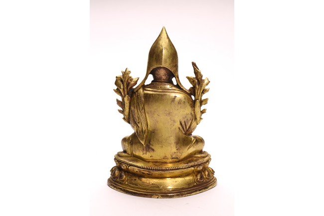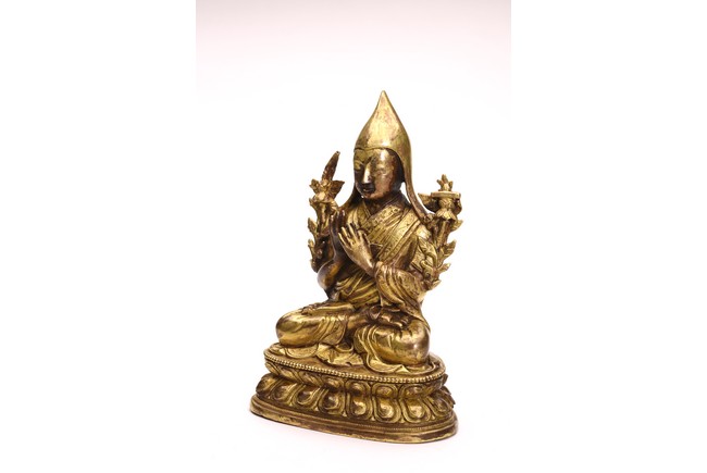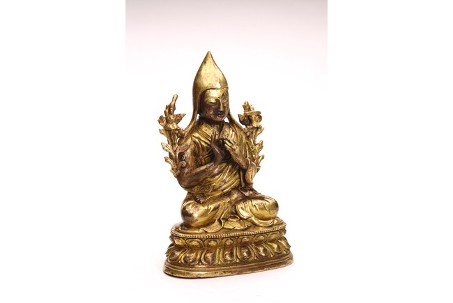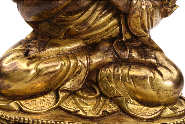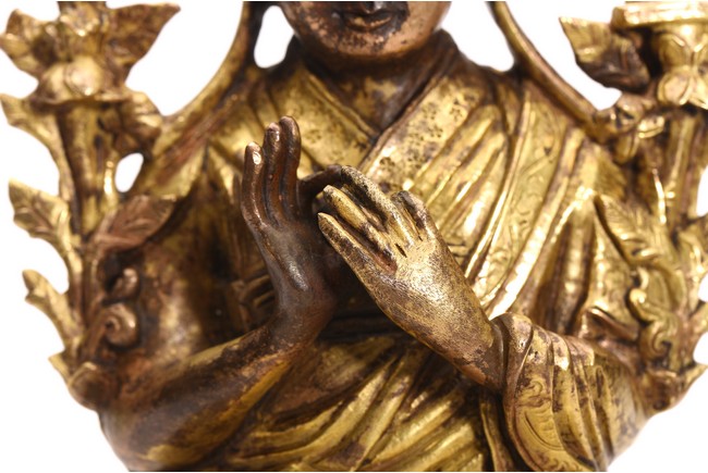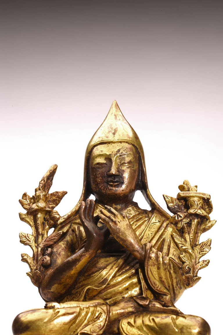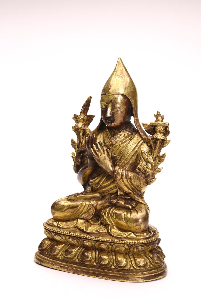 宗喀巴為藏傳佛教格魯派的創始人,因其頭戴黃色桃形僧帽,著黃色僧衣,故此派又俗稱黃帽派或黃教。宗喀巴被認為是大智文殊菩薩的化身,故其形象帶有文殊菩薩的明顯標誌。此尊雙目低垂,面帶笑意,頭戴通人冠,雙手當胸結說法印,身著背心、僧裙和袒右肩袈裟。全跏趺坐於蓮臺之上。此尊蓮臺之蓮瓣上雕刻卷雲紋,做工極其精細。