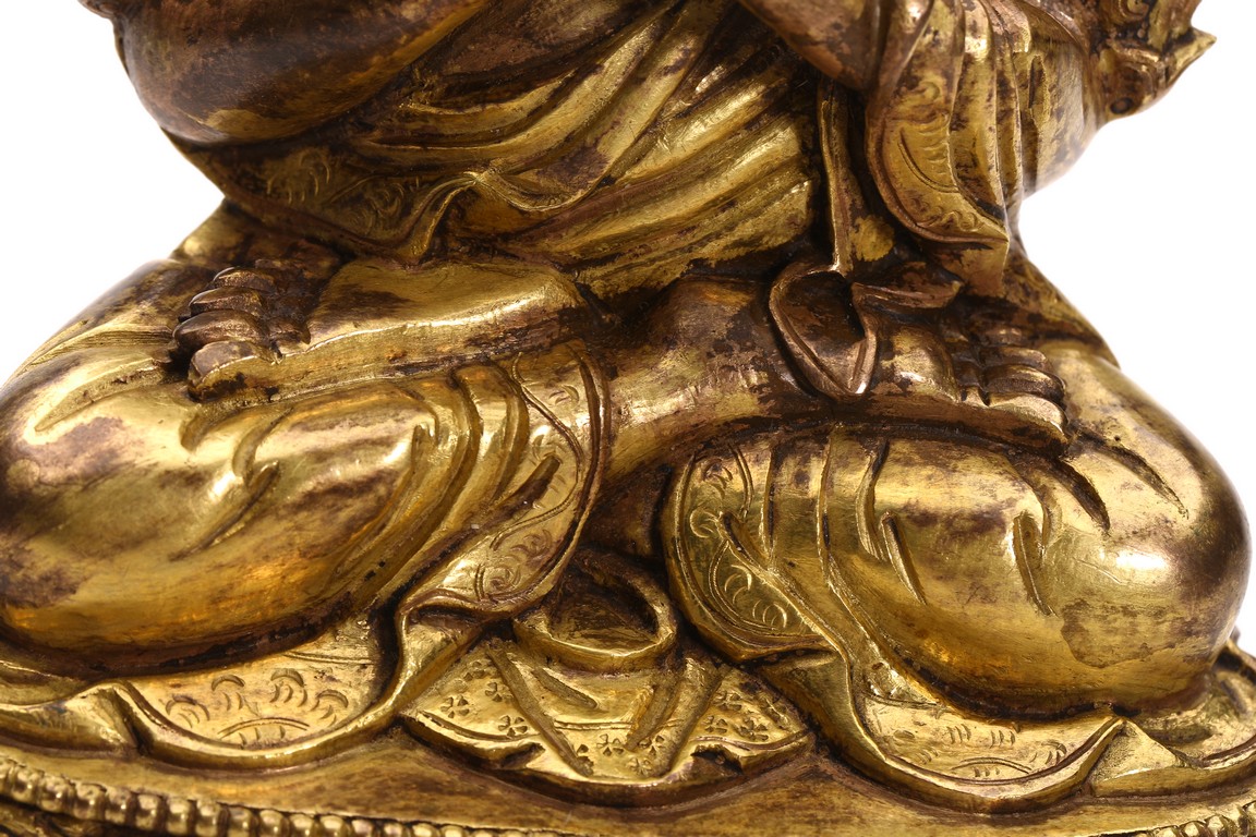 Qing Dynasty period. Cast seated in dhyanasana on a double lotus base, both hands held in dharmachakra mudra, wearing long robes falling into voluminous folds, with uptala lotuses rising from the elbows to the shoulder, crowned with a peaked hat.
