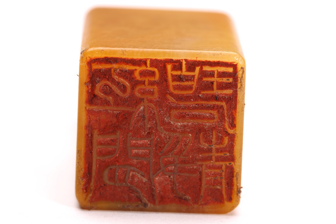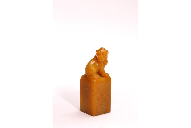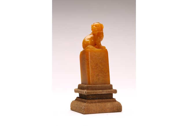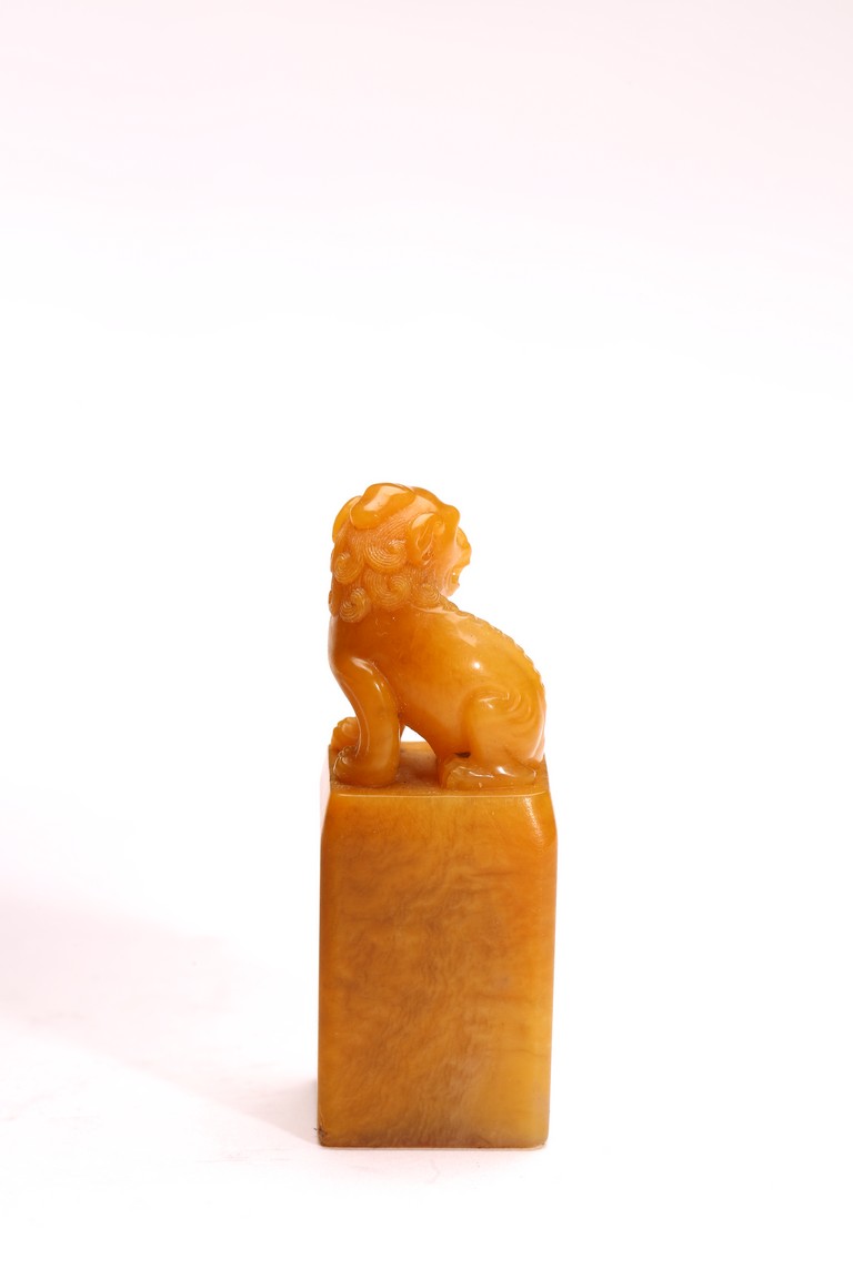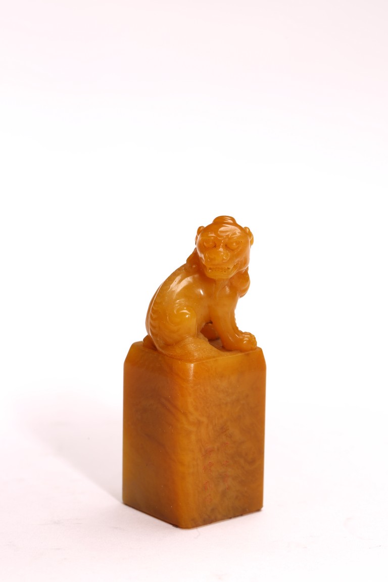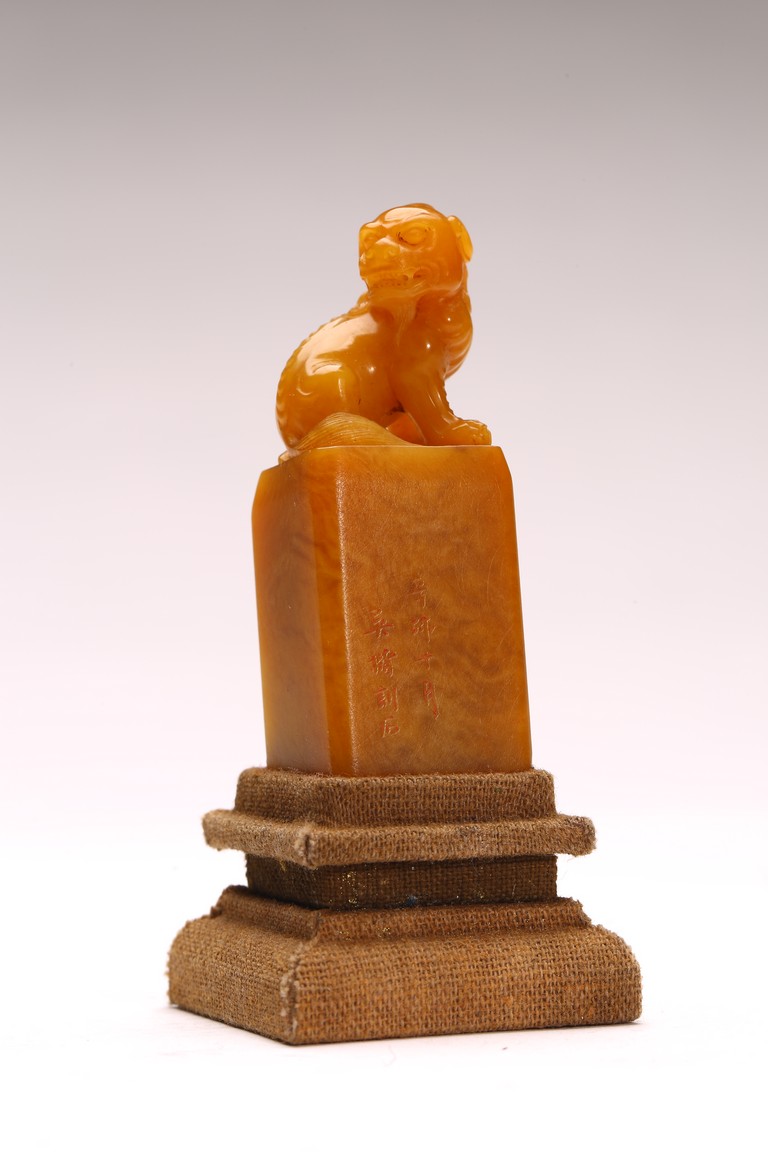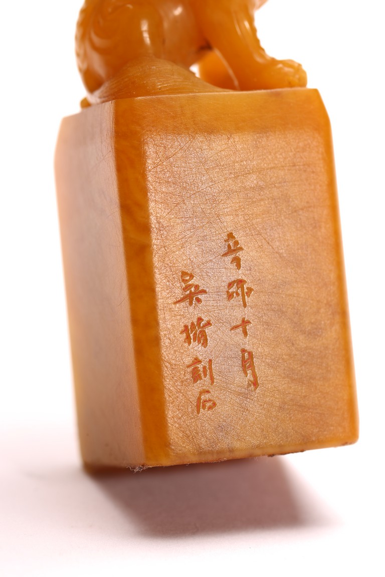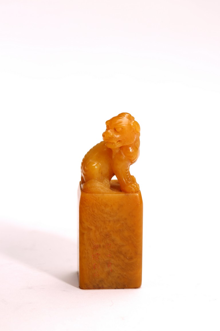 Of upright rectangular form, the top carved with a seated buddhist lion with head turned back, one side with four characters inscription, the seal face with four characters.