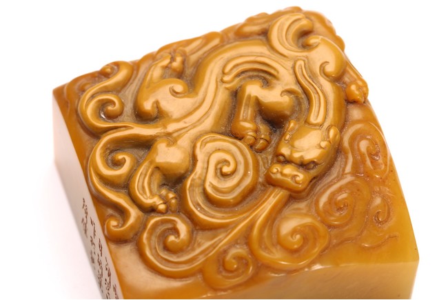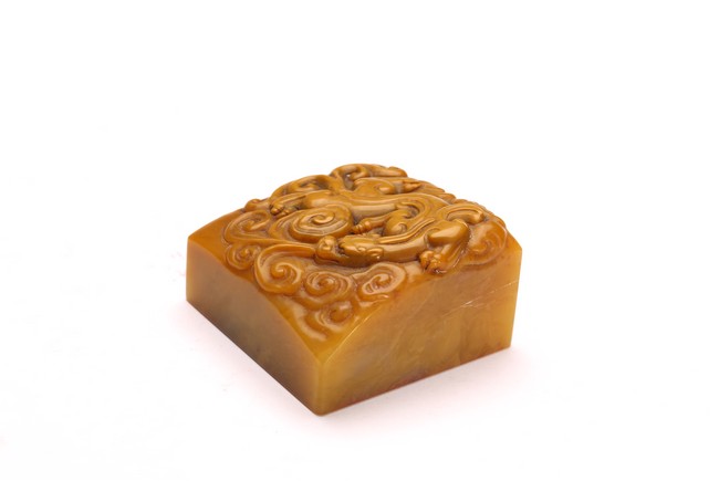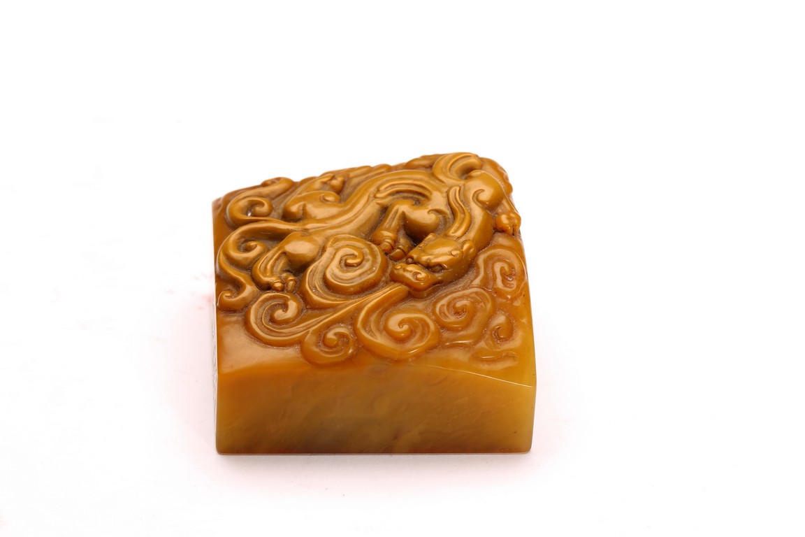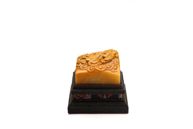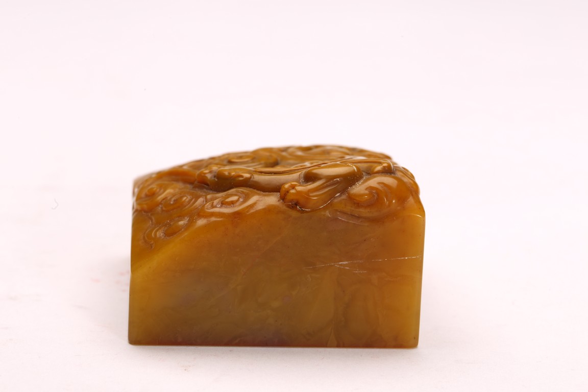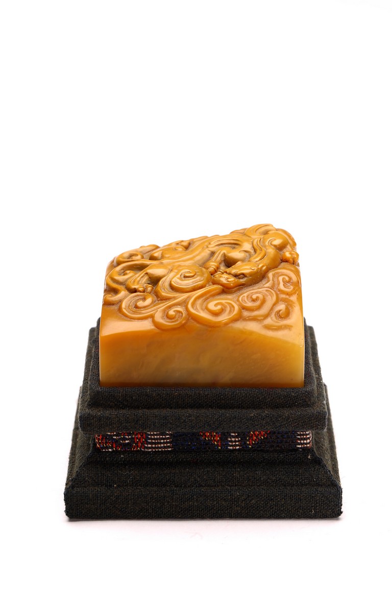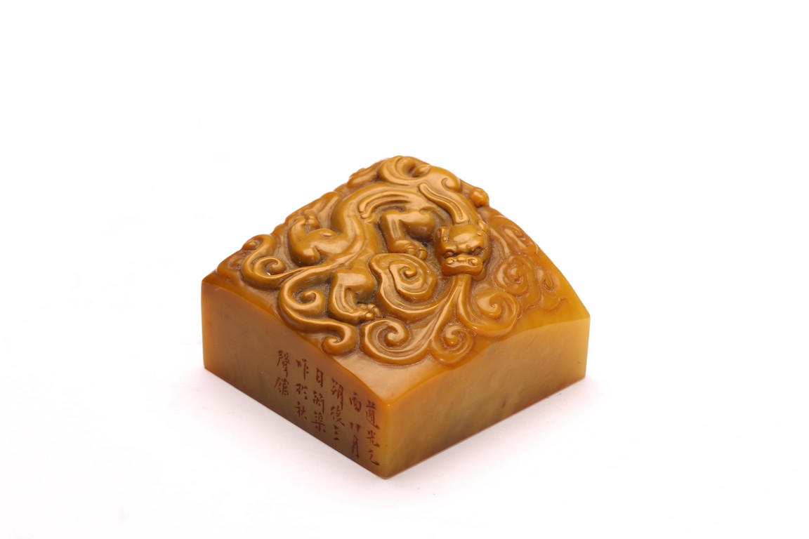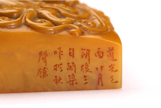 此田黃石章形制方正有度,石質細膩溫潤,撫之如嬰兒之肌,沁人心脾,蘿蔔絲紋理及紅筋繚繞其間,明媚可人,寶光彌漫,印鈕為螭龍紋,螭龍口吐如意靈芝雲紋,栩栩如生,邊款清晰,為道光年間,底部印文也清晰自然