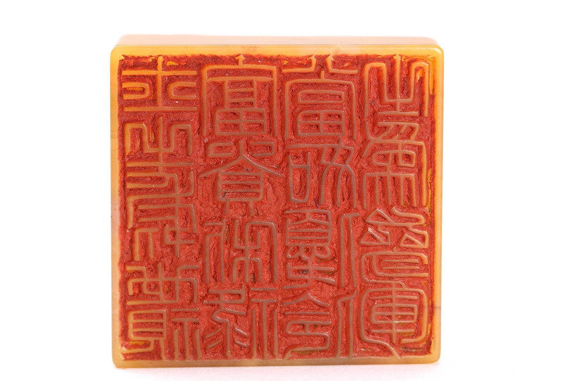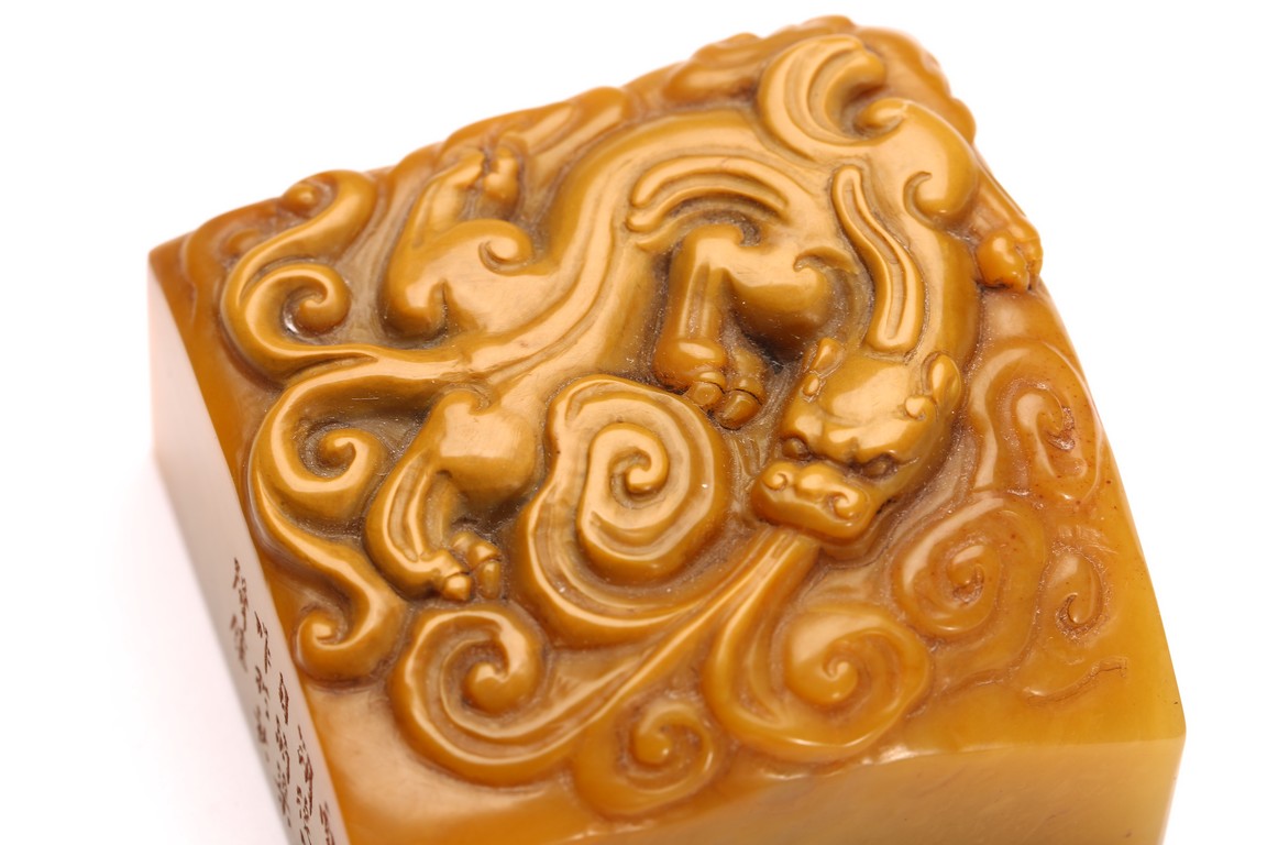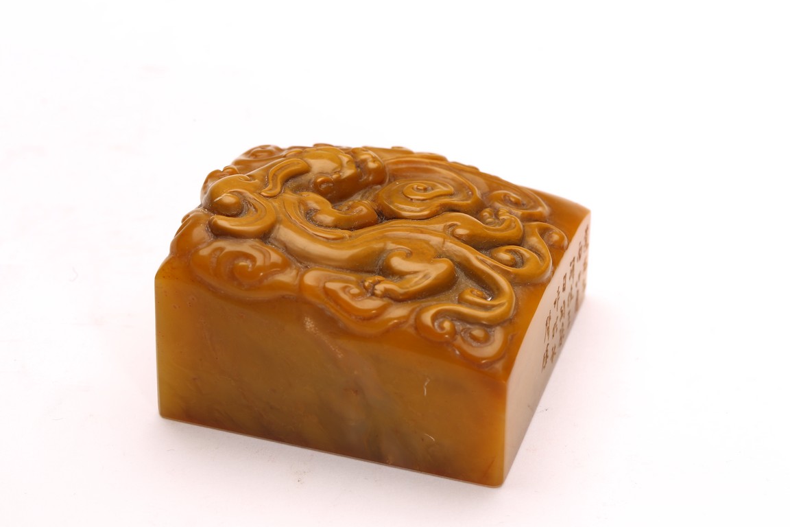 Of square form, the side carved with inscriptions, top further carved in relief with sinuous chilong, the seal base carved with 13 characters. Qing Dynasty period.