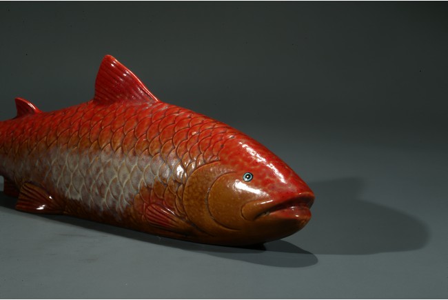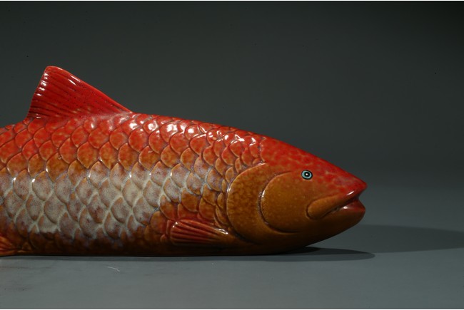 魚在清為十分喜愛的紋飾,因其“魚”同“餘”的諧音相近,又寓意“年年有餘”之意十分討巧。以鯉魚為造型,造型逼真生動,魚的雙鰭與魚尾構成飾件的三個支點,魚嘴微張,魚鰓鼓動,魚鱗刻畫細緻,這一系列的形象完美地詮釋了鯉魚從水中沖躍而出的動感與力量。通體滿飾紅釉,色彩絢麗,紅豔鮮明,釉汁肥厚。