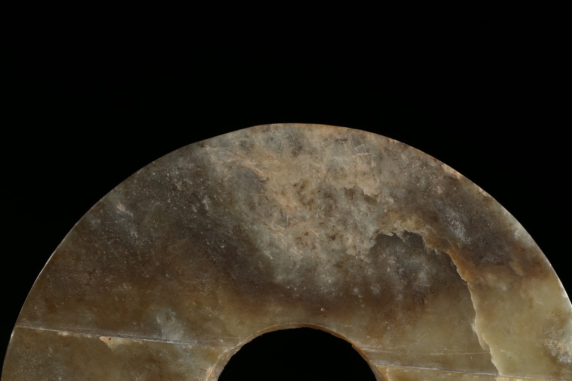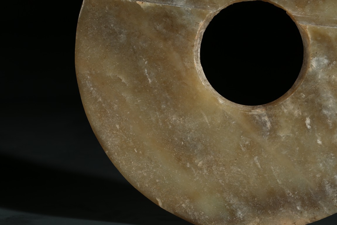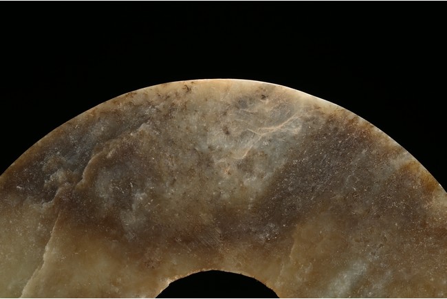 《說文》稱:“璧圓象天”,《周禮》則有“以蒼璧禮天”之說。這說明璧之圓形是仿“天圓”而作。其功能主要用於祭天的禮器,另外也有辟邪或是等級與財富的象征,又體現了先民們對神秘莫測的的敬仰。黃玉制成,玉色古舊,帶黑褐色沁色,造型規整,兩面均光素無紋。