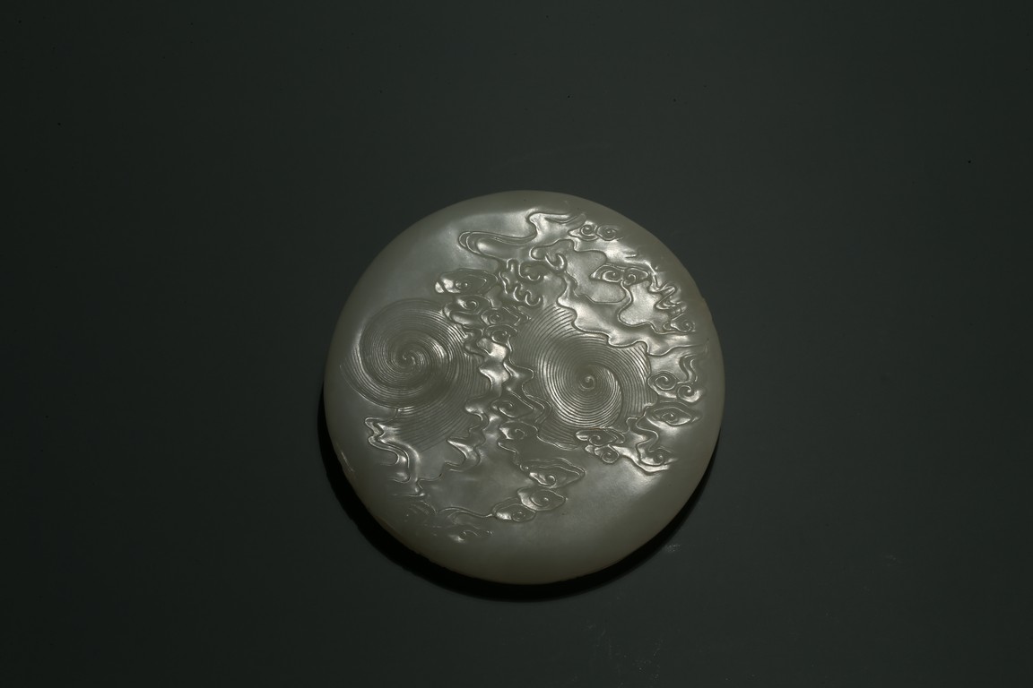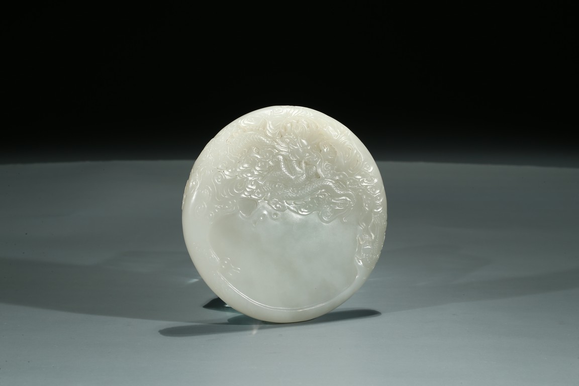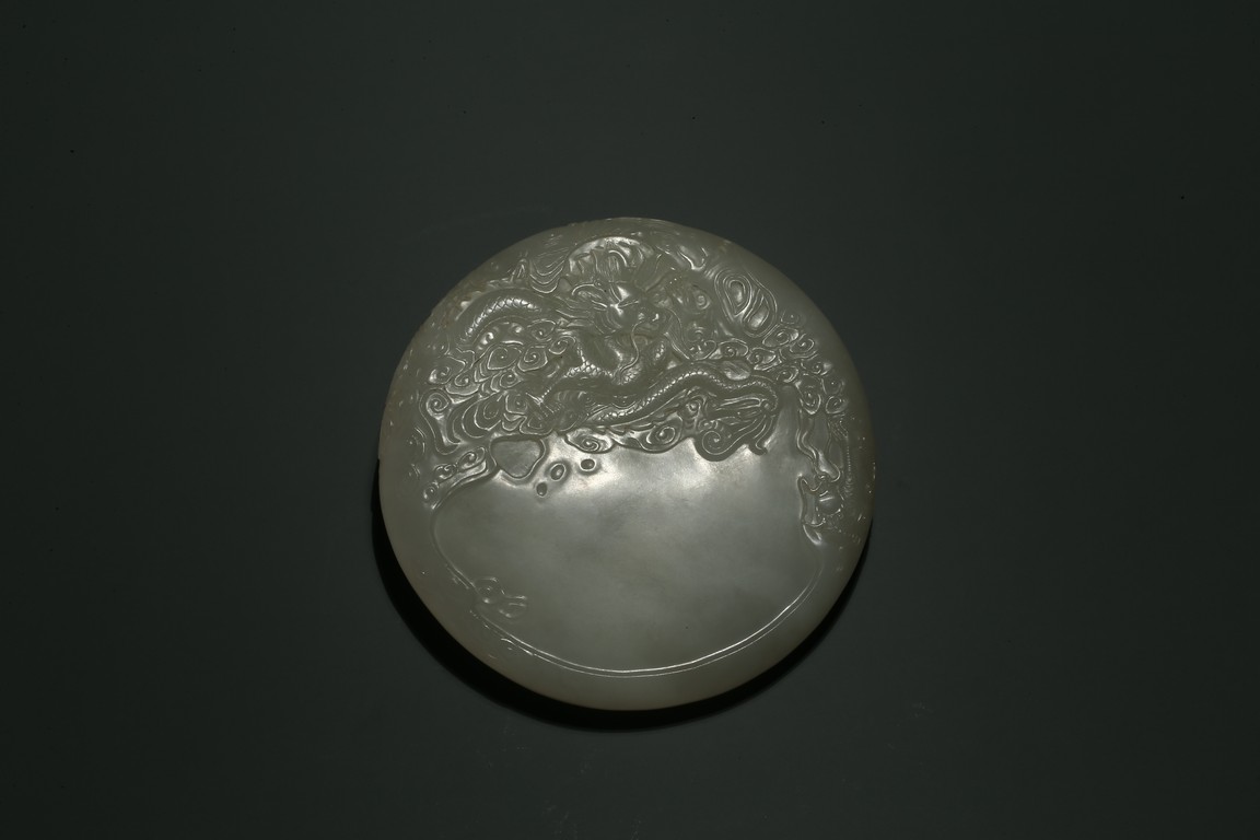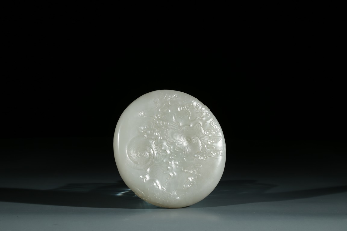 白玉清透均勻,潔白光瑩,溫潤細膩,包漿醇熟,呈圓形,淺浮雕雲龍紋,刻畫繁密而生動,龍騰雲湧,神龍身軀於祥雲之中若隱若現,飄忽不定,給人以氣勢磅礴,英氣逼人之感。