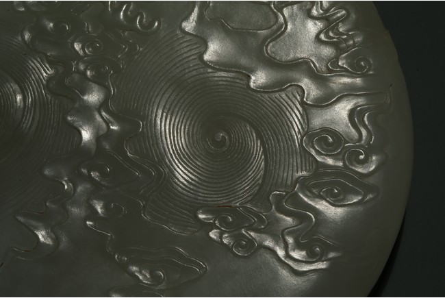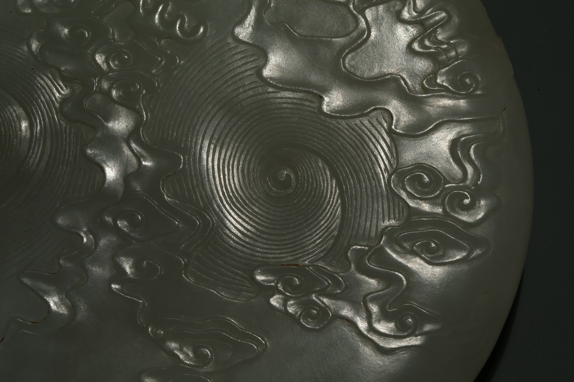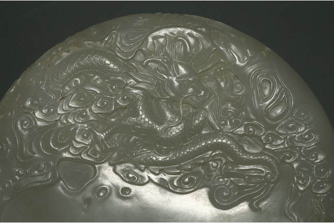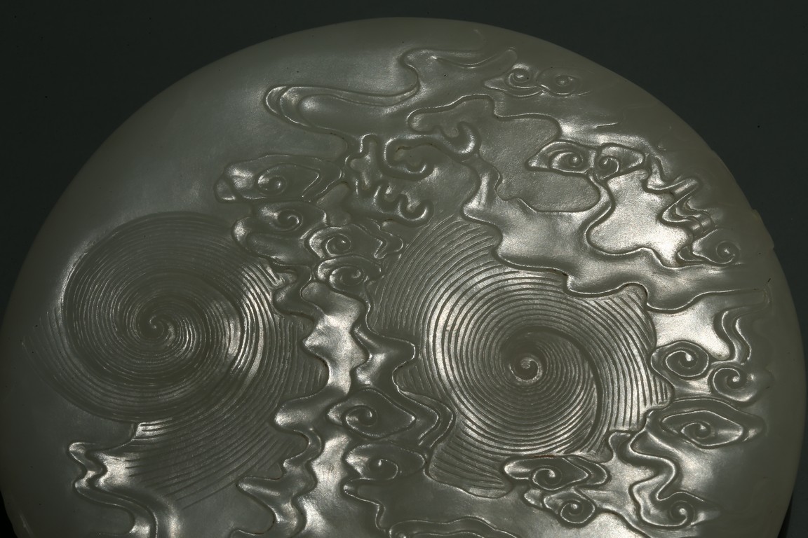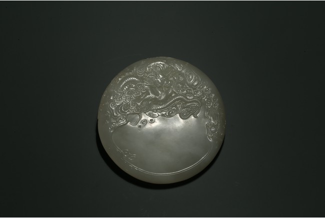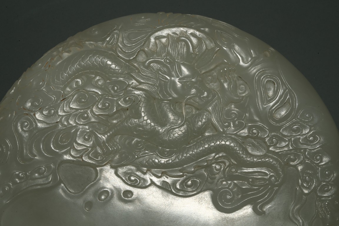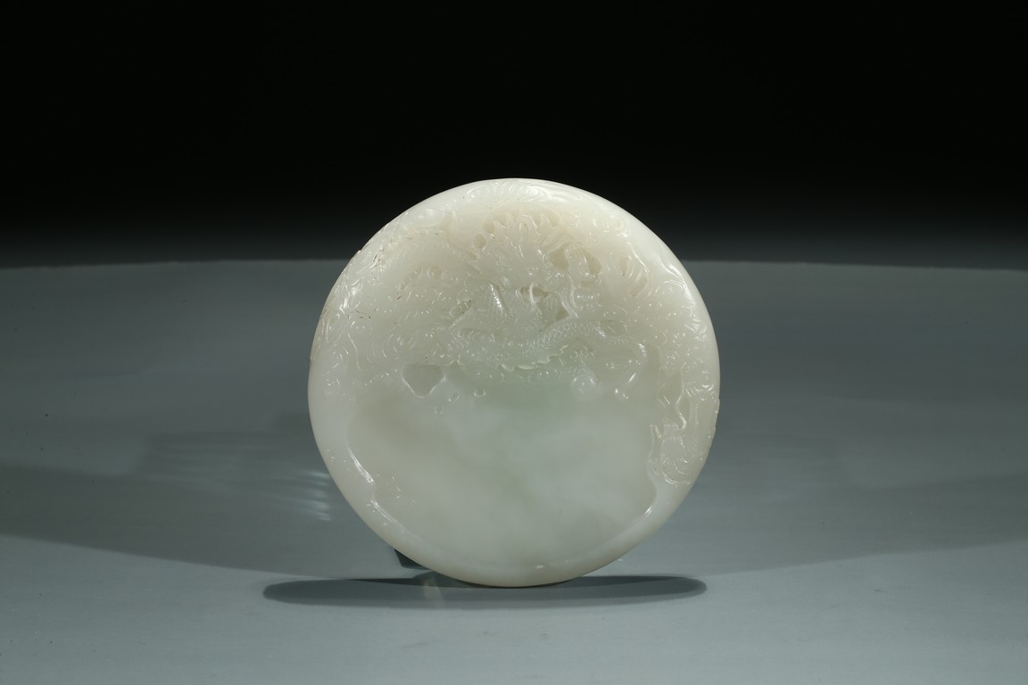 白玉清透均勻,潔白光瑩,溫潤細膩,包漿醇熟,呈圓形,淺浮雕雲龍紋,刻畫繁密而生動,龍騰雲湧,神龍身軀於祥雲之中若隱若現,飄忽不定,給人以氣勢磅礴,英氣逼人之感。