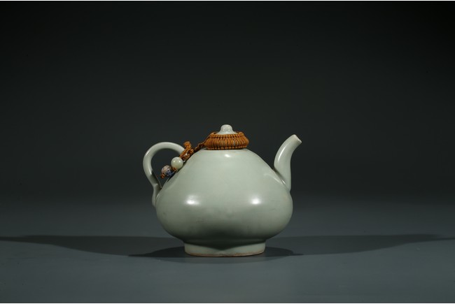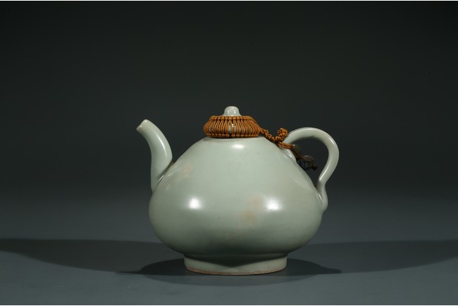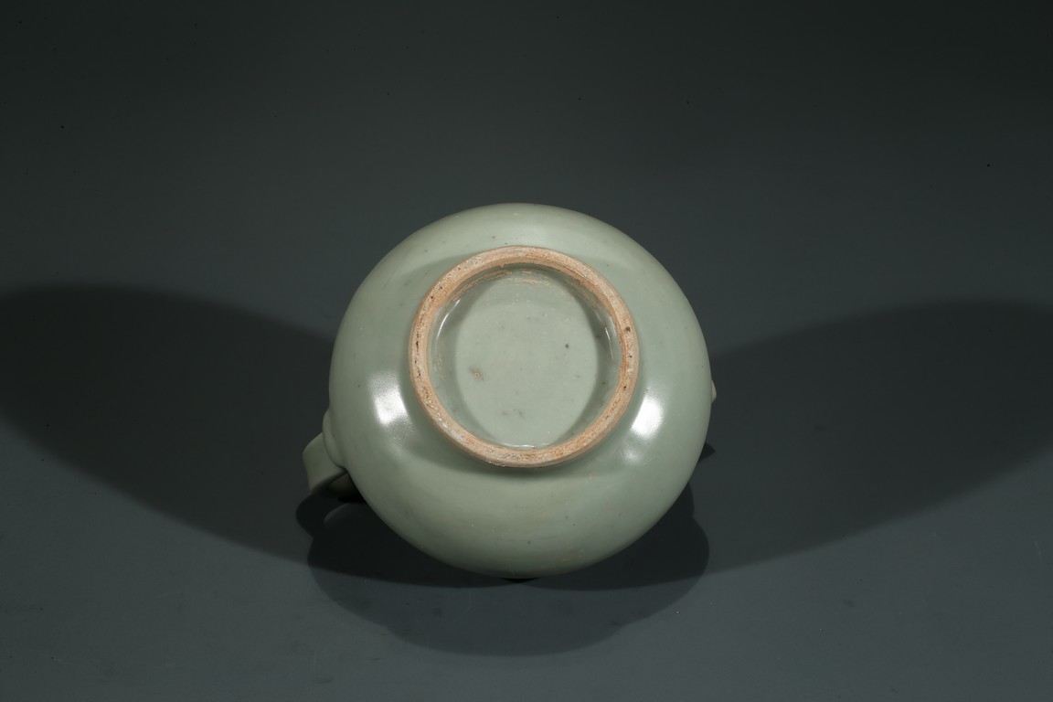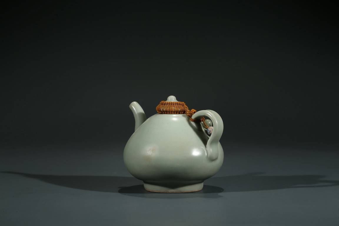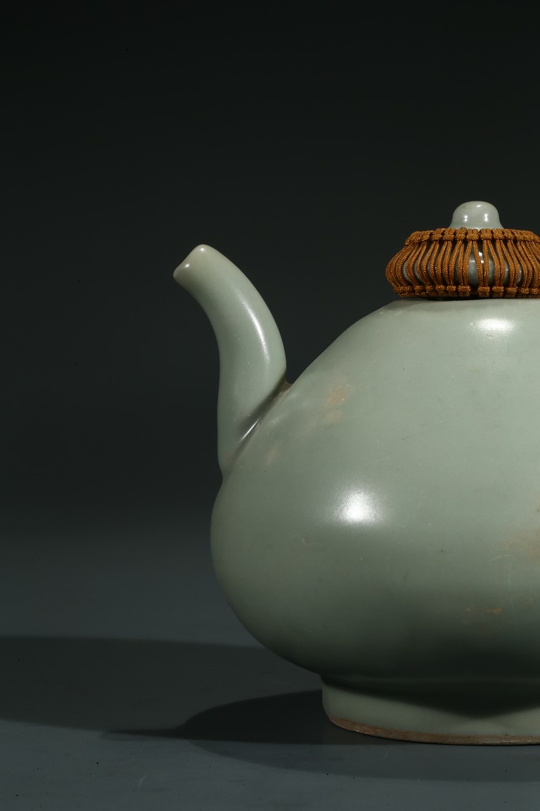 壺蓮子蓋,口下漸豐,圓腹下斂,圈足。壺一側有曲狀長流,相對一側有曲狀起棱帶形把柄,口、足邊露胎,通體施青釉,釉質光澤素雅、勻淨、溫潤,此執壺線條流暢,收放適度,造型優美。其釉面勻淨,釉色粉青,美若天然古玉。
