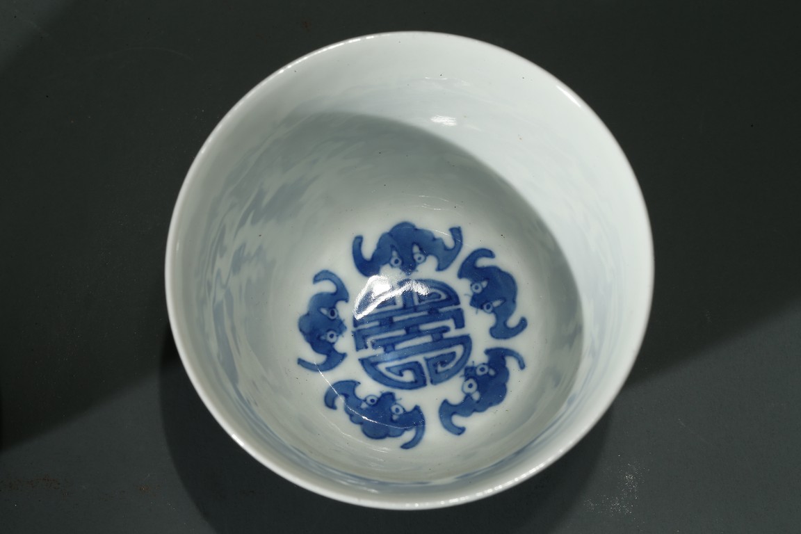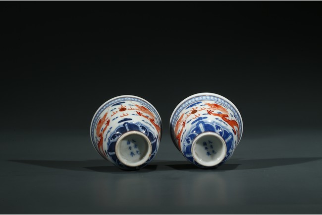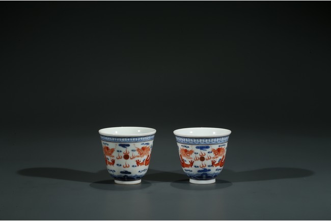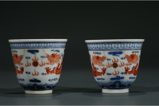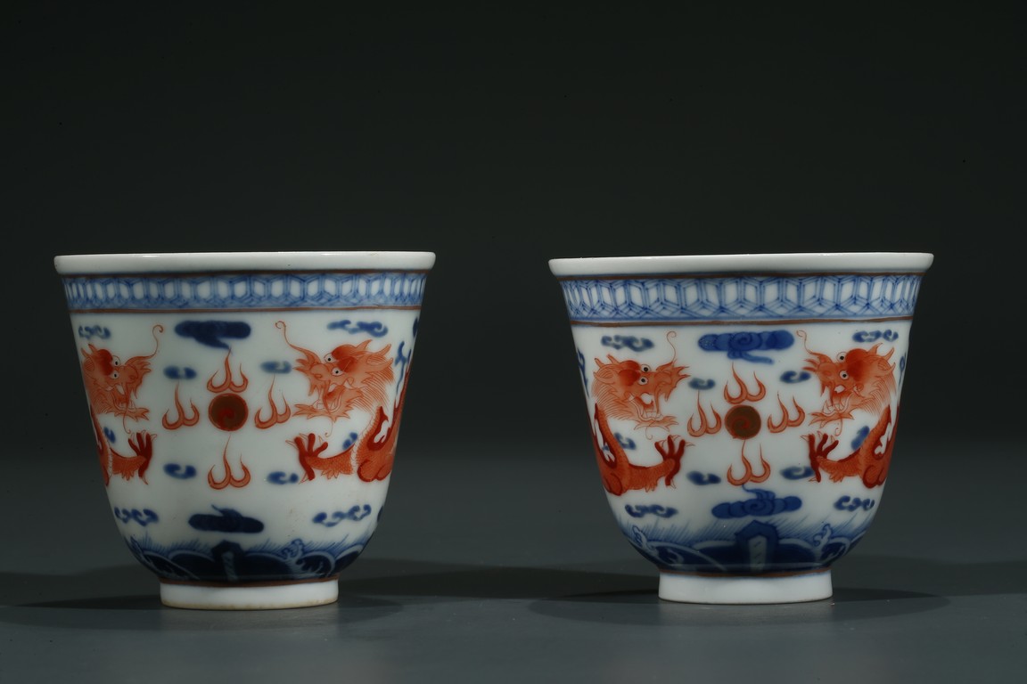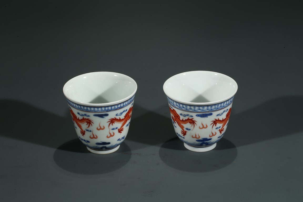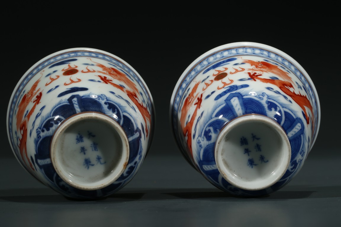 Qing Dynasty Guangxu period. Each decorated with dragons in underglaze-red chasing flaming pearls above waves, below a band of geometric pattern around the mouth rim, the interior painted with shou character flanked by five bats, the base inscribed with six character Guangxu mark.