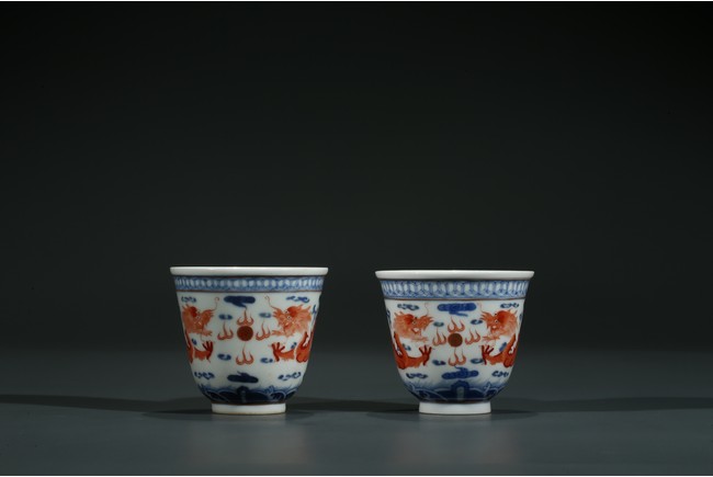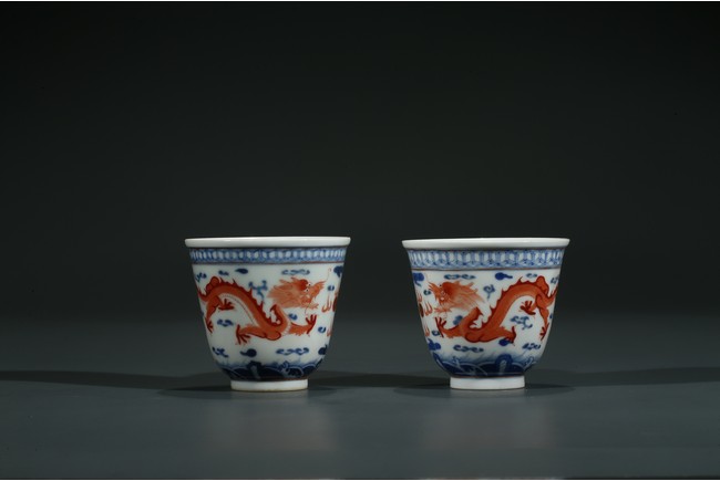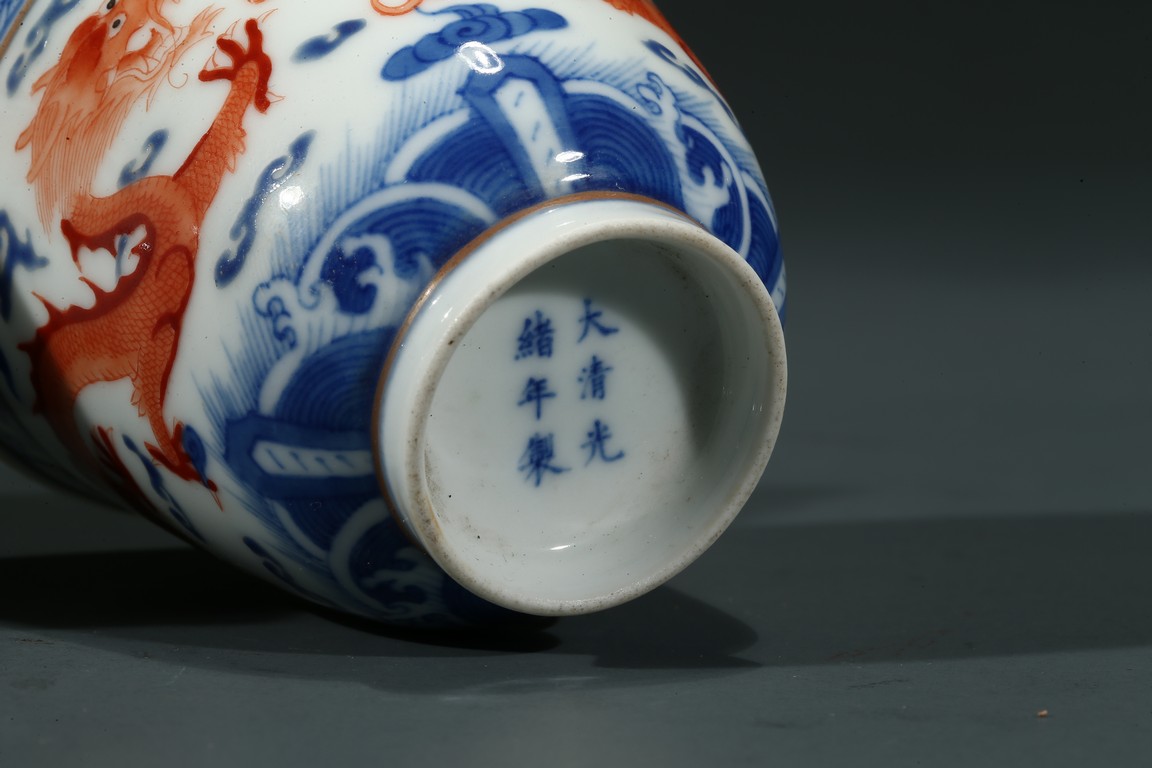 器形輕巧秀麗,白釉溫潤。口沿繪青花線,外壁繪礬紅戲珠龍紋,礬紅顏色濃艷,龍身雄碩遒勁,氣勢如虹,繪製手法嫻熟老練。“大清光緒年制”款識。