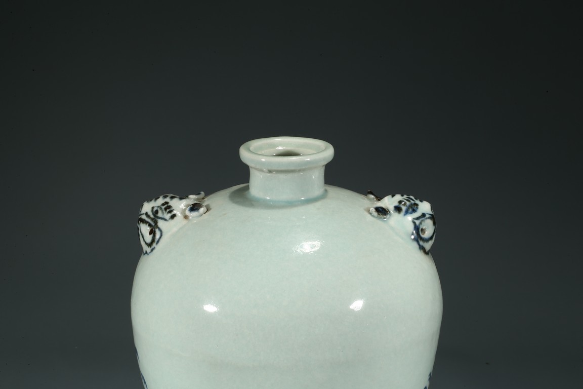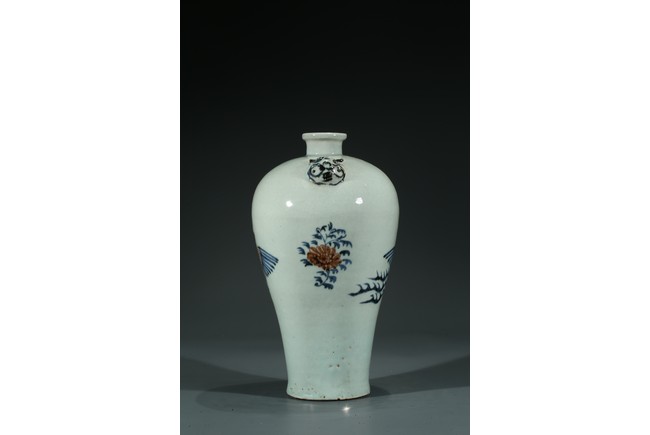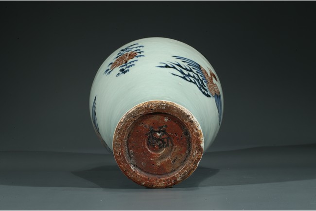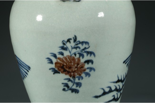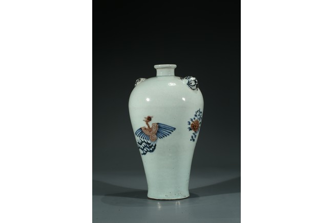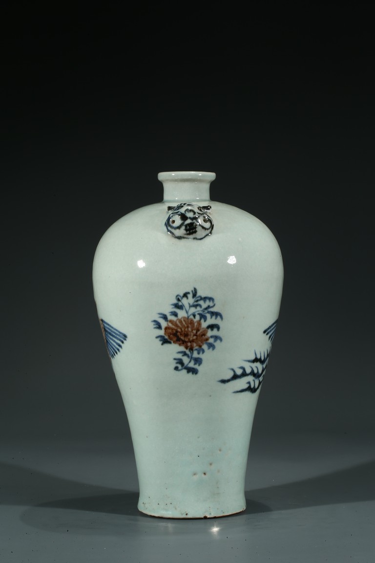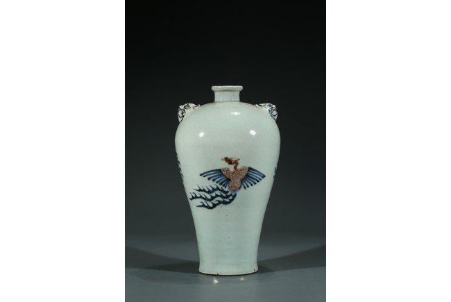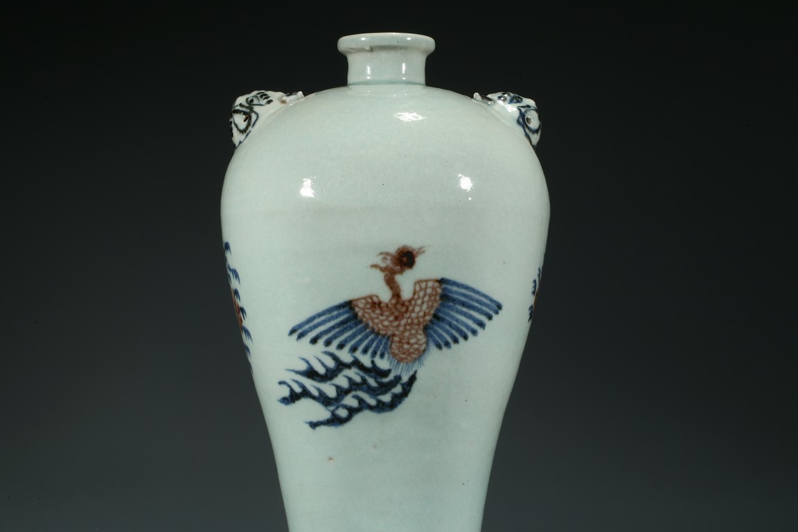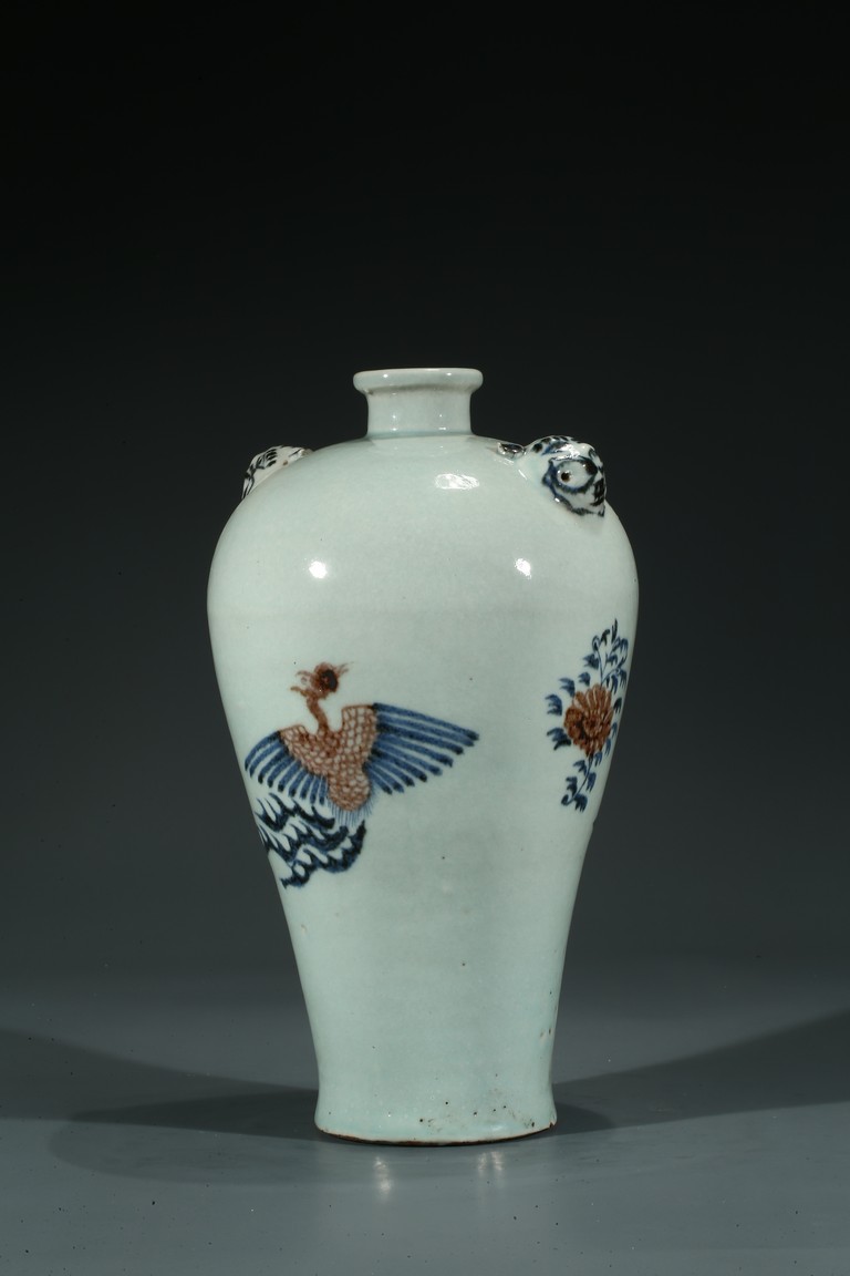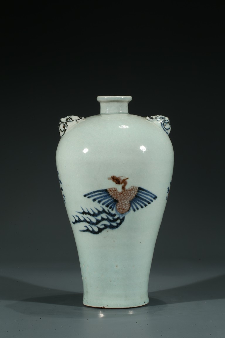 梅瓶一詞,乃后冠之名,此形自唐已有,趙宋初興,元後延盛。其圓肩小口,上寬下斂,形姿優雅雋永,風靡千年不衰。梅瓶初為酒罈以用,至元明之時,梅瓶或仍為盛酒之皿,但又因梅瓶細口圓肩,尤為雅緻,漸為插花陳設之用。此器小唇口,短頸,豐肩,斂腹,形制規整,器型秀巧,雙獅耳。器身青花釉裡紅繪鳳鳥紋,鳳鳥展翅飛翔,鳳尾舞動,畫面動感十足。