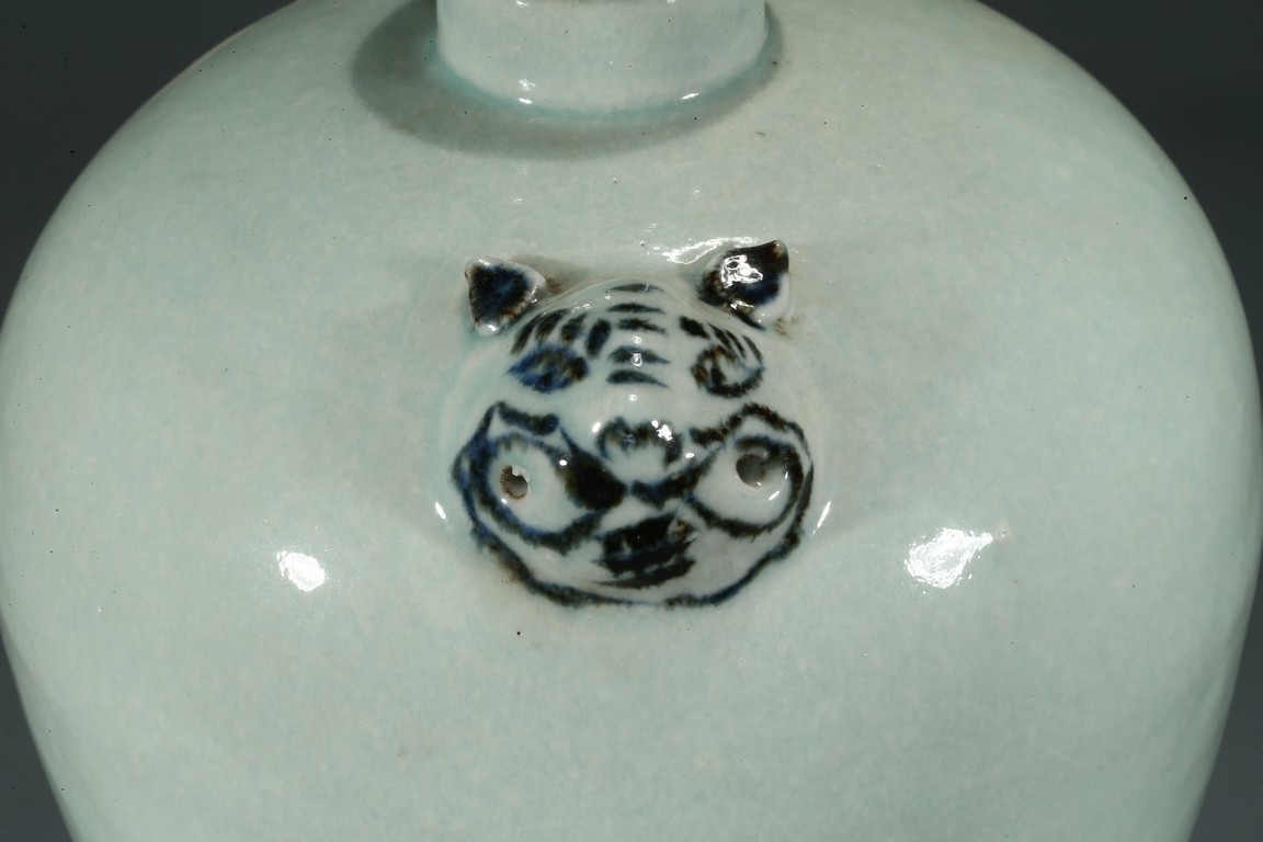 Rising to a rounded shoulder, the body painted in underglaze red and blue and white to depict flying phoenix and leafy peony around the exterior, the shoulder flanked by a pair of raised tiger head handles, the base left unglazed but painted with a 'fu' character, meaning auspicious.
