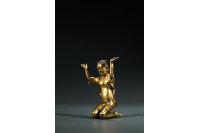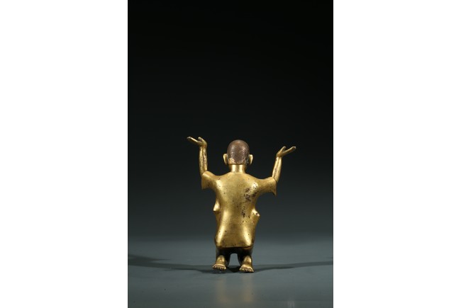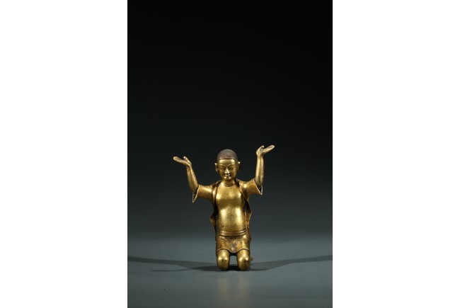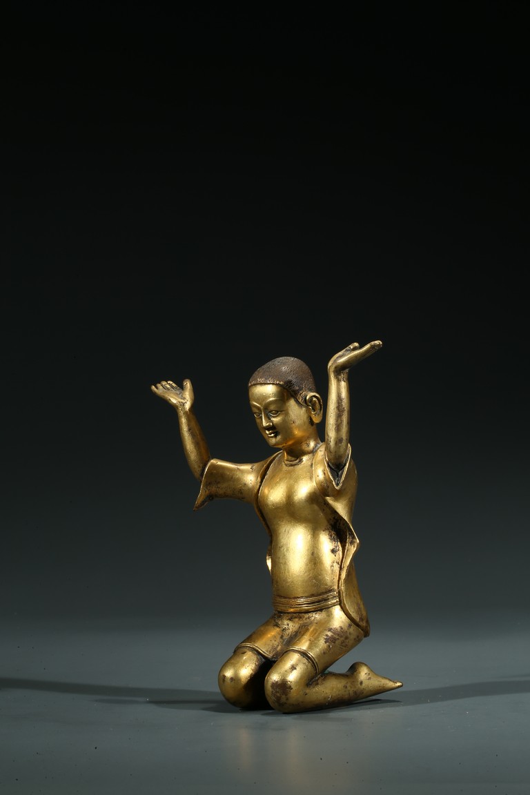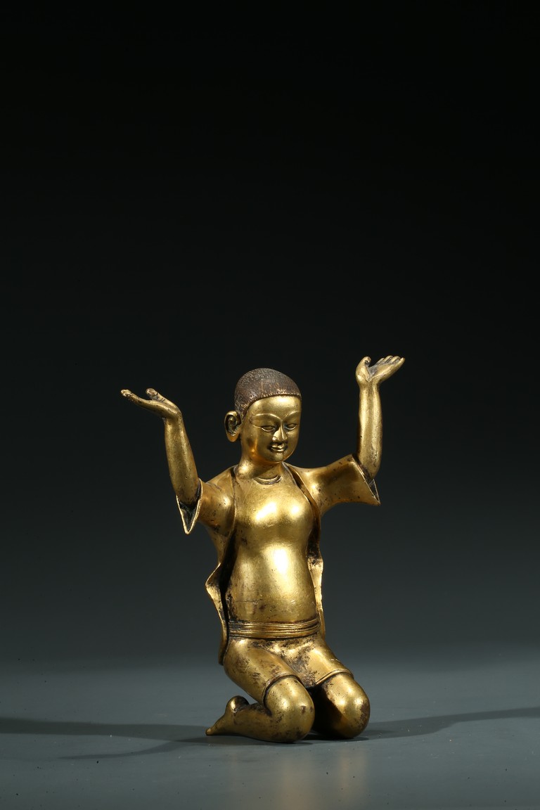 面相方圓,彎眉細眼,嘴角微微上翹,面帶微笑,袒上身,下身著裙,雙手上舉,作跪拜狀。造像整體製作精細,銅質精煉,鎏金厚實,人物肌肉飽滿而富有彈性,具有高超的寫實技巧,整體形象生動,表現出極高的藝術水準。