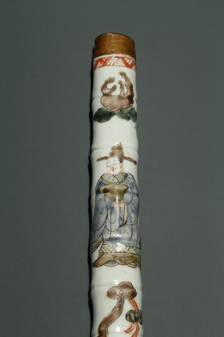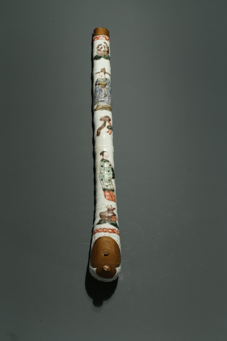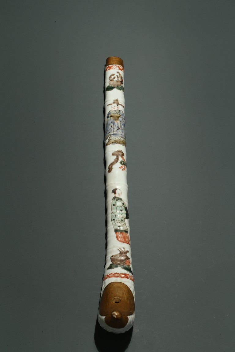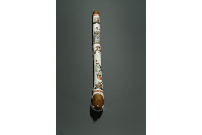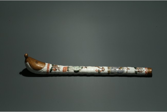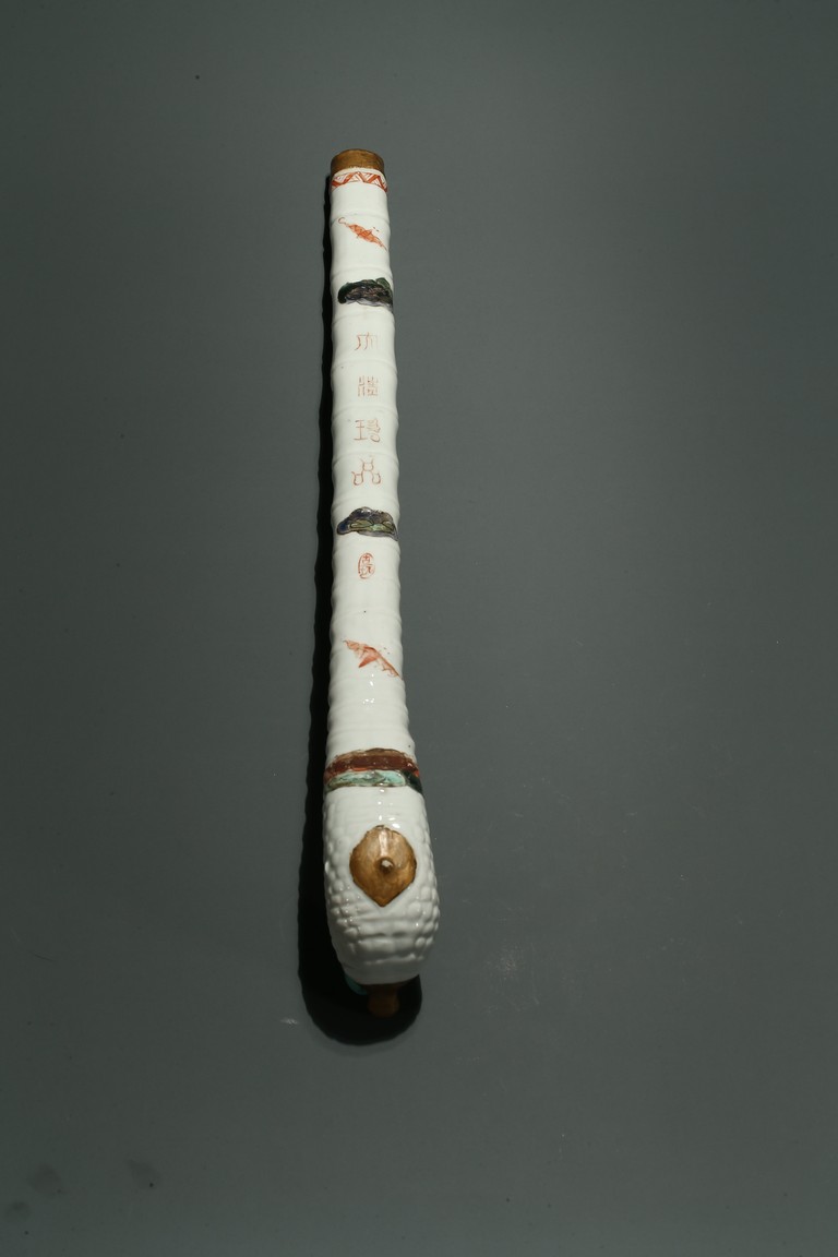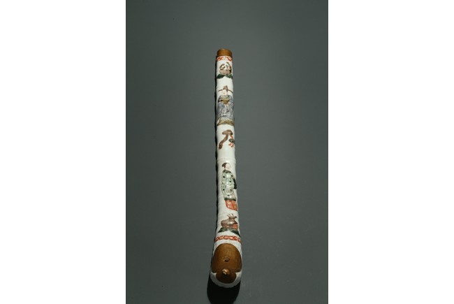 口部與尾部描金,器身彩繪“男女人物”“石榴”“靈芝如意”。寓意美好,寓意多子多福。