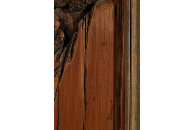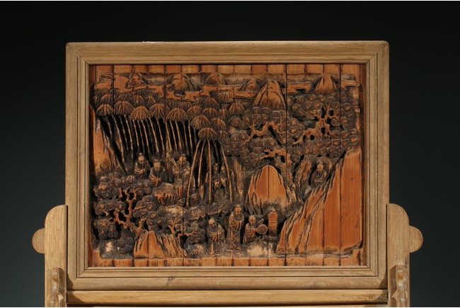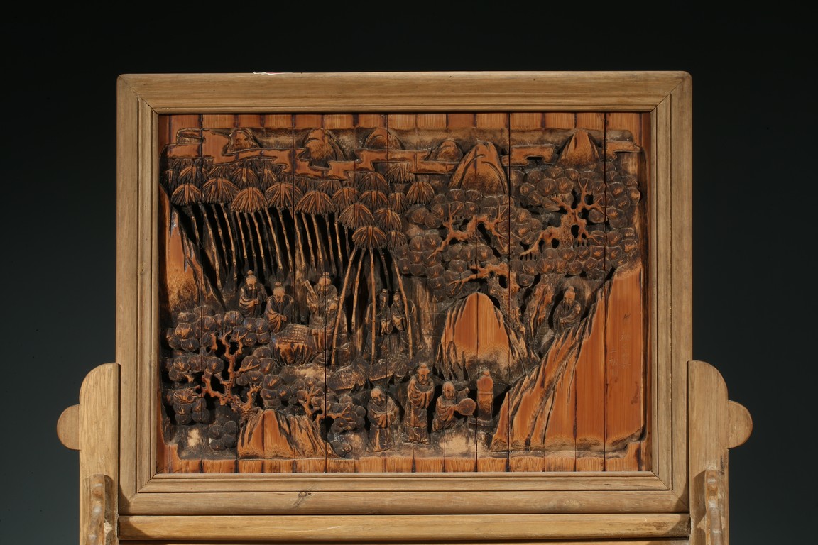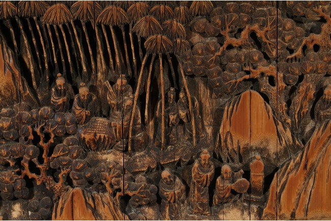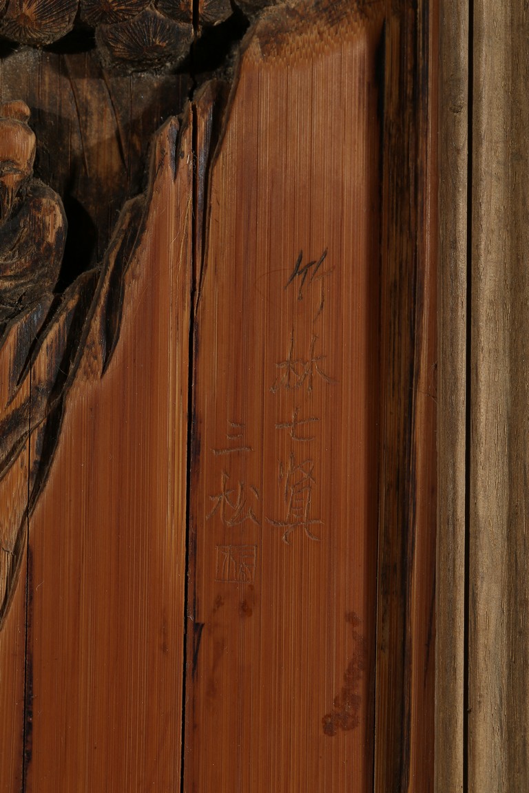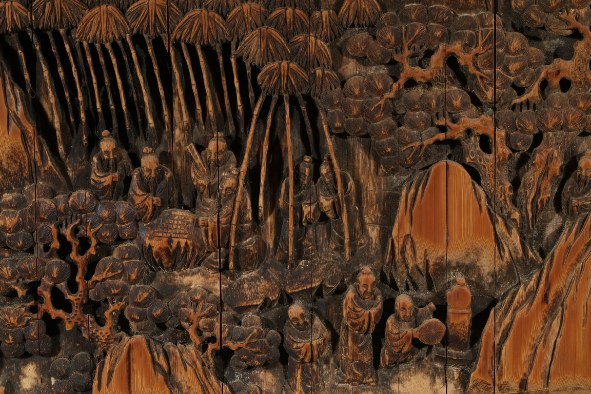 Qing Dynasty period. Of horizontal for, carved in relief to depict the seven sages of bamboo groves in row of vertical bamboo panels, all enclosed within wood frame.