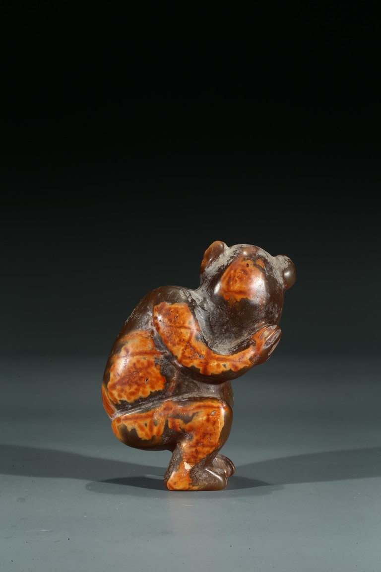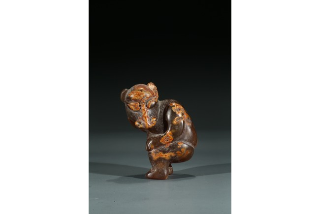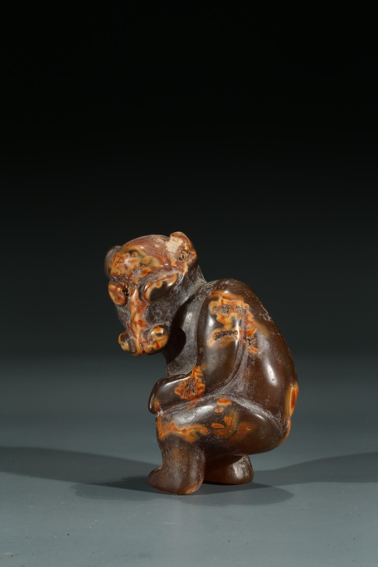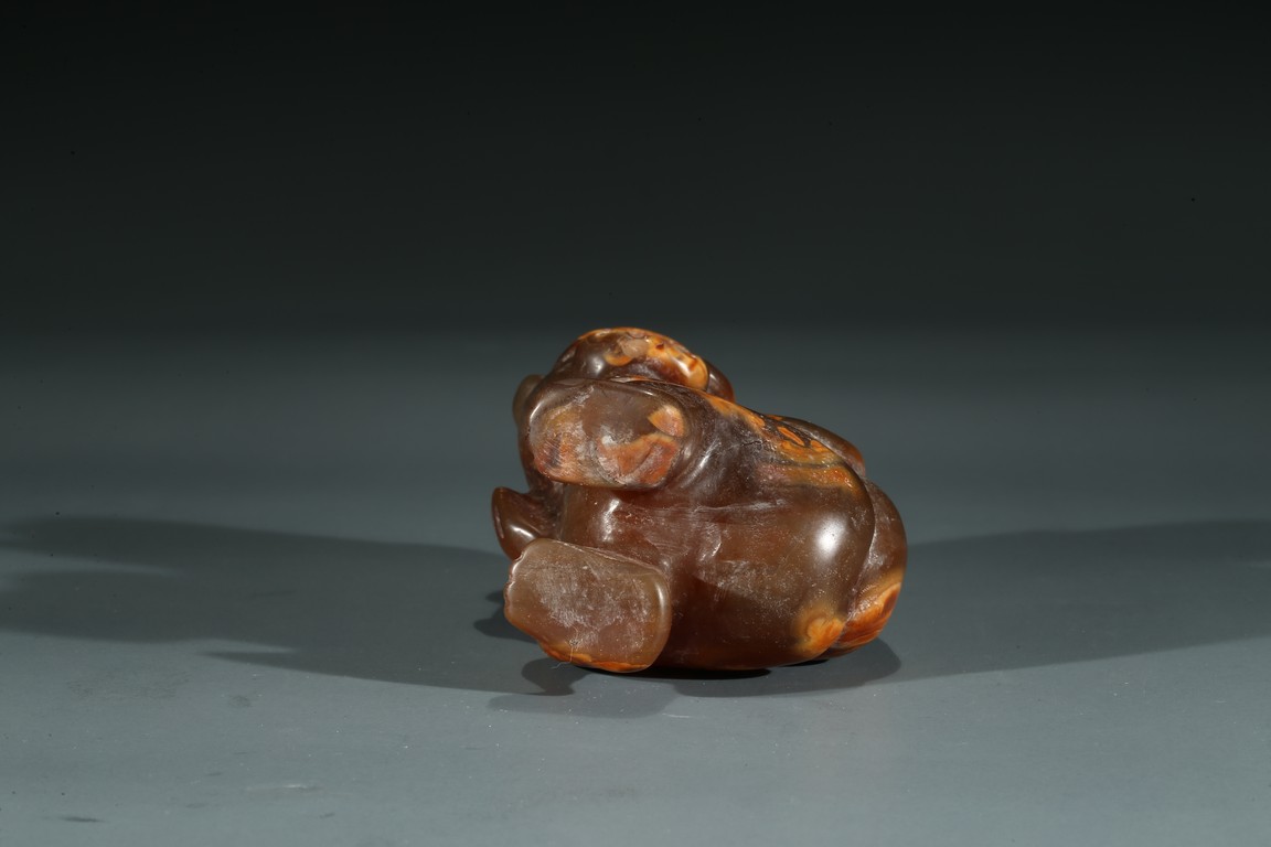 褐色玉圓雕制成,局部帶黃色沁色,作側回首狀,寬鼻杏眼,神情自然,手腳健壯,整體造型憨厚可掬,栩栩如生。