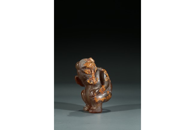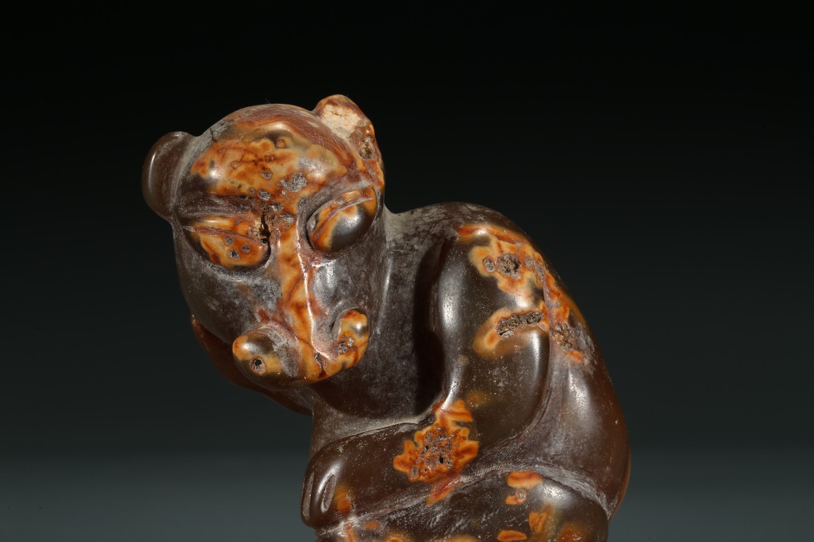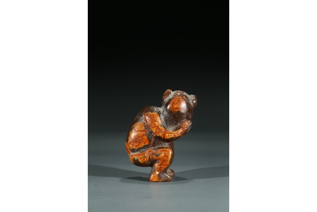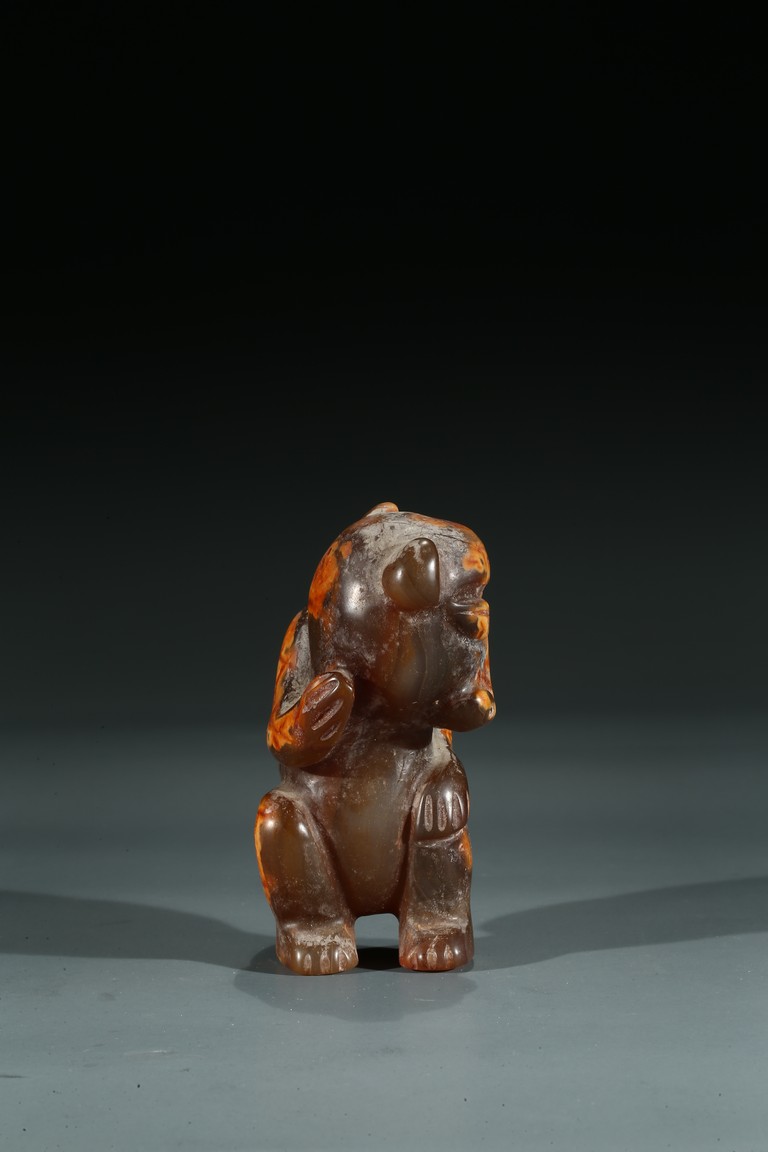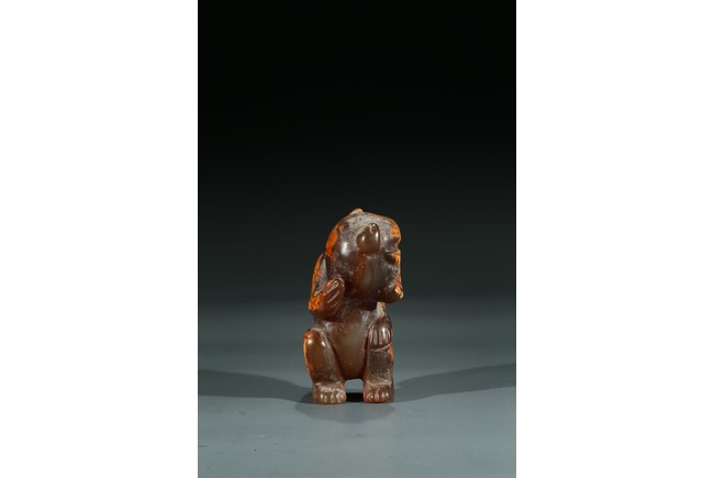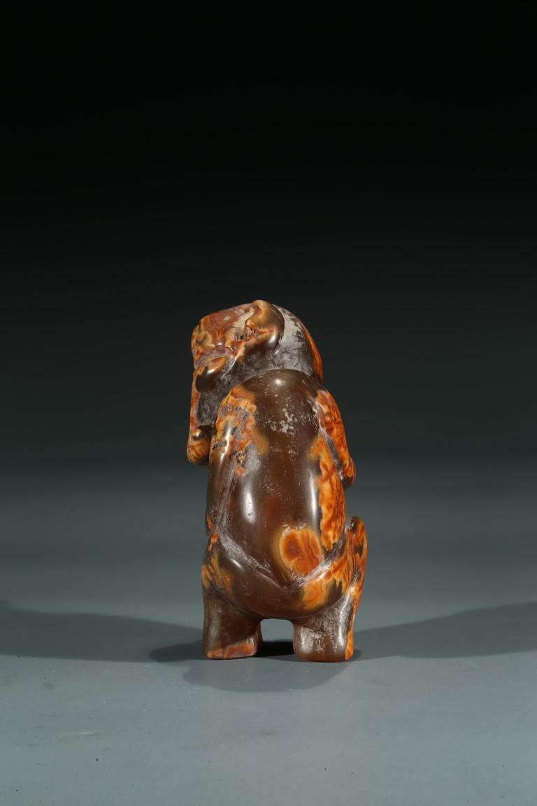 褐色玉圓雕制成,局部帶黃色沁色,作側回首狀,寬鼻杏眼,神情自然,手腳健壯,整體造型憨厚可掬,栩栩如生。