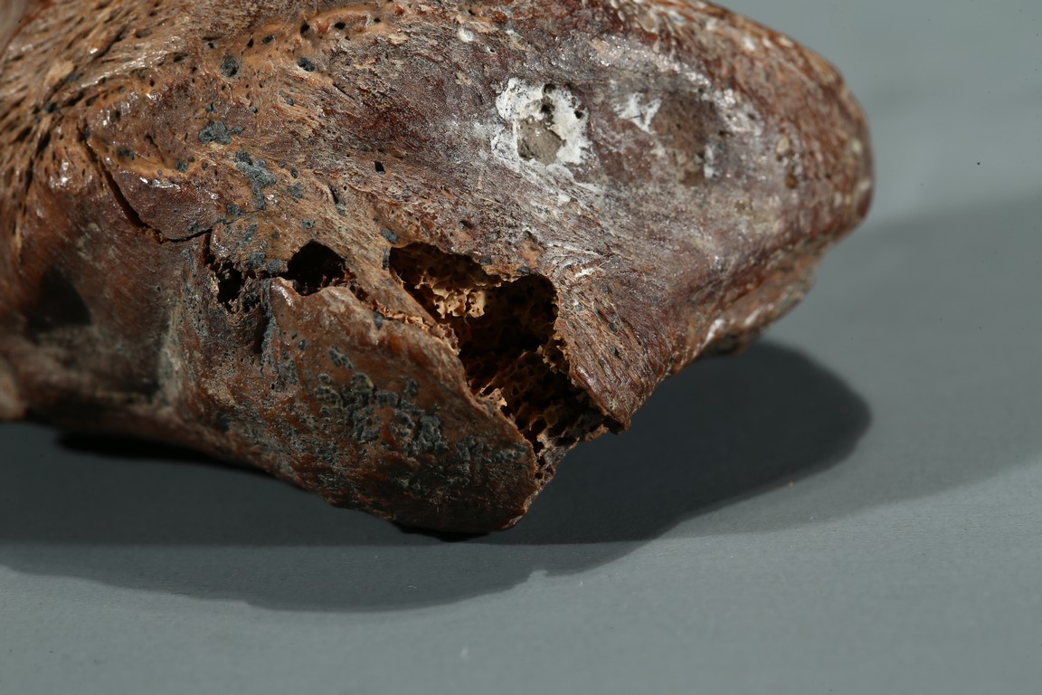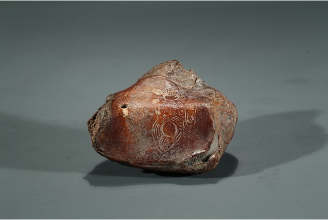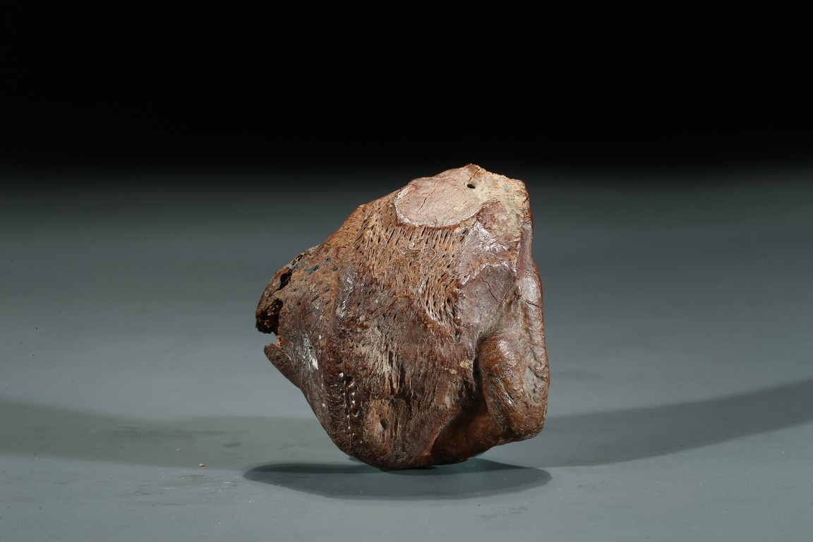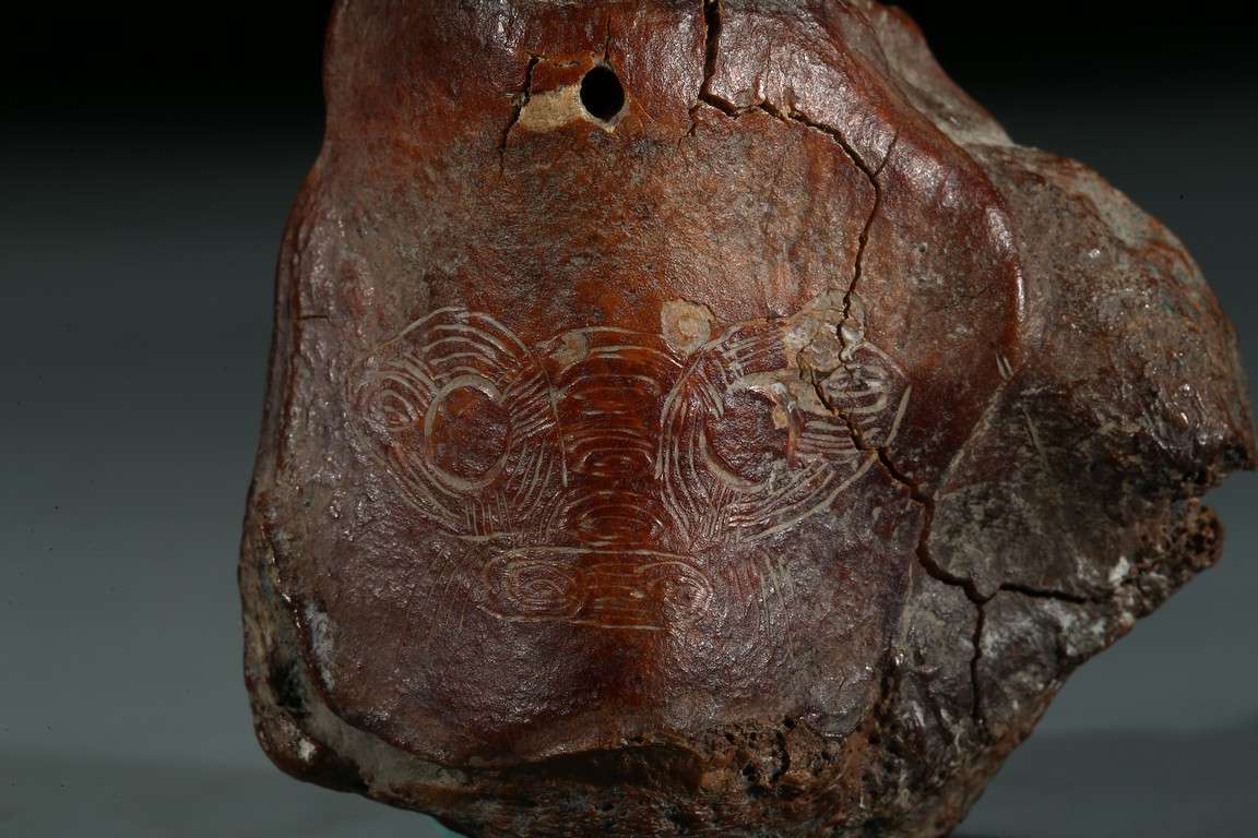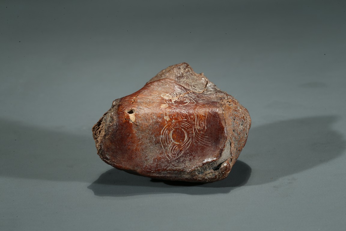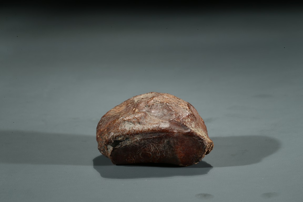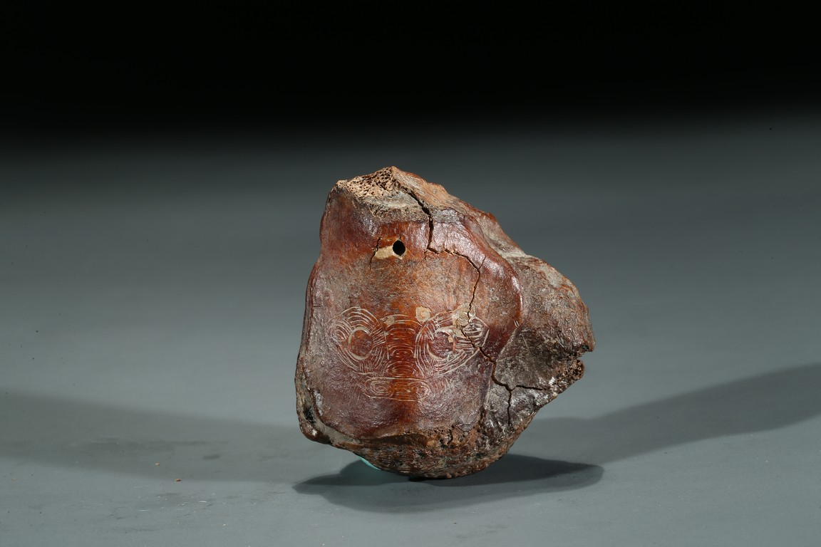 Probably Shang Dynasty period, the naturalistic bone remaining carved with archaic taotie mask pattern, possibly used for ritual purpose.