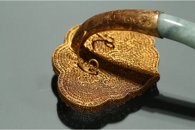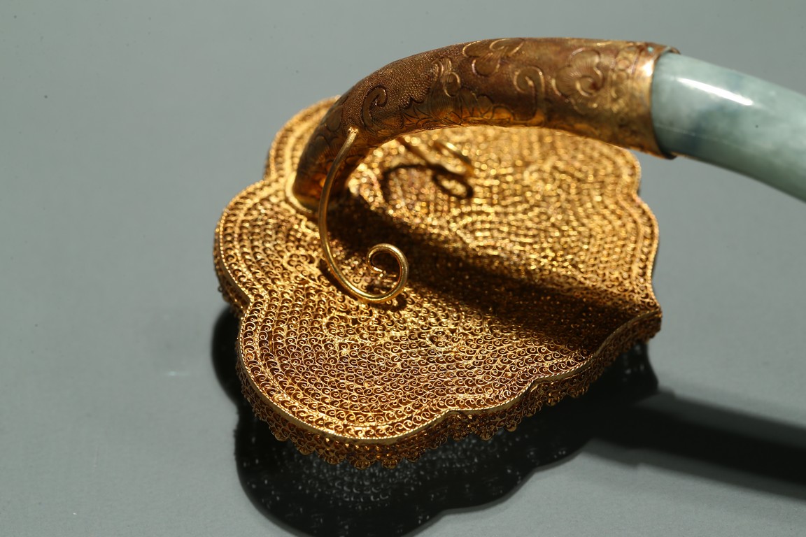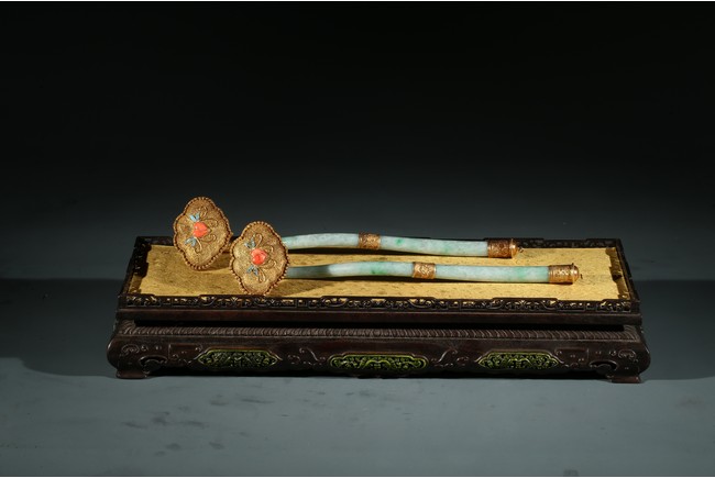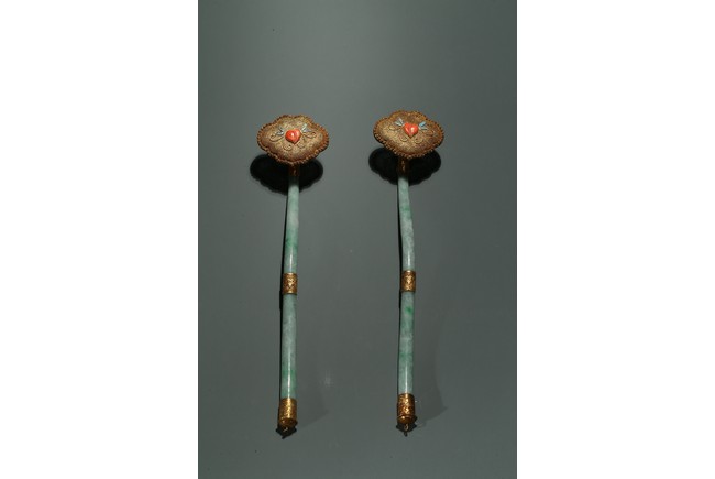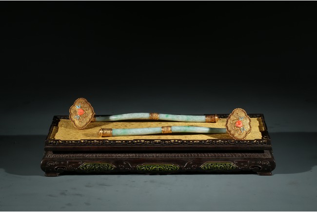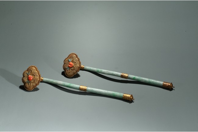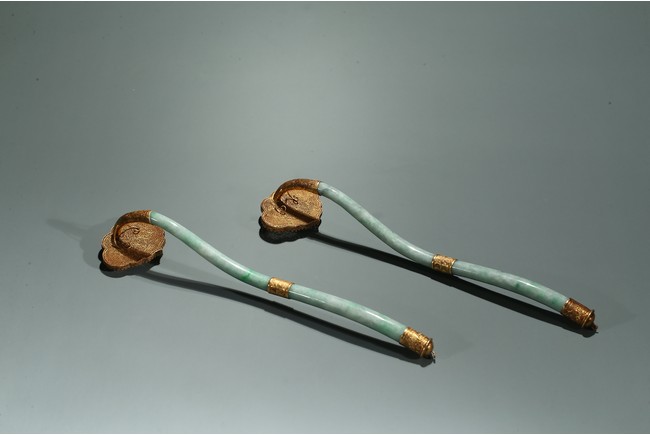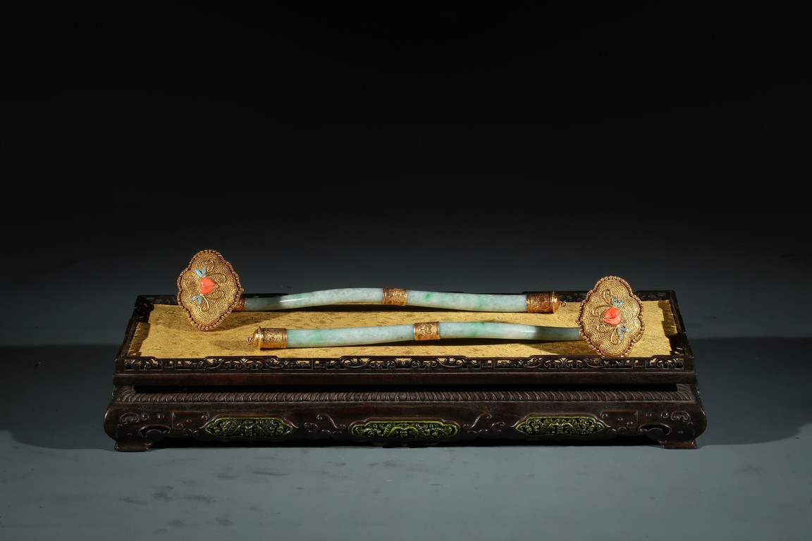 Provenance: Property from a private Dallas, Texas collection 來源: 德州達拉斯私人藏家收藏。此對如意造型流暢,以翡翠為主材,採用累絲、嵌寶等工藝,工藝複雜,精巧非凡。如意首為靈芝形,鎏金累絲而成,正面鑲嵌珊瑚壽桃圖案,寓意福壽吉祥,柄身為翡翠材質,翠色通透。如意尾以鎏金片包裹,鏨刻花卉祥雲紋。如意,又稱“握君”、“執友”或“談柄”,其形魏晉時既已出現。後逐漸演變為象徵吉祥的禮物或陳設品,明清時期尤其受到宮廷喜愛,帝王寶座、寢殿均可見各式如意,以示吉祥、順心。