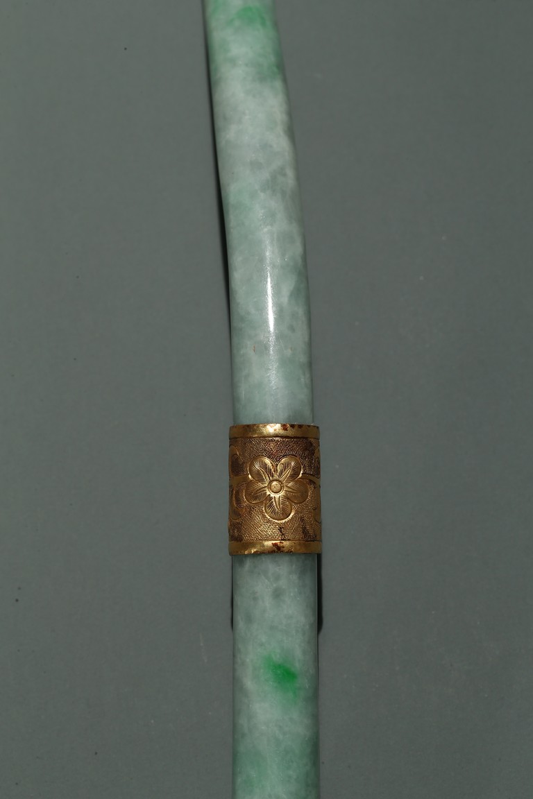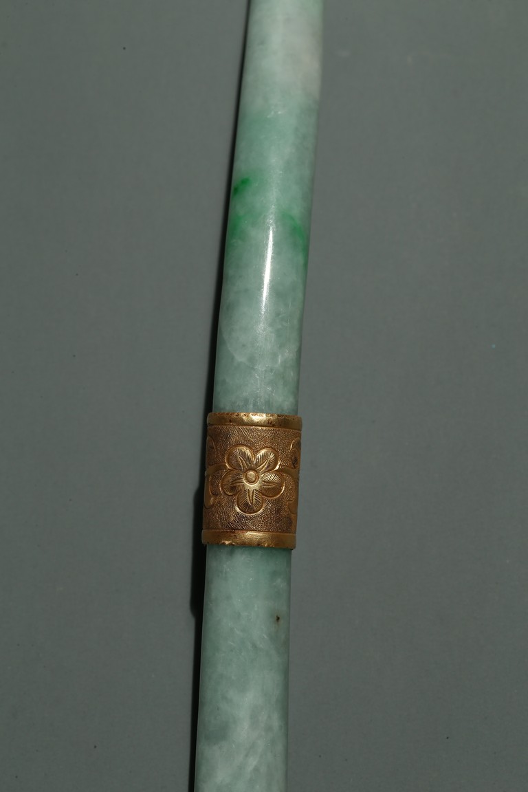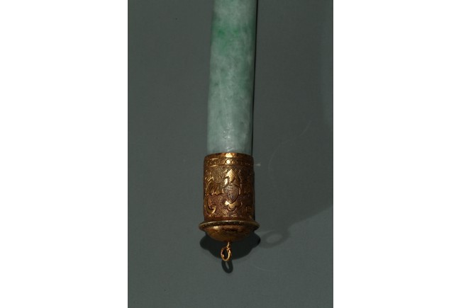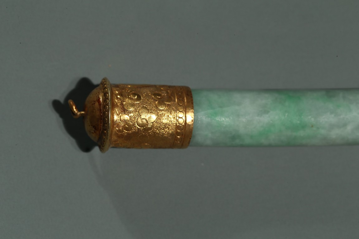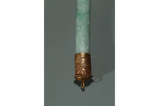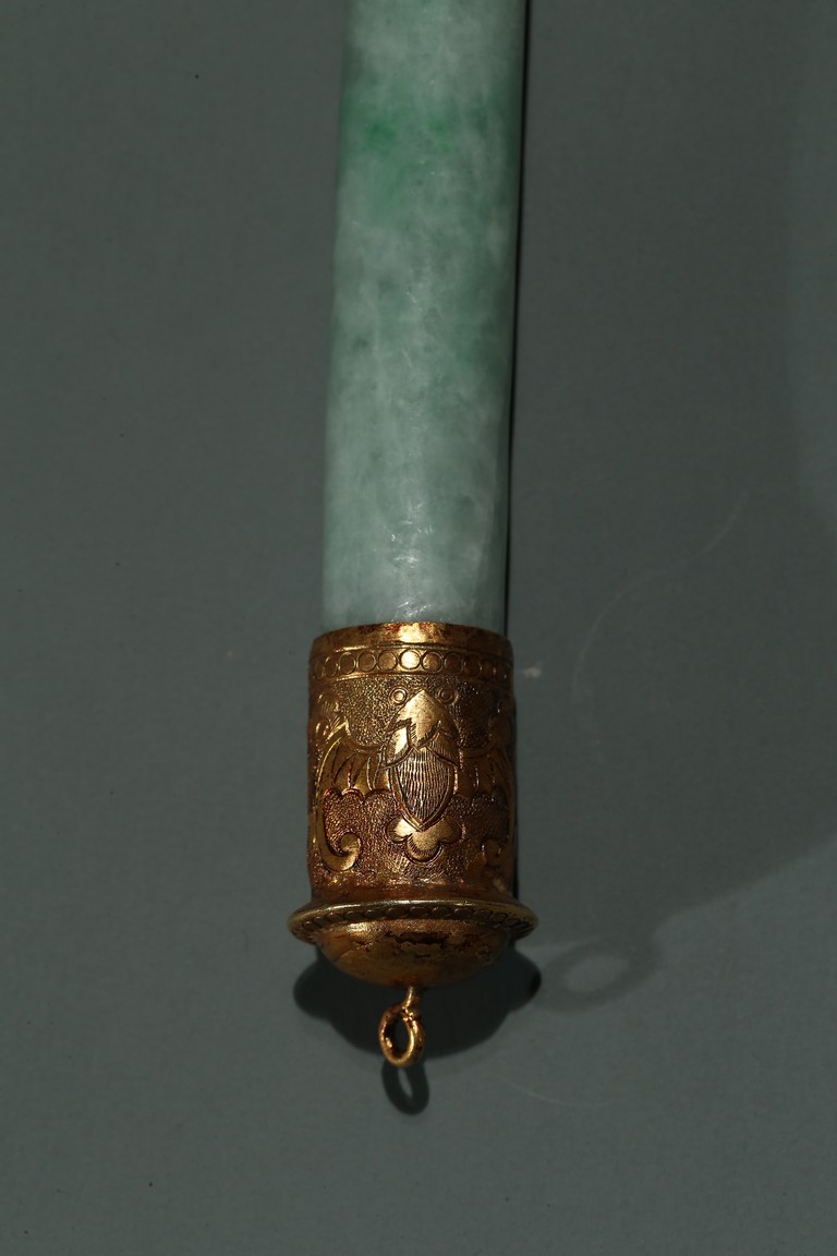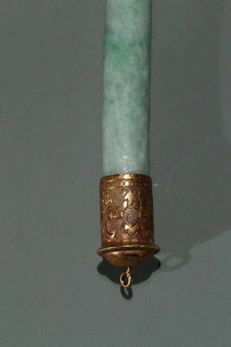 Each scepter with gilt silver head inlaid with leafy agate peach decoration, the slender handle carved in polished jadeite, the center and end protected with gilt bronze wrap, accompanied with a delicately carved zitan stand.