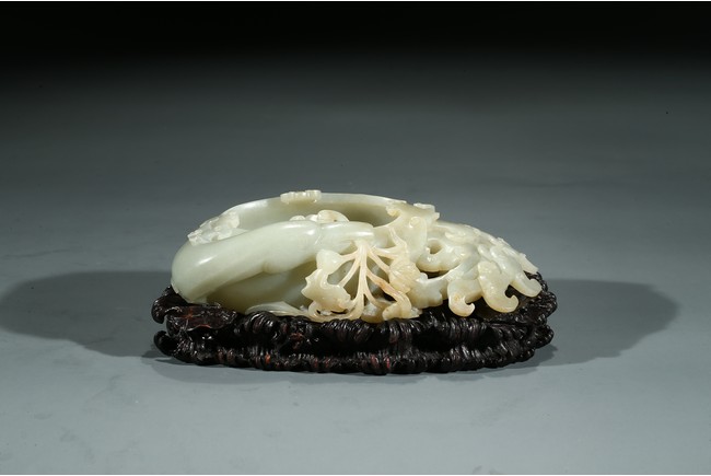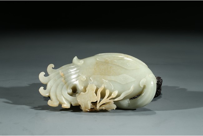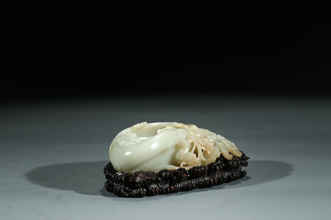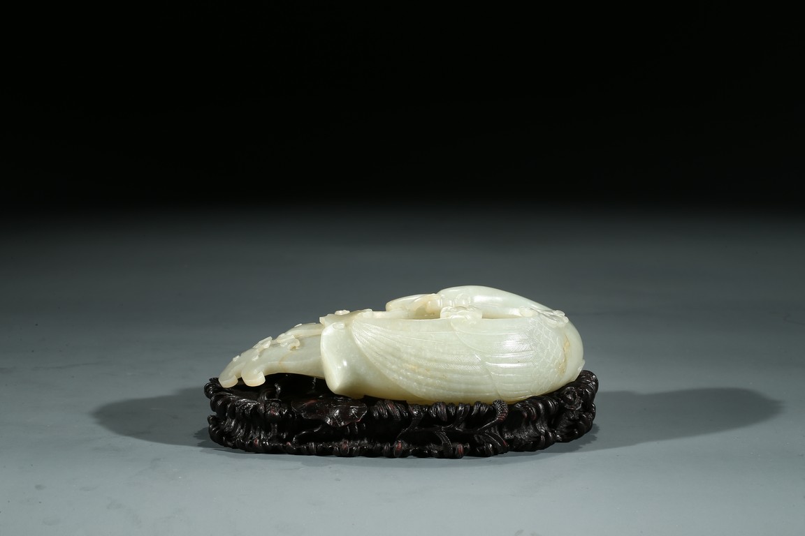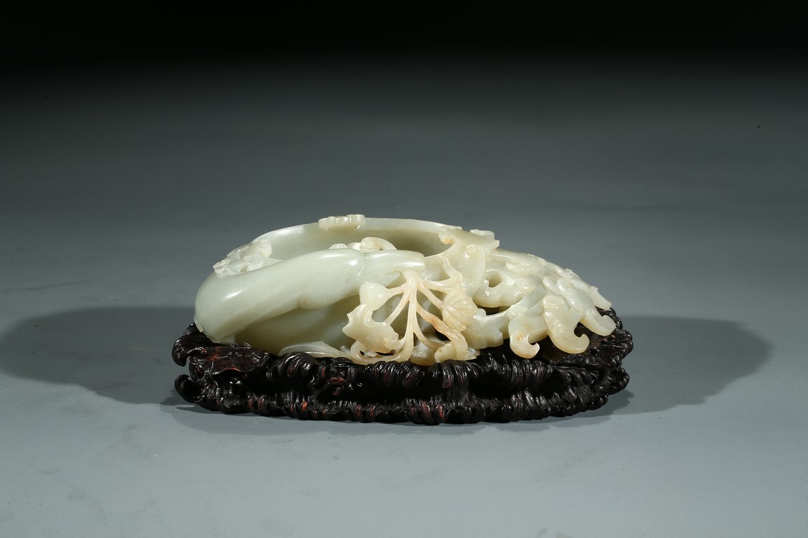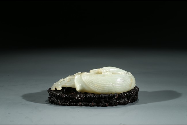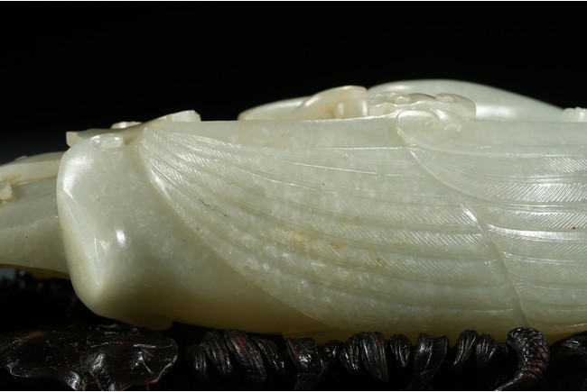 Carved recumbent in the form of hollowed washer, with its head turned to the side, its feet tucked beneath, its mouth grasping lotus sprigs between their beaks, all supported on hardwood stand.