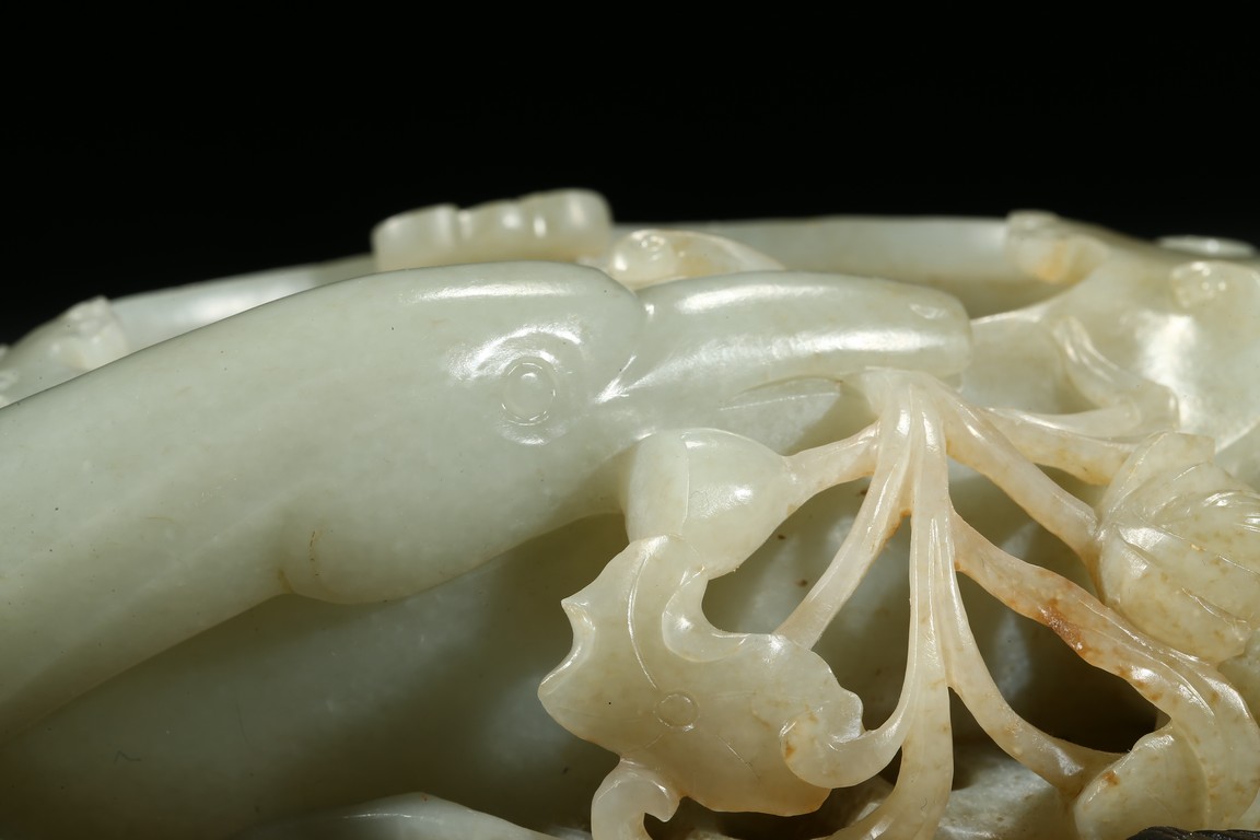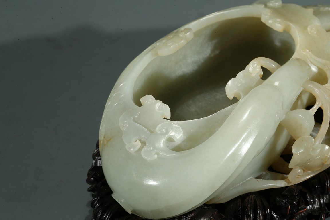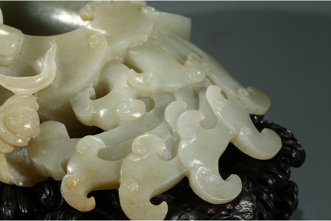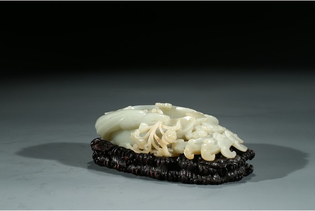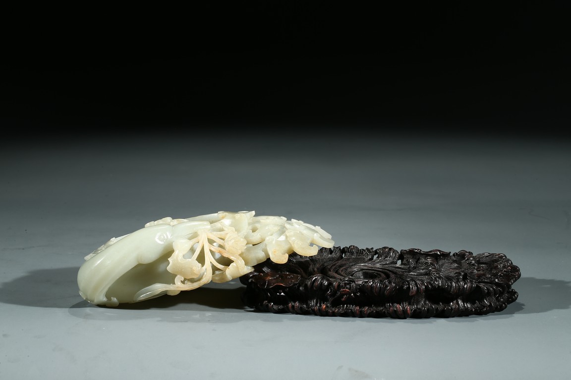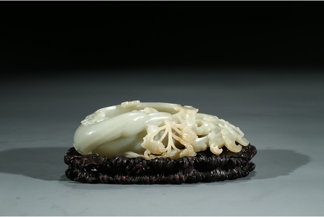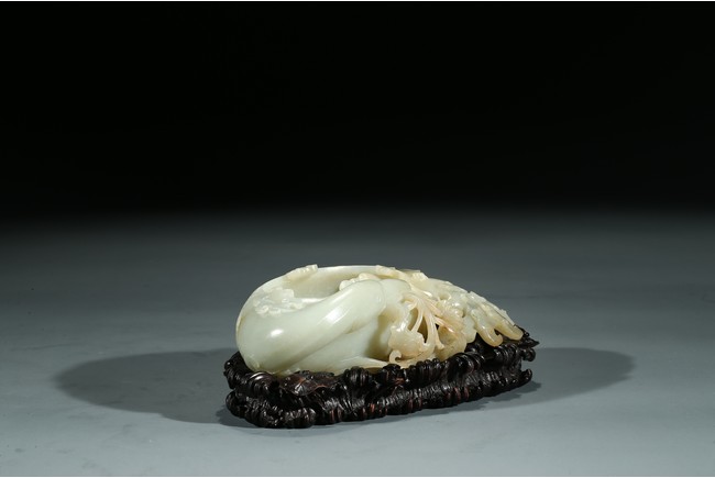 Carved recumbent in the form of hollowed washer, with its head turned to the side, its feet tucked beneath, its mouth grasping lotus sprigs between their beaks, all supported on hardwood stand.