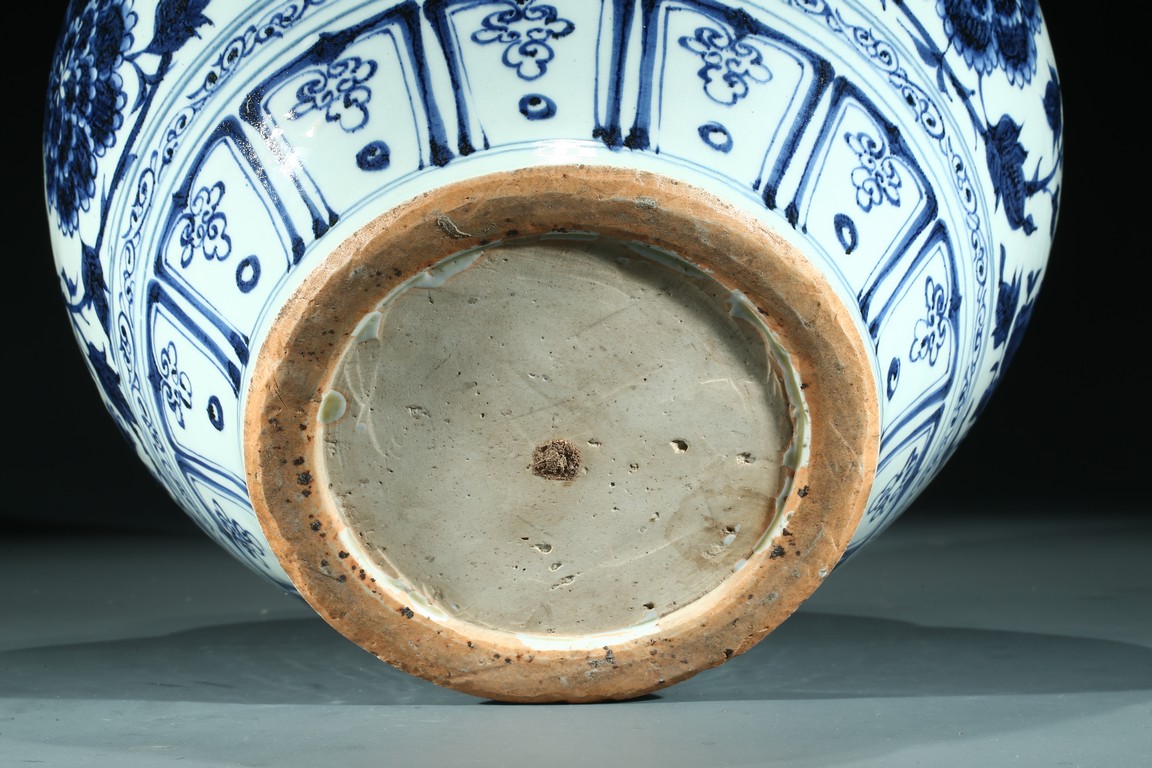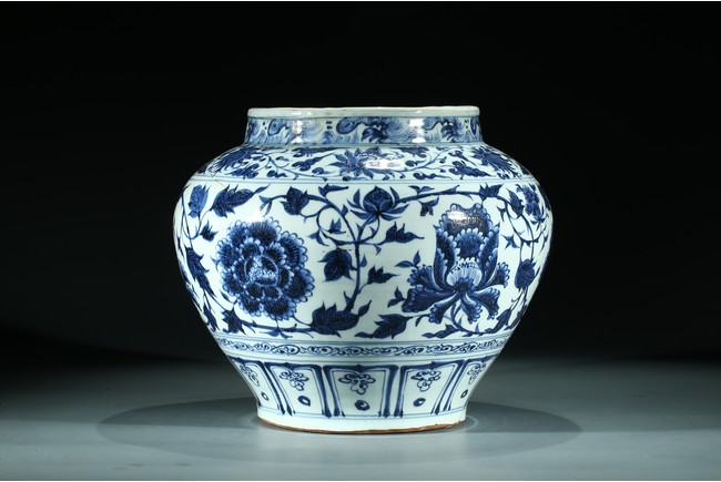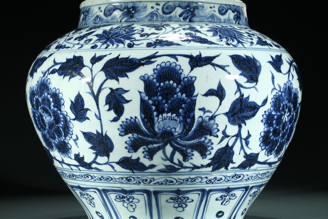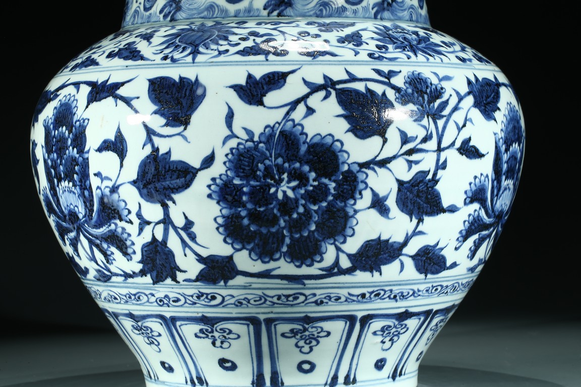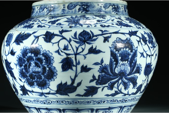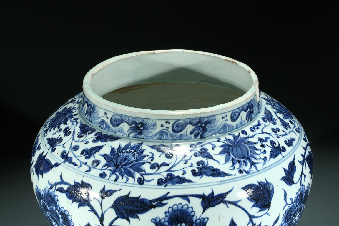 Provenance: Property from a private Dallas, Texas collection 來源: 德州達拉斯私人藏家收藏。此罐造型別緻,紋飾纖麗典雅,刻畫筆法精準流暢,製作工藝精細,在粗獷樸雅面貌風行一時的作品中,屬別開生面的上乘之作。此罐唇口,短頸,溜肩,鼓腹,圈足。罐身胎體白潤細堅,釉面肥腴,膩白閃青。通體以青花繪製五層紋飾,頸部繪海浪紋一週,肩部繪纏枝蓮紋一週,腹部繪以纏枝牡丹紋一週,腹下部與足脛部之間繪一圈卷草紋作分隔,足脛部繪蓮瓣紋一週。其青花髮色深沈含蓄,藍中泛黑,品貌俱佳,時代特徵明顯,精品佳作,唯有口沿一處殘缺,略帶遺憾。