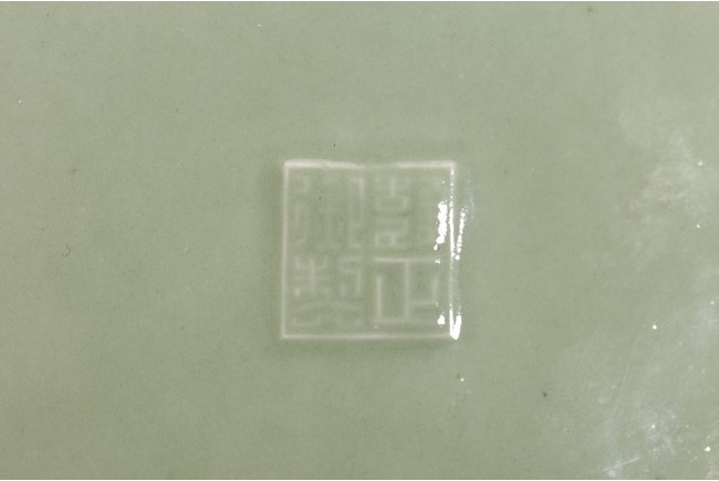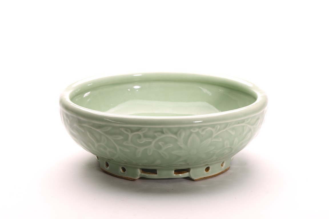 Qing Dynasty period. Of compressed circular form, the side moulded with floral decorations in shallow relief, the exterior suffused overall with attractive sea green tone, all supported on four shallow feet, base with a raised four character mark.