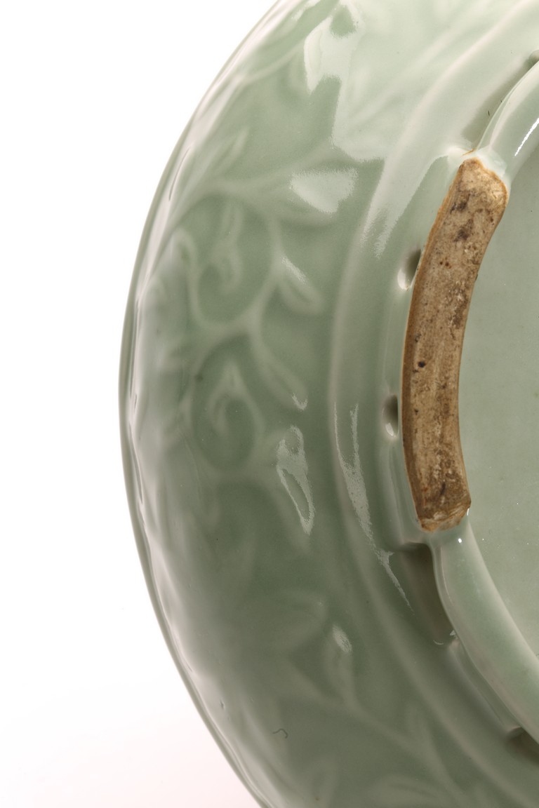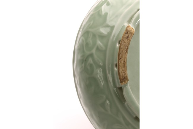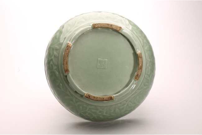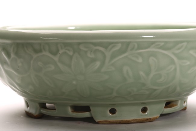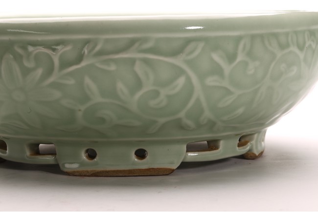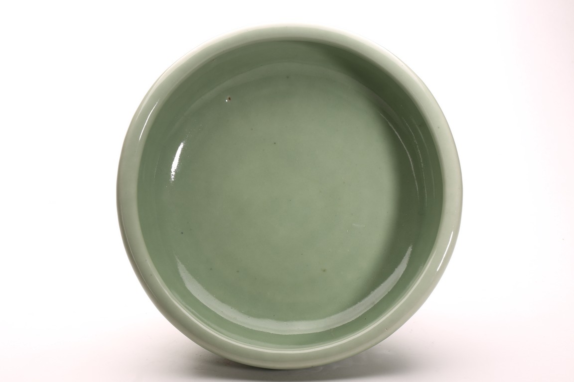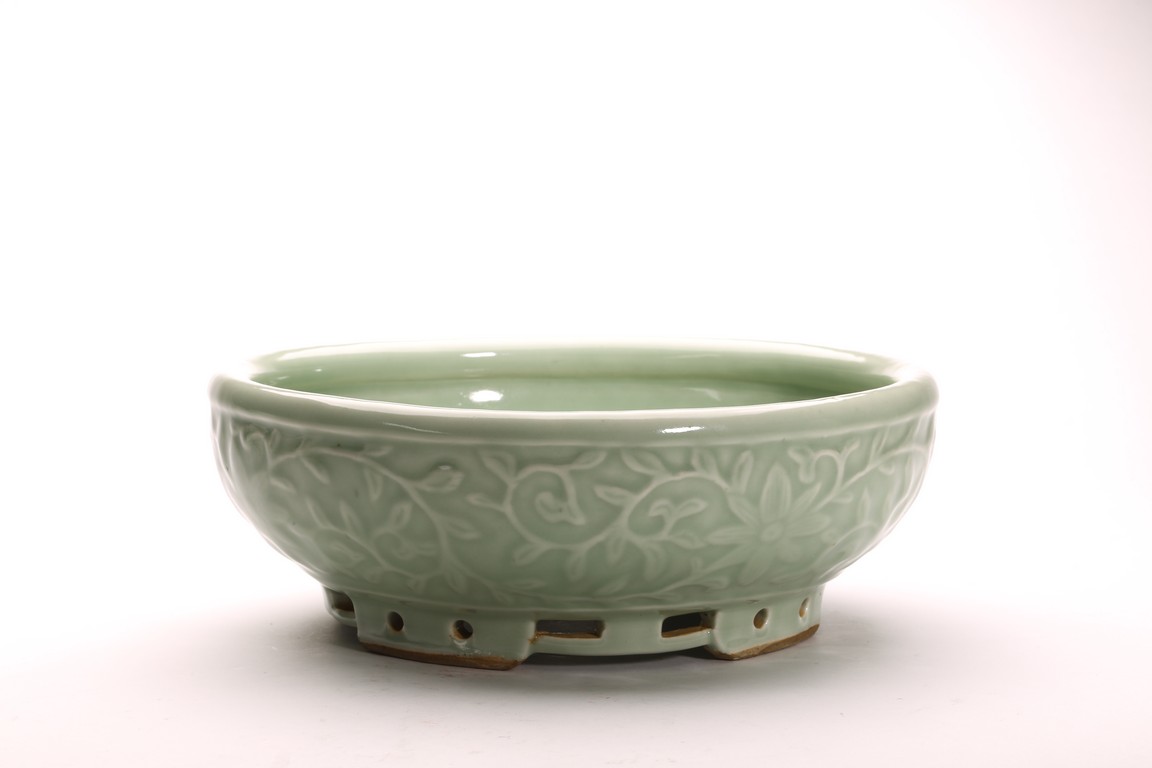豆青釉,青釉派生釉色之一,起源於宋代的龍泉窯。豆青和東青原屬一類,以後才各具特色。明以前微近黃色,至清純近綠色。其釉色為青中泛黃,釉面光澤比粉青、梅子青弱。此件筆洗造型規整,發色自然,刻花工藝細膩精湛,為不可多得精品。