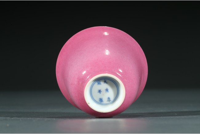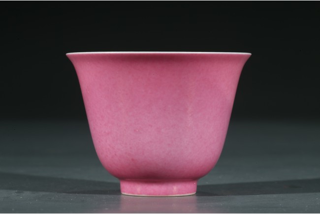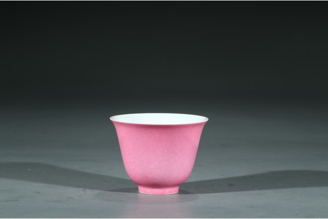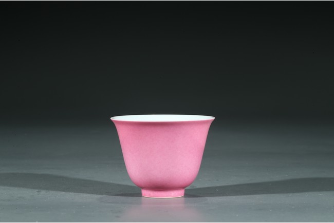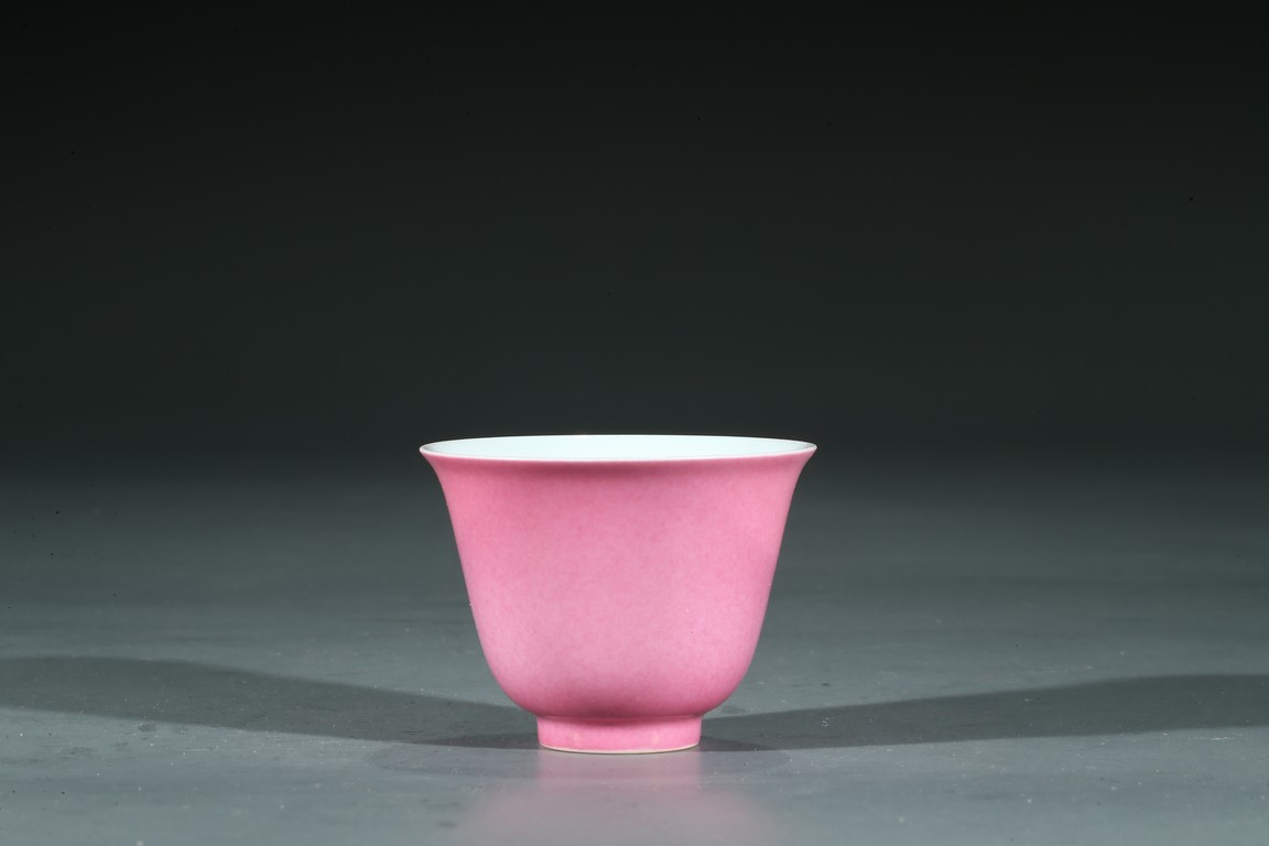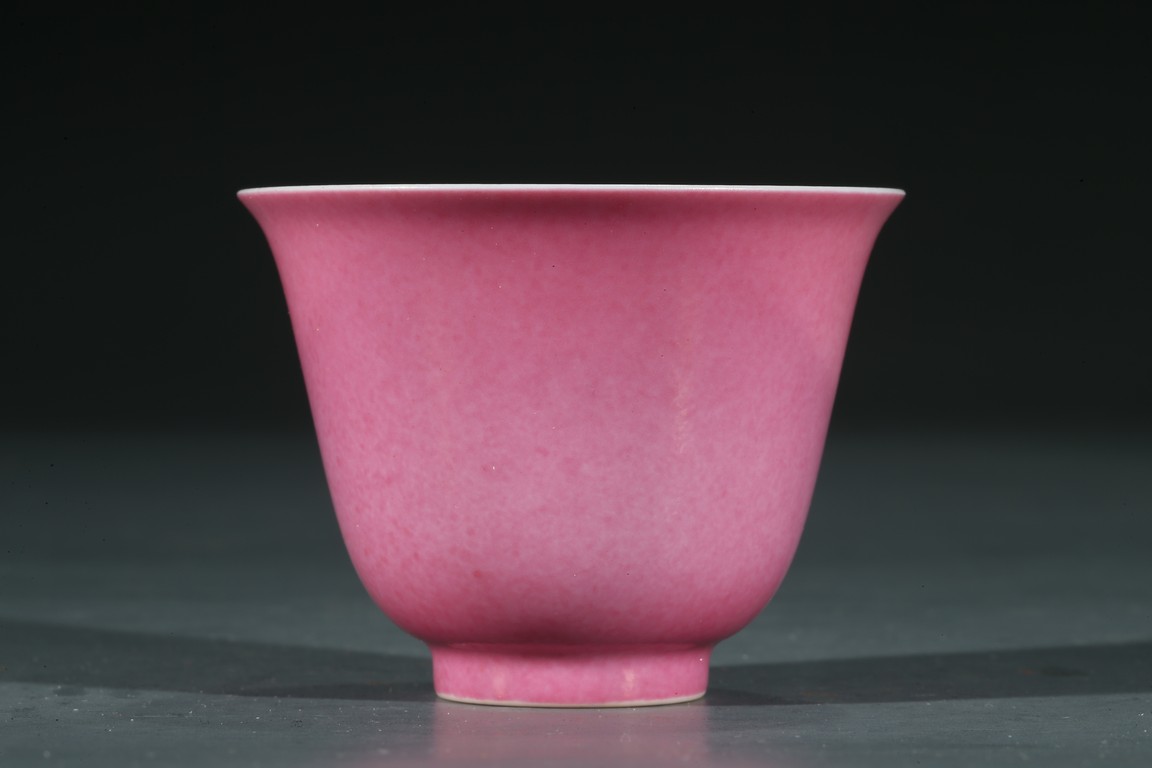 此杯口微撇,深弧腹,圈足。器型周正,小器大樣,外壁以吹釉法滿施胭脂紅釉,明淨艷麗,嬌嫩欲滴,內壁白釉瑩潤潔白,工藝精湛,彌足珍貴。