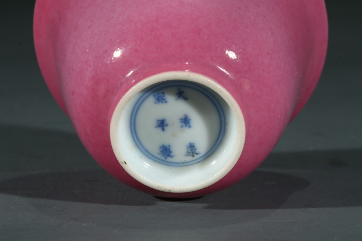 The deep rounded sides rising from a straight foot to a flaring mouth, the exterior applied with an pink glaze, the interior and the base left white, inscribed with a six-character Yongzheng mark within a double-circle.