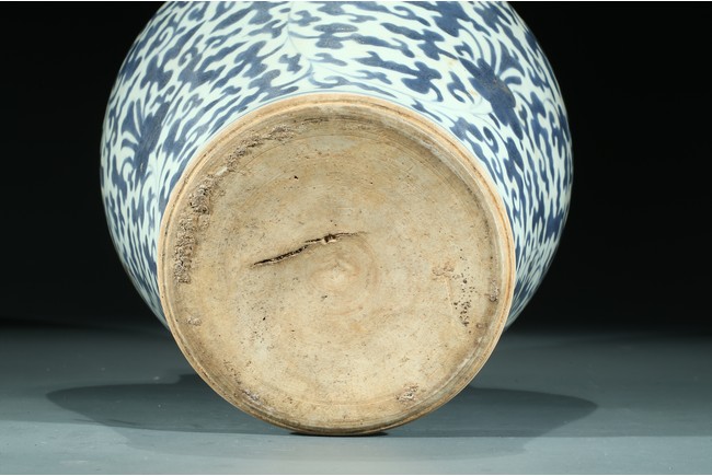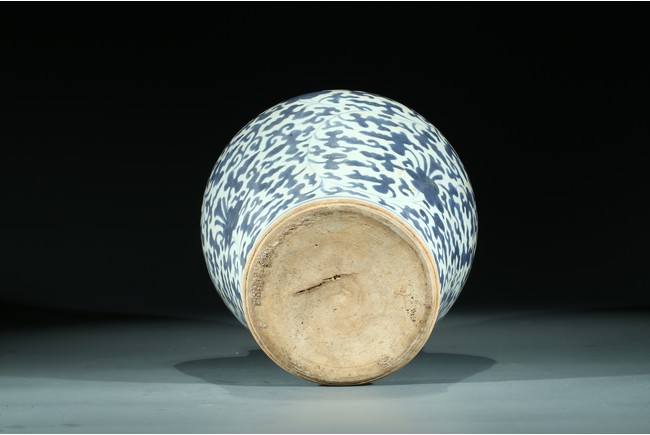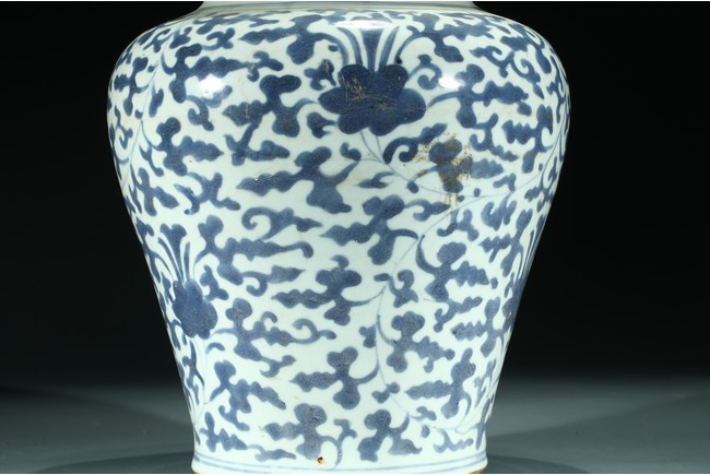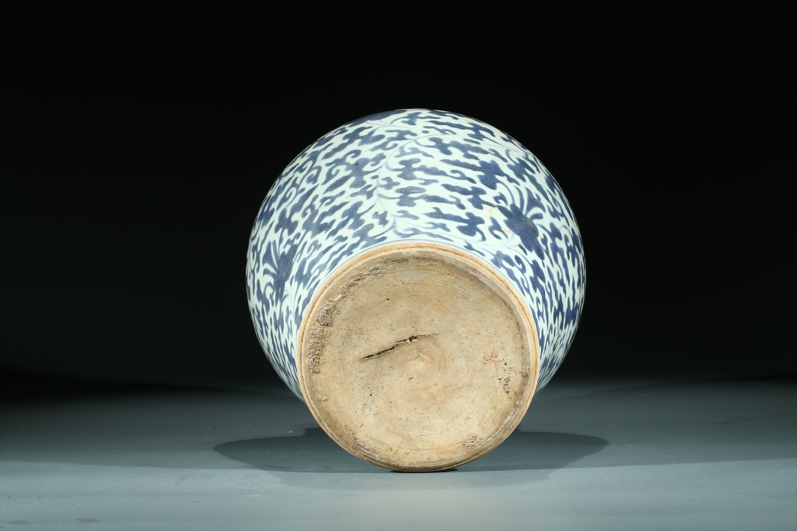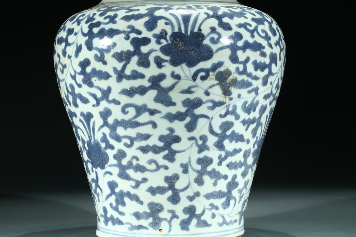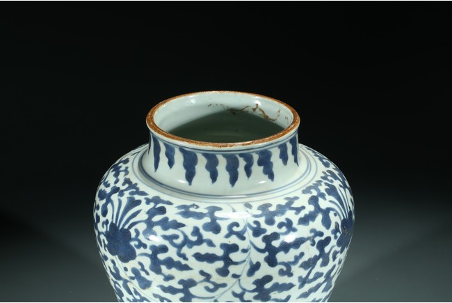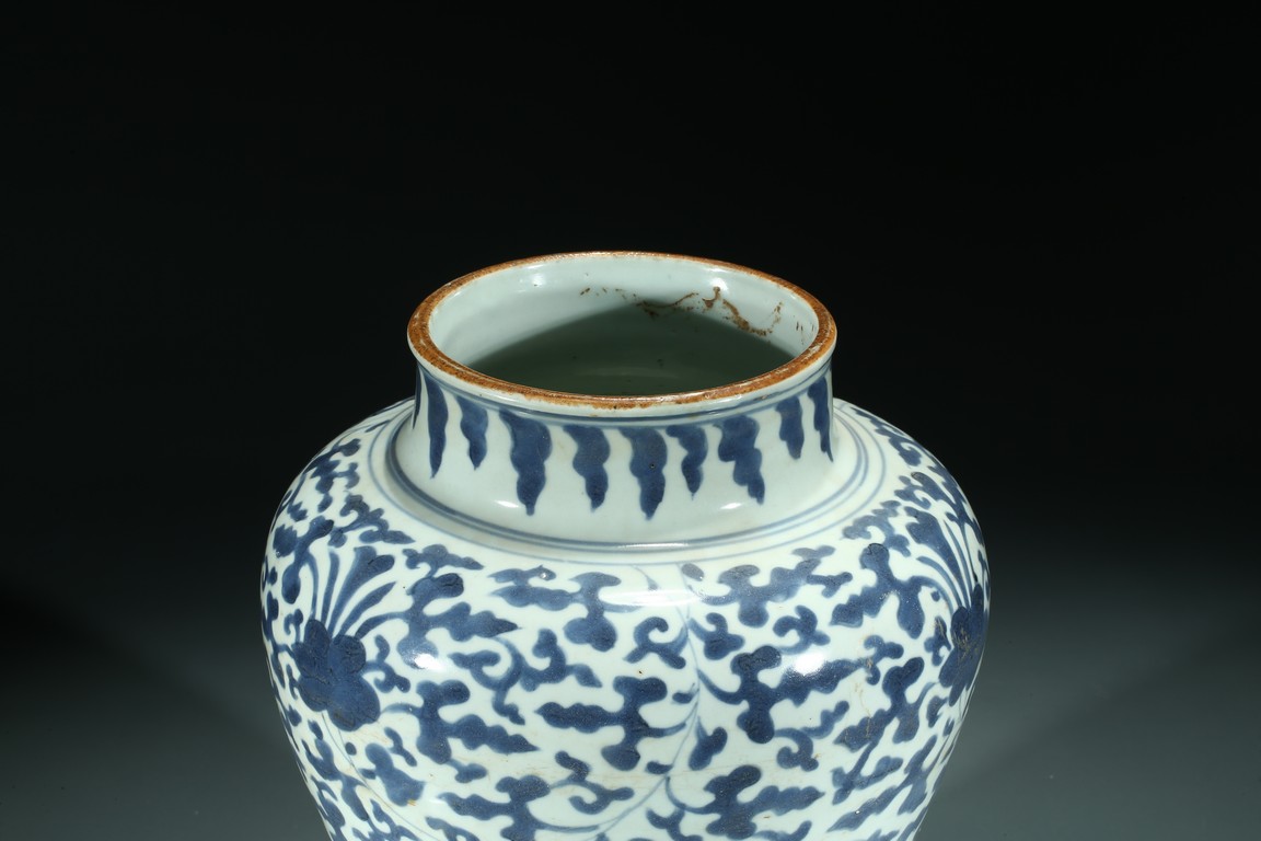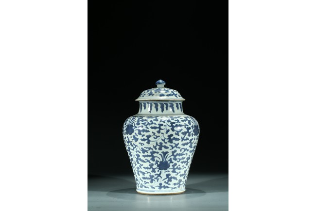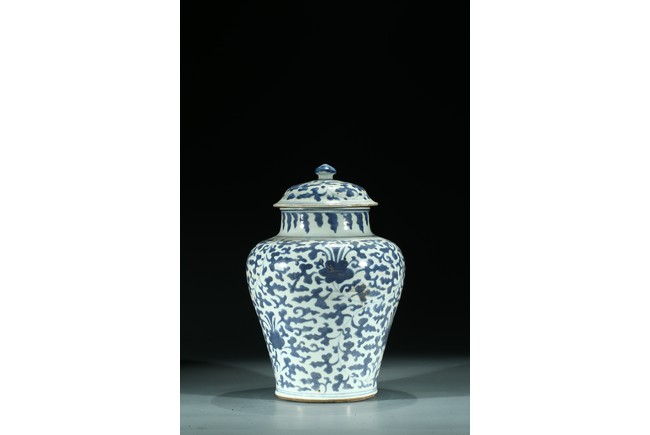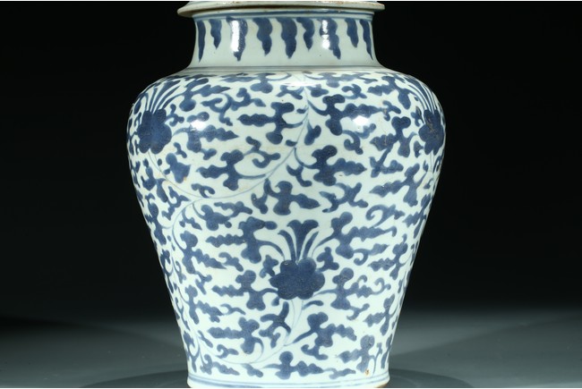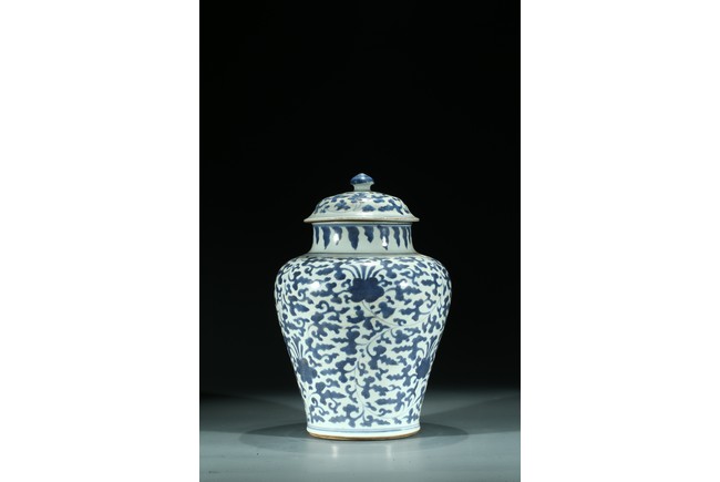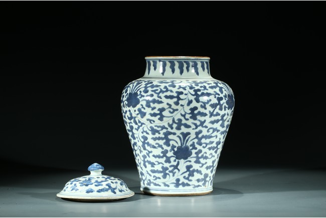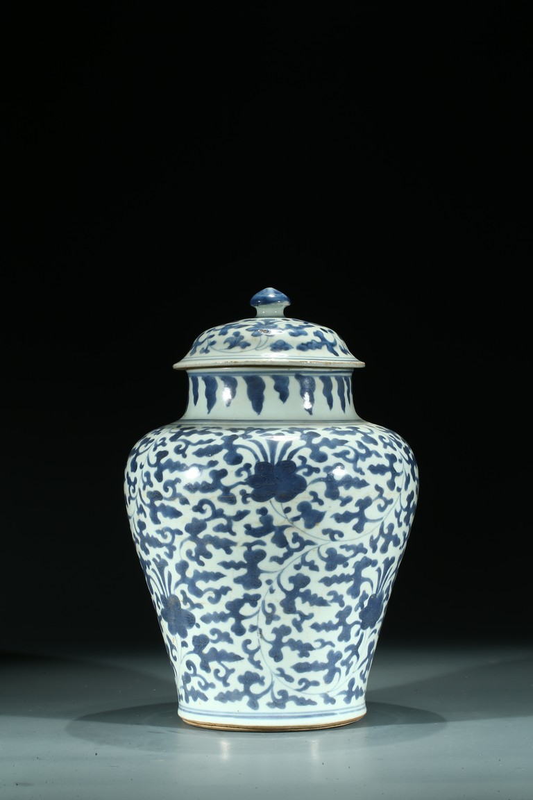 此罐直口,短頸微束,豐肩,鼓腹下斂,圈足,傘形蓋。器型飽滿,整體就像戴盔披甲的將軍,器型穩重挺拔,威猛剛健。通體以青花裝飾繪纏枝花卉紋,構圖繁密。胎體潔白,釉面光潤,白中微微泛青。紋飾生動活潑,充滿生機。青花藍中泛灰,有水墨畫的暈染效果。器型穩重,造型古樸,保存完好,值得收藏。