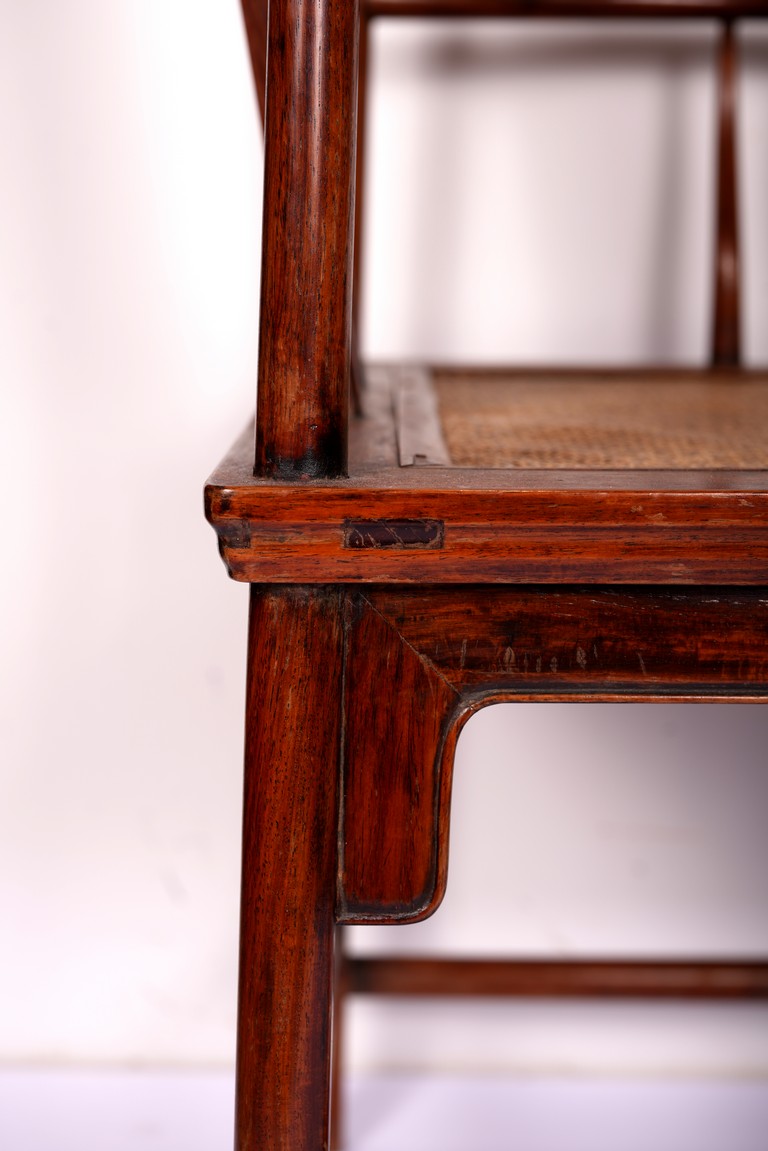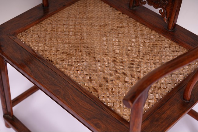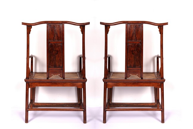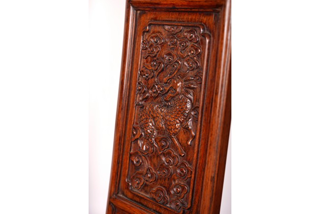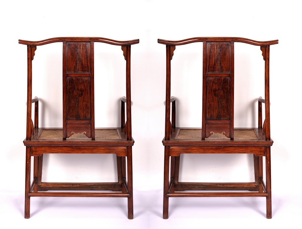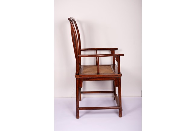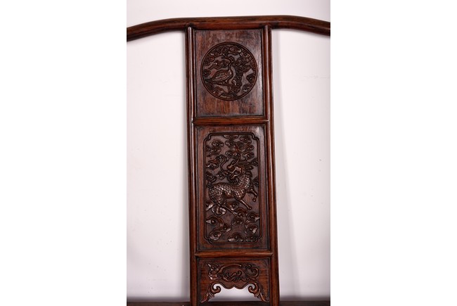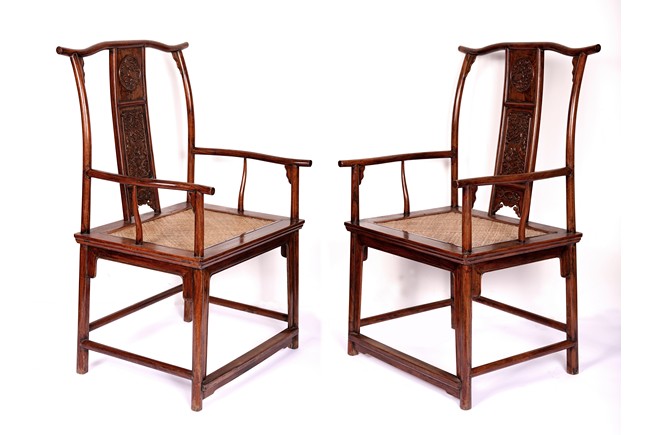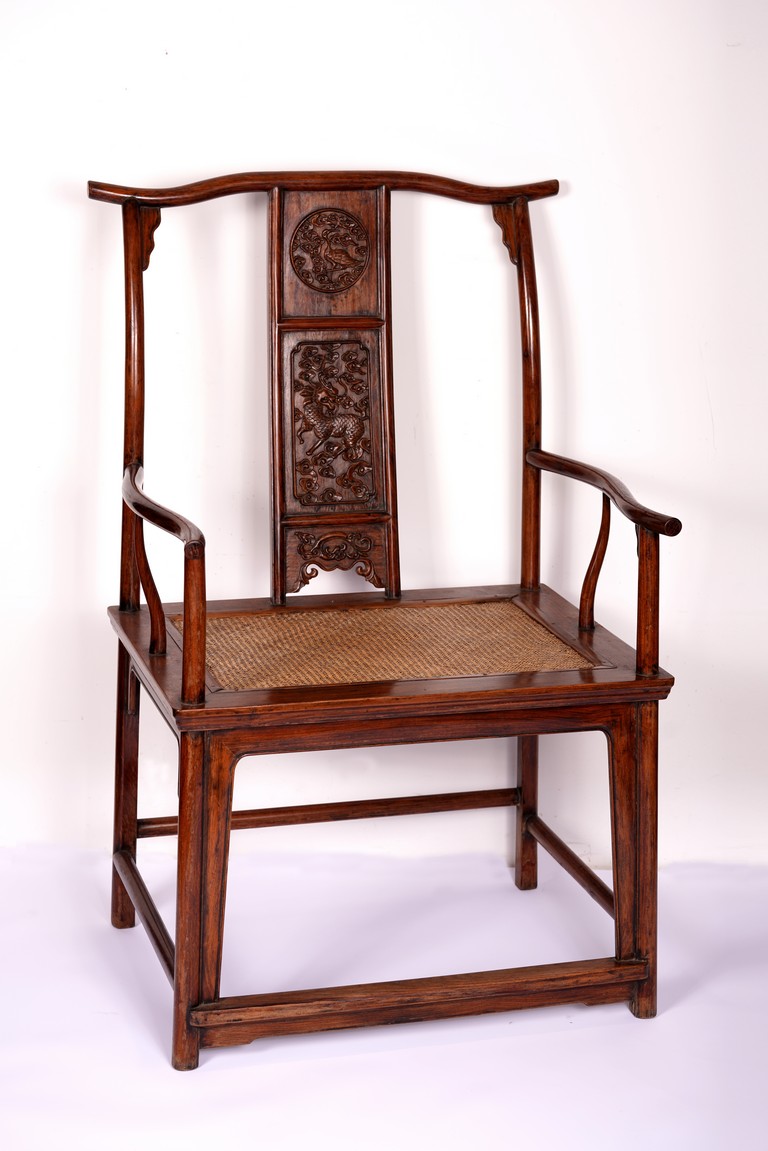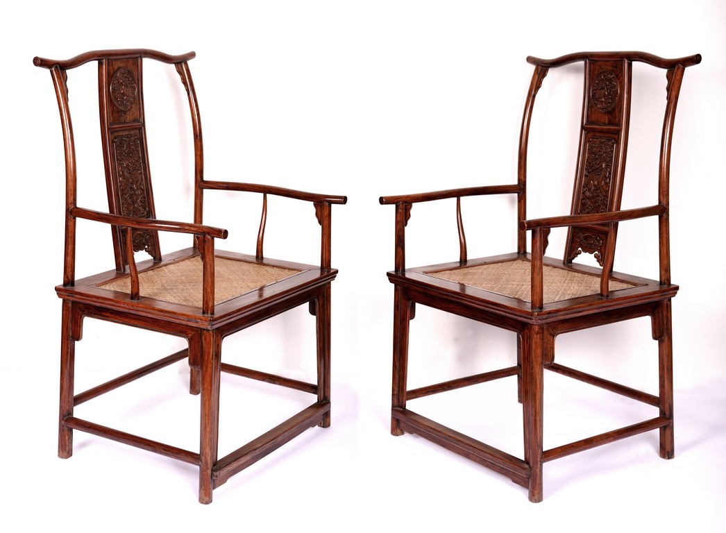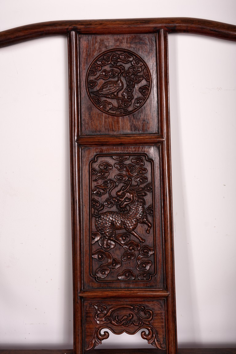 Qing Dynasty period. Each with crested top rail supported on two round backwards-curving cornerposts and a C-shaped backsplat, carved with a crane in a round medallion above, the rectangular mid-section carved with a chilong amidst clouds, and with a chilong carved at the base above an arched aperture with beaded edges, the sinuous arms resting on two spindles, and plain frontposts with small aprons, the soft mat seat set within an 'ice-plate' edge frame, all supported on legs of rounded square section joined by plain beaded aprons and a footrail.