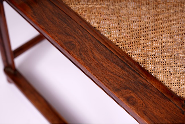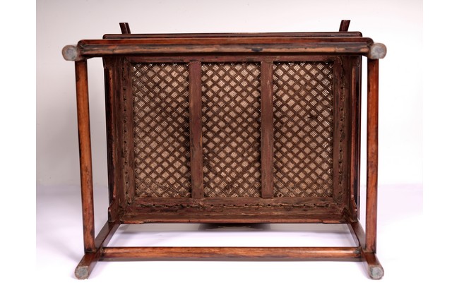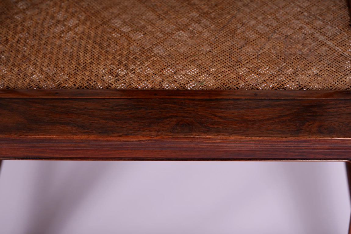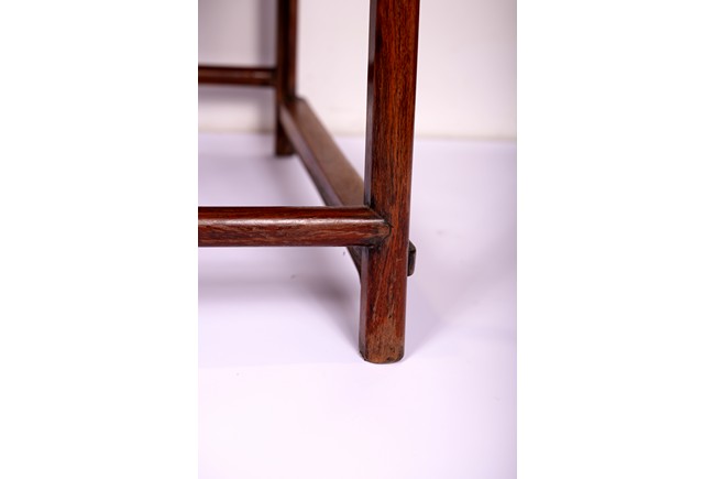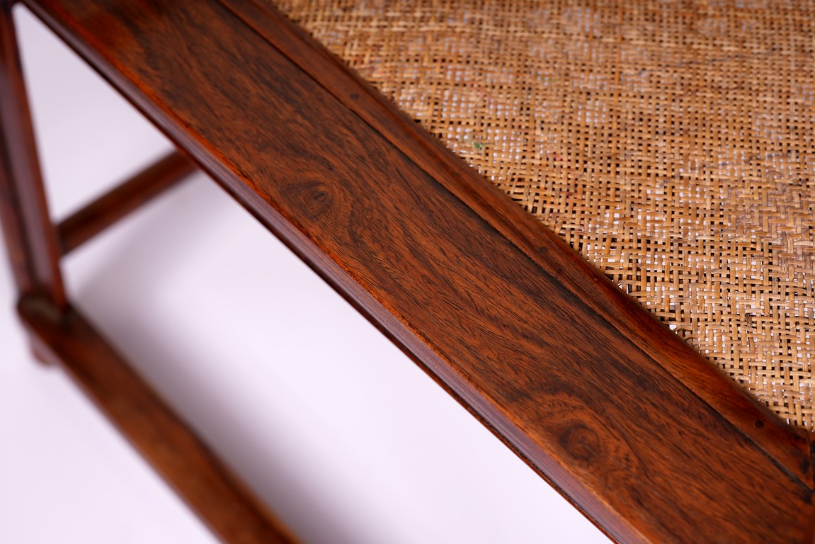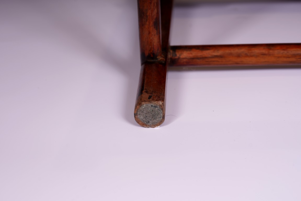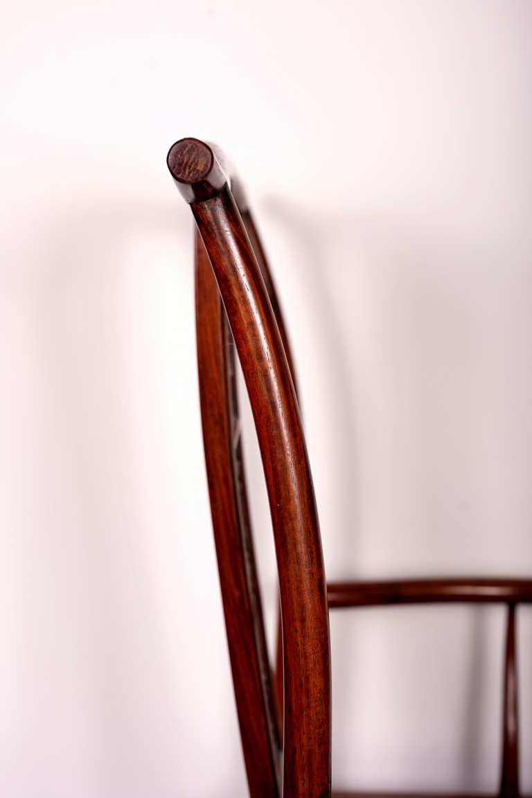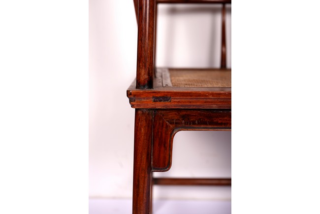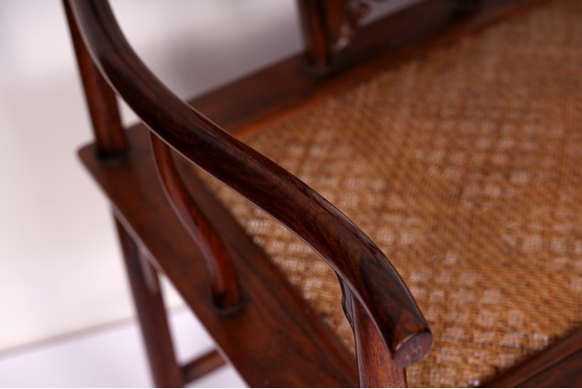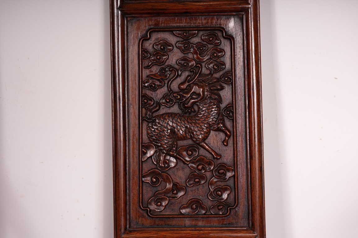 Qing Dynasty period. Each with crested top rail supported on two round backwards-curving cornerposts and a C-shaped backsplat, carved with a crane in a round medallion above, the rectangular mid-section carved with a chilong amidst clouds, and with a chilong carved at the base above an arched aperture with beaded edges, the sinuous arms resting on two spindles, and plain frontposts with small aprons, the soft mat seat set within an 'ice-plate' edge frame, all supported on legs of rounded square section joined by plain beaded aprons and a footrail.