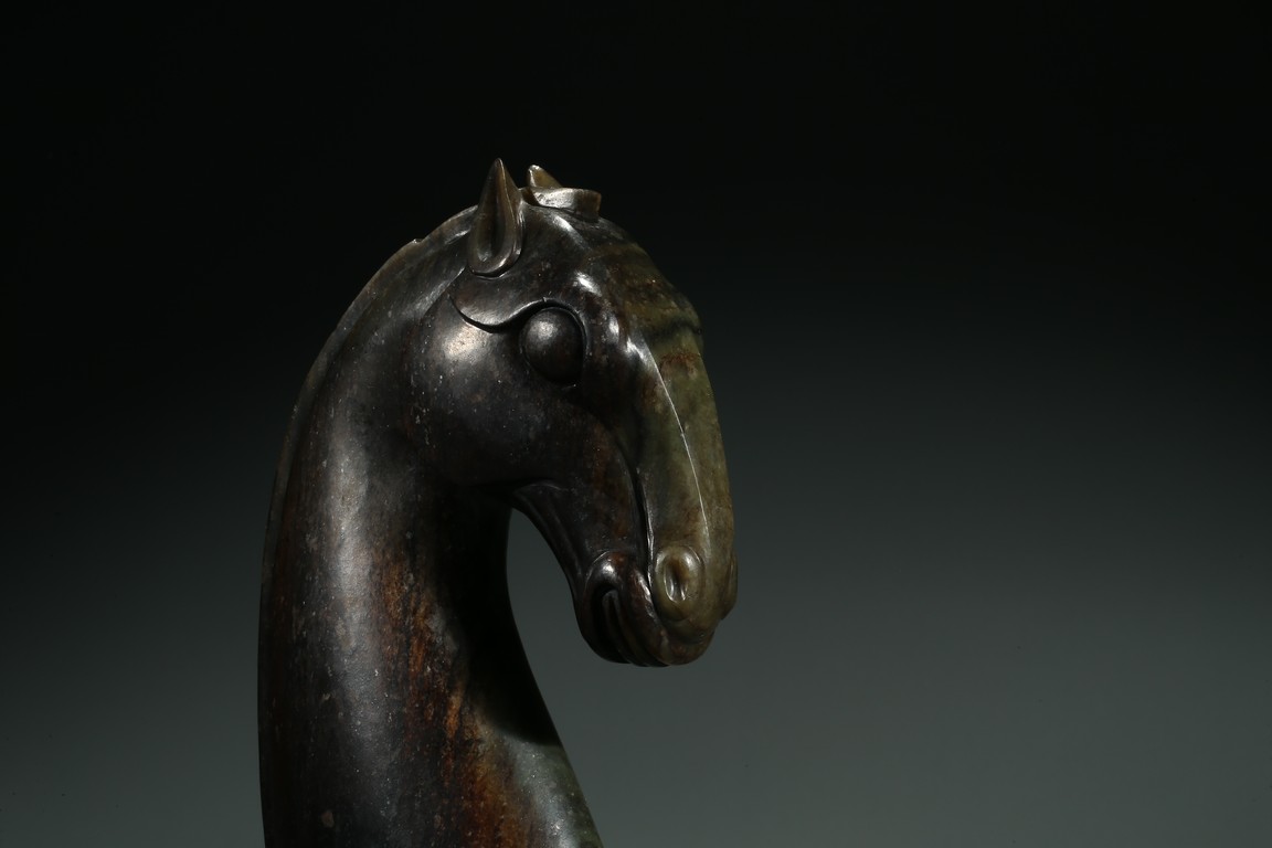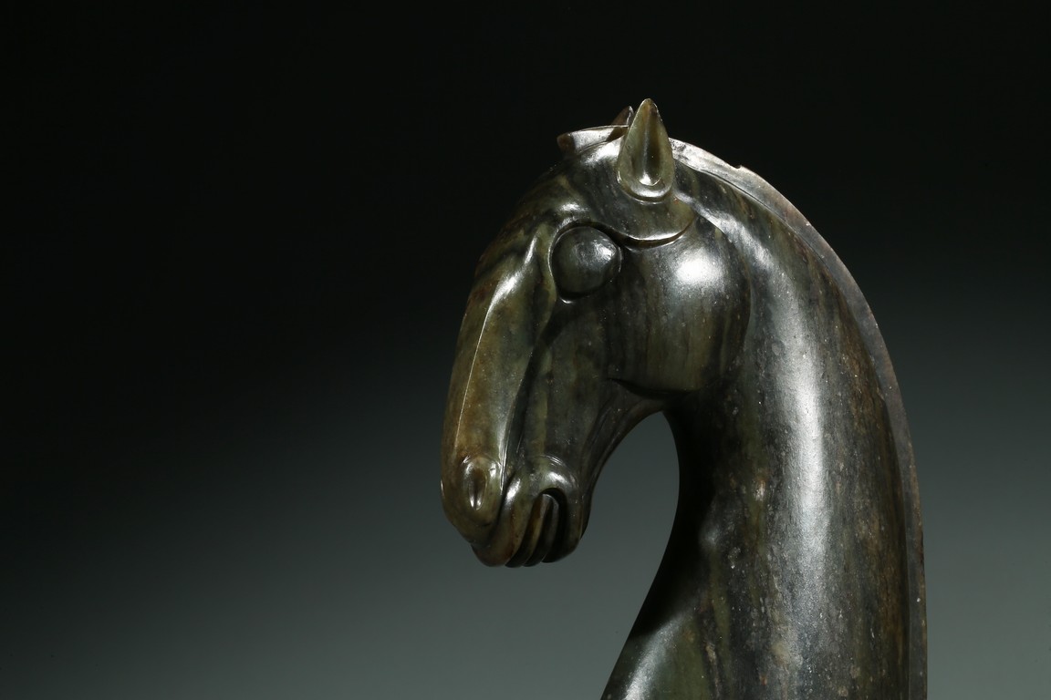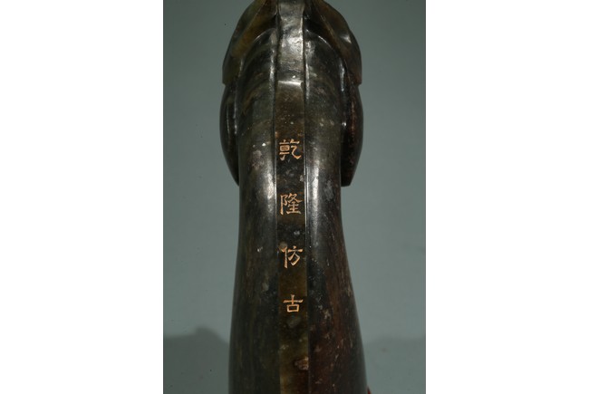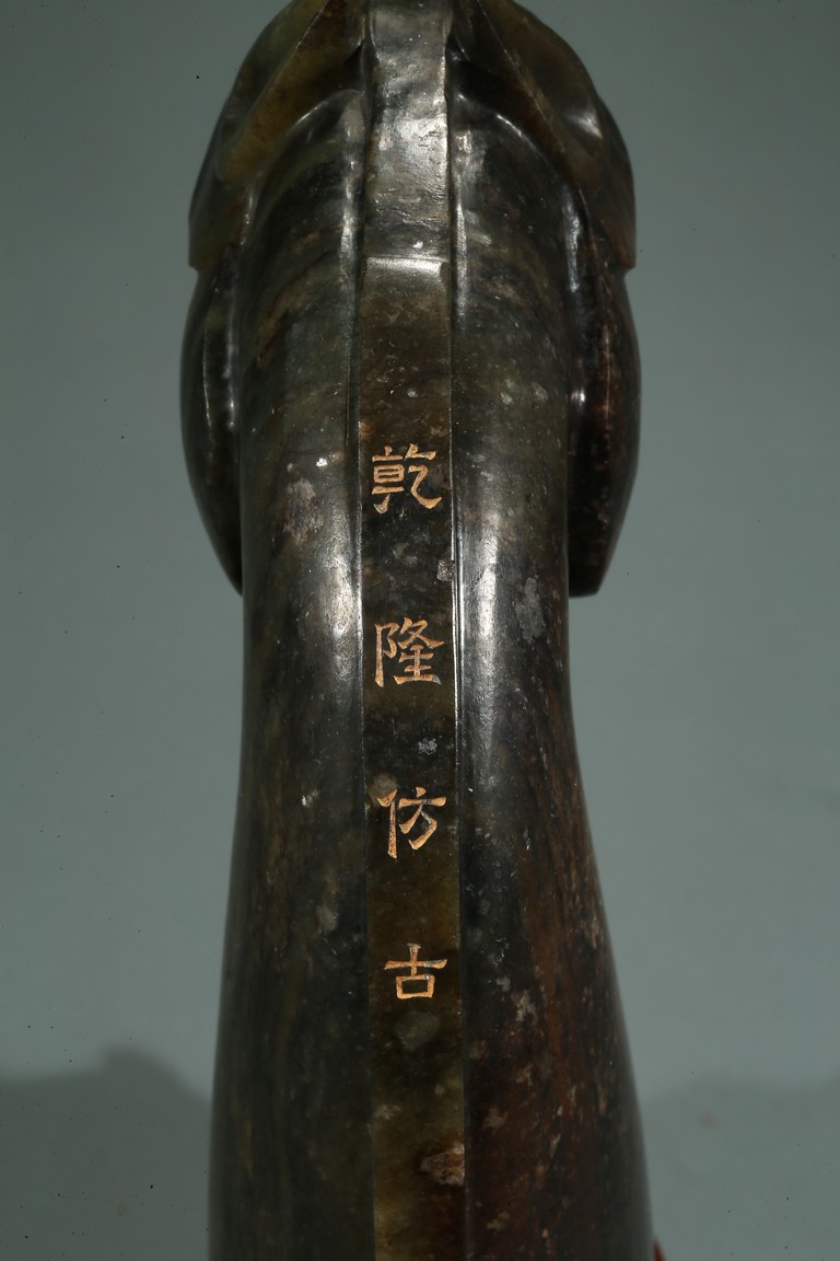 Carved realistically in the form of horse head, the back mane inscribed with four character mark Qianlong Fangu, fitted on wood stand.