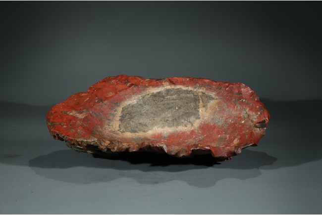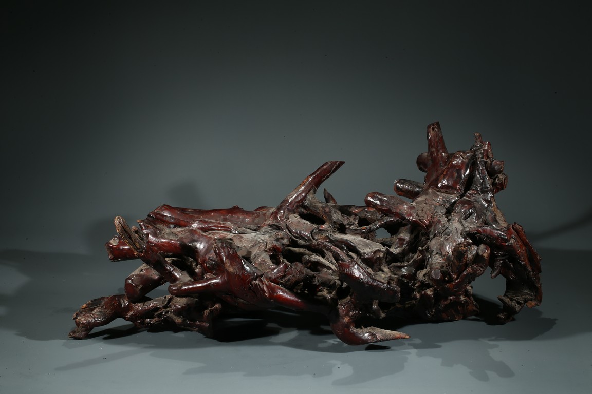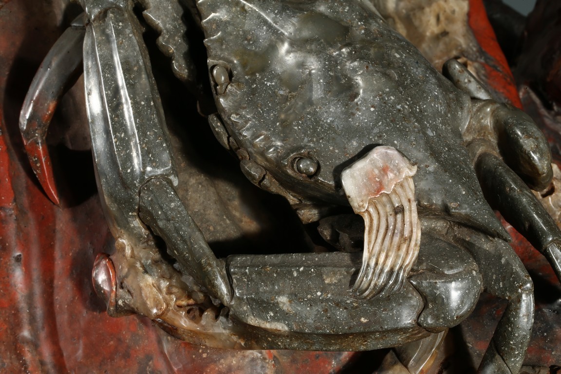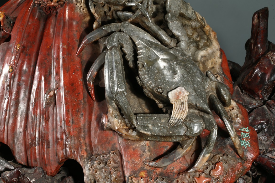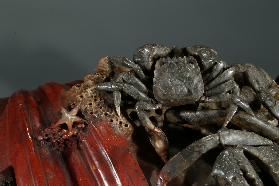 20th Century. Realistically carved to depict two crabs and sea horses on a spherical shell, skillfully utilizing the red and grey areas of the stone, all supported on a separated carved shoushan stone 'branches' stand. The carving bears an incised signature of the artist 'Zhang Guo Sen'.